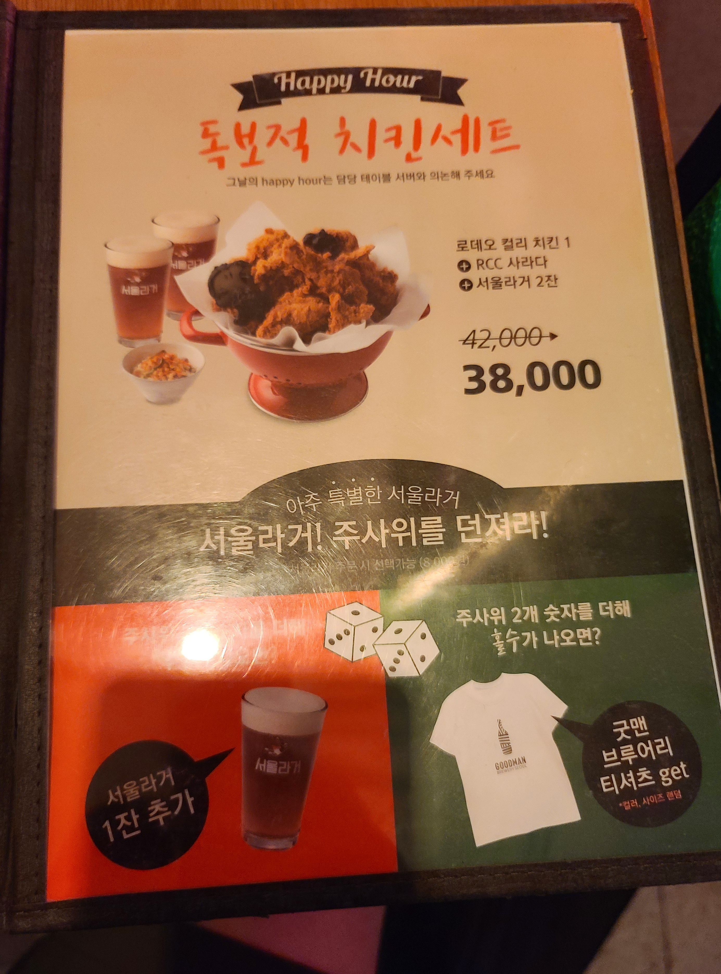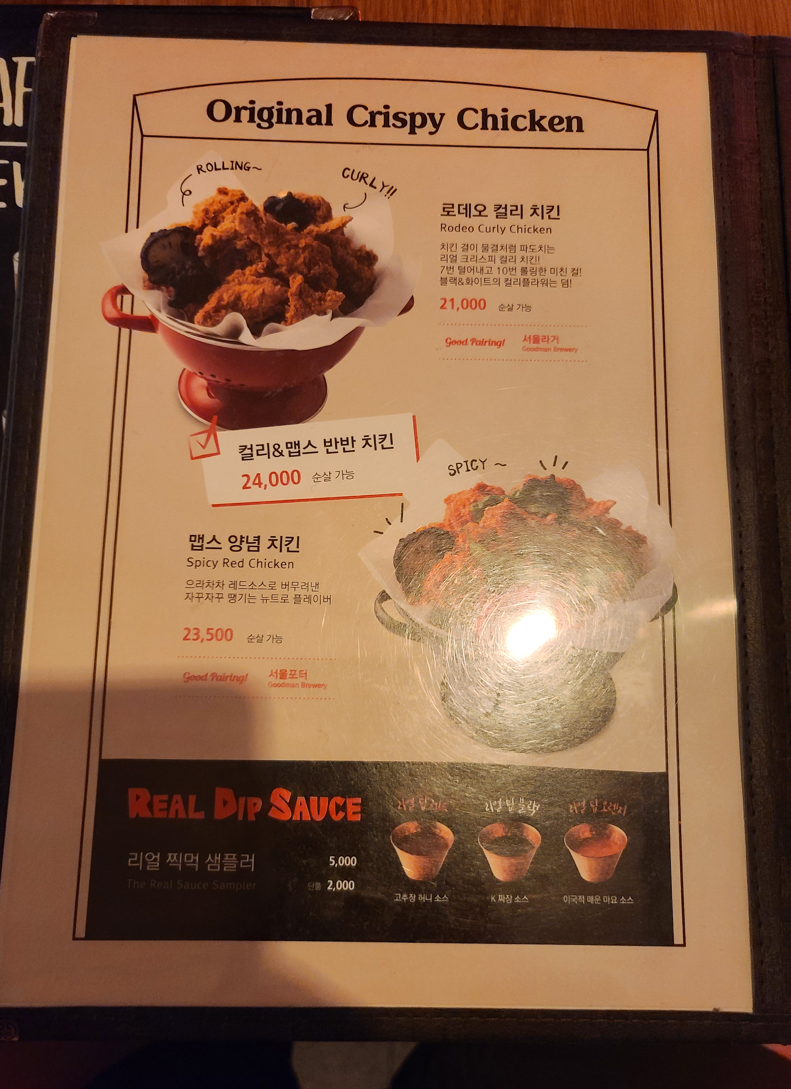강남구 신사동 로켓크리스피치킨 매장 내부의 모습입니다. 테이블 별로 거리를 널찍하게 배치해 불편하지 않았습니다. 밝은 조명의 치킨집보다는 술집(PUB)에 가까운 가게였습니다. 우선 메뉴를 함께 살펴보실까요?