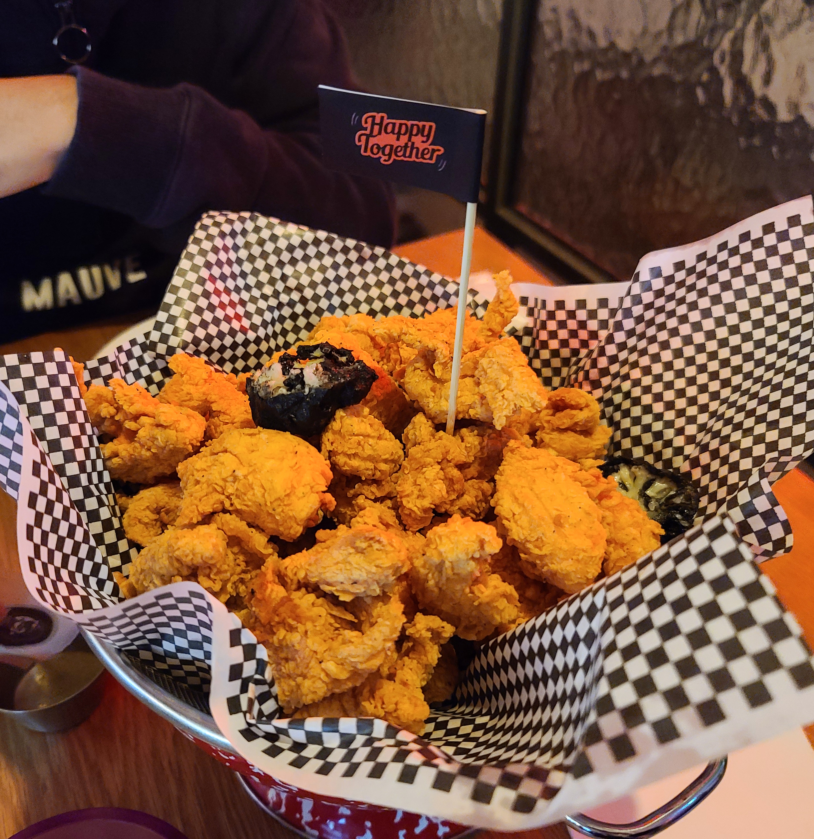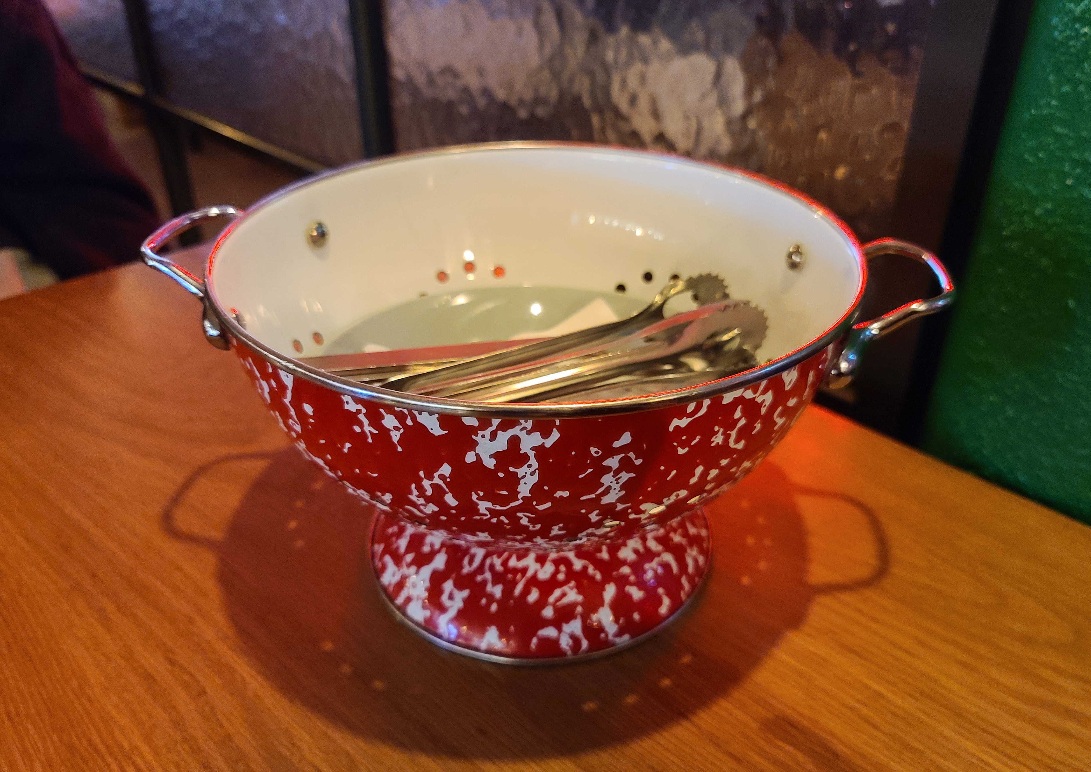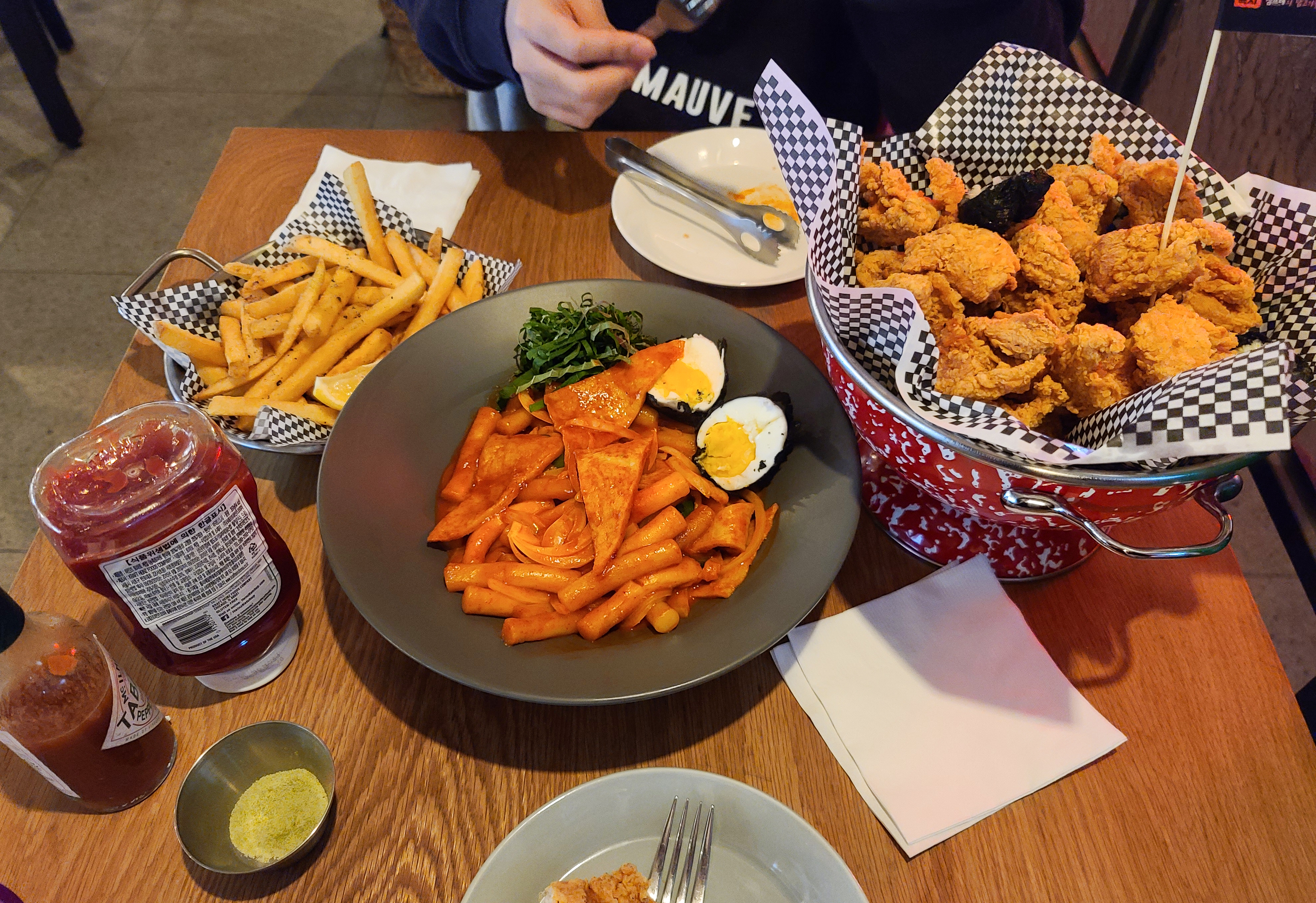 자리에 있는 콜렌더(Colander)에는 집게, 포크, 냅킨 등 식기류가 들어있었고, 이 콜렌더는 치킨을 담는 그릇으로도 활용되었습니다. 앞접시와 집게, 포크를 꺼낸 뒤 메뉴가 나오기를 기다리니, 곧 주문한 치킨과 떡볶이, 감자튀김이 나왔습니다.