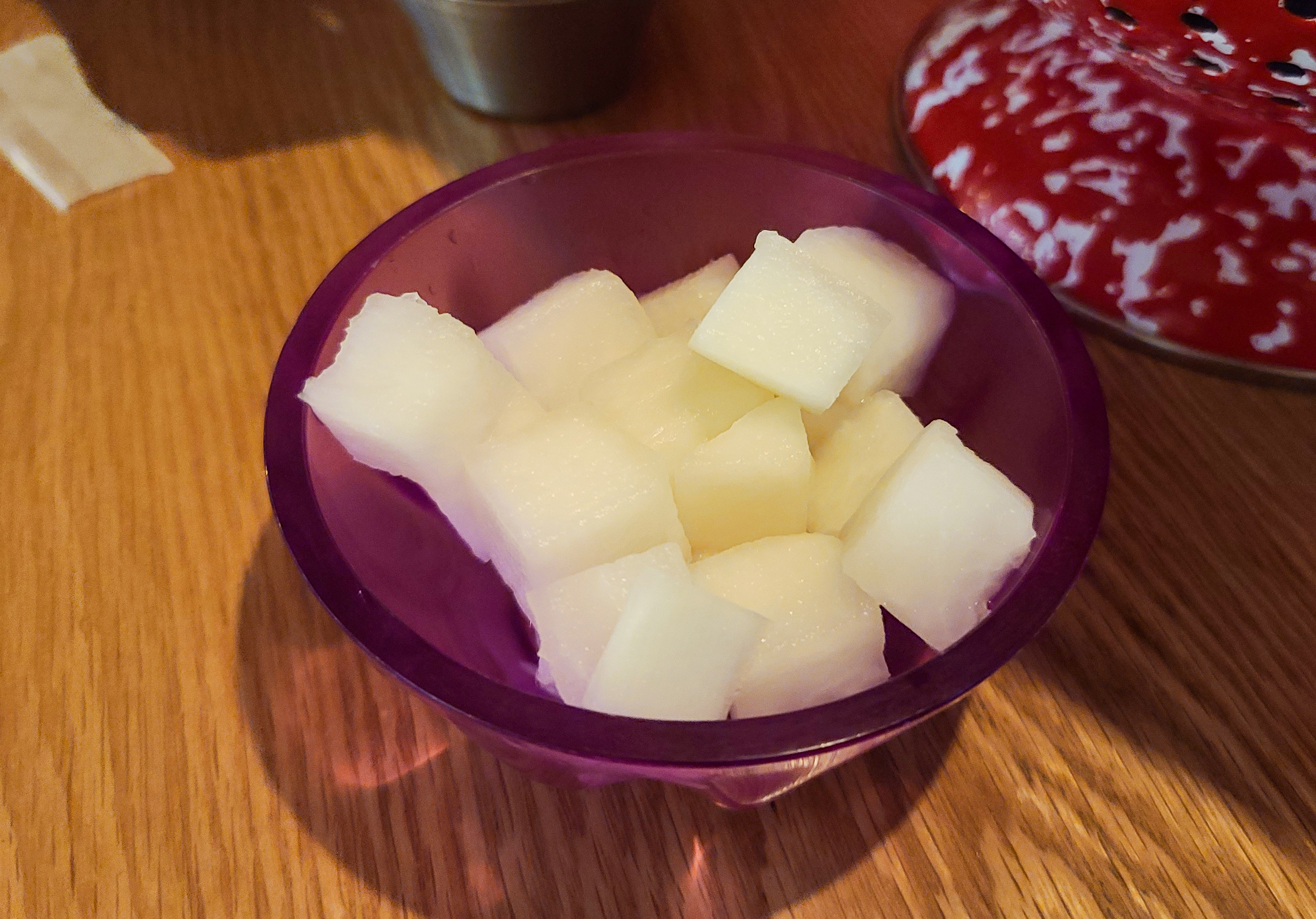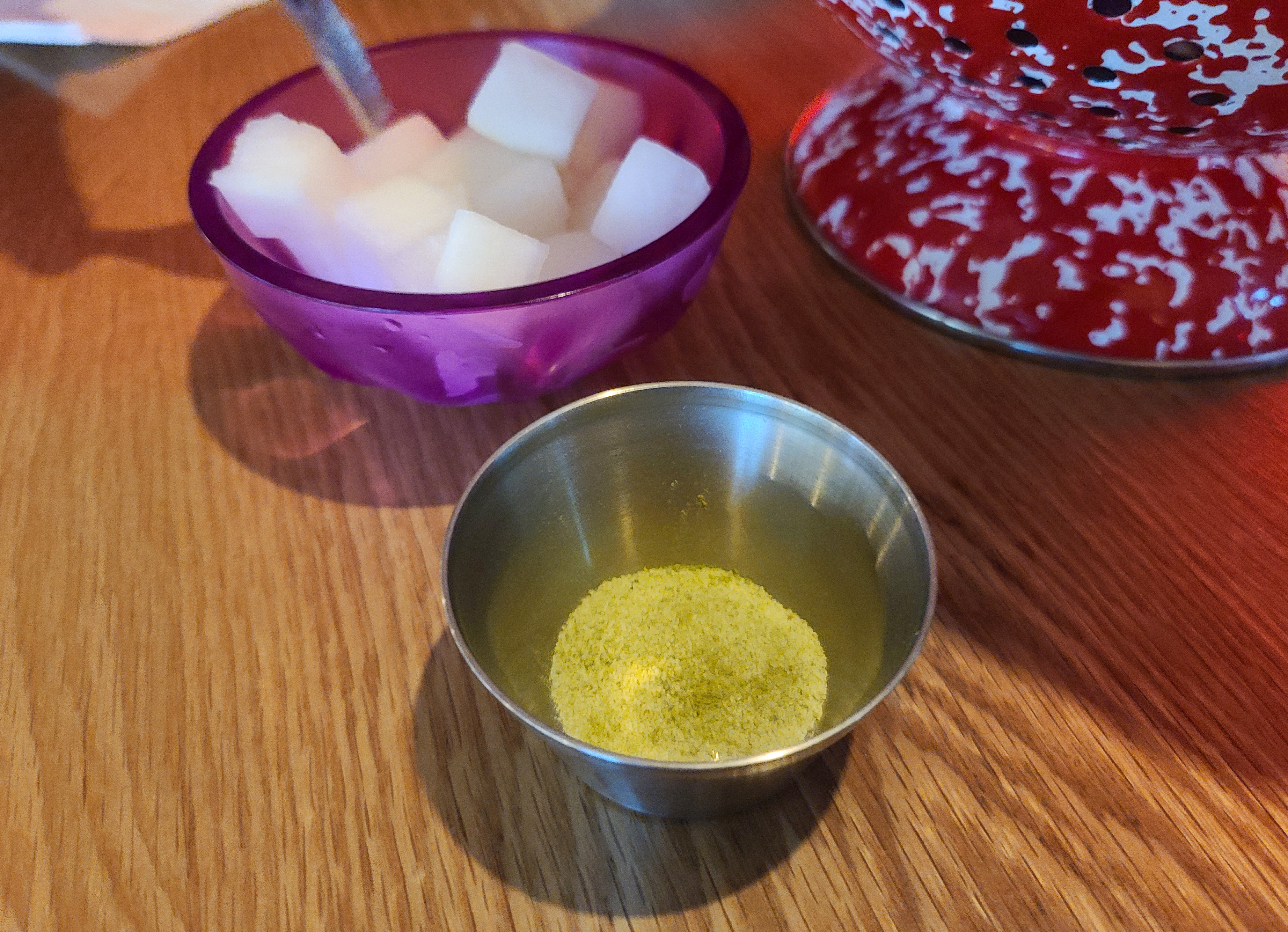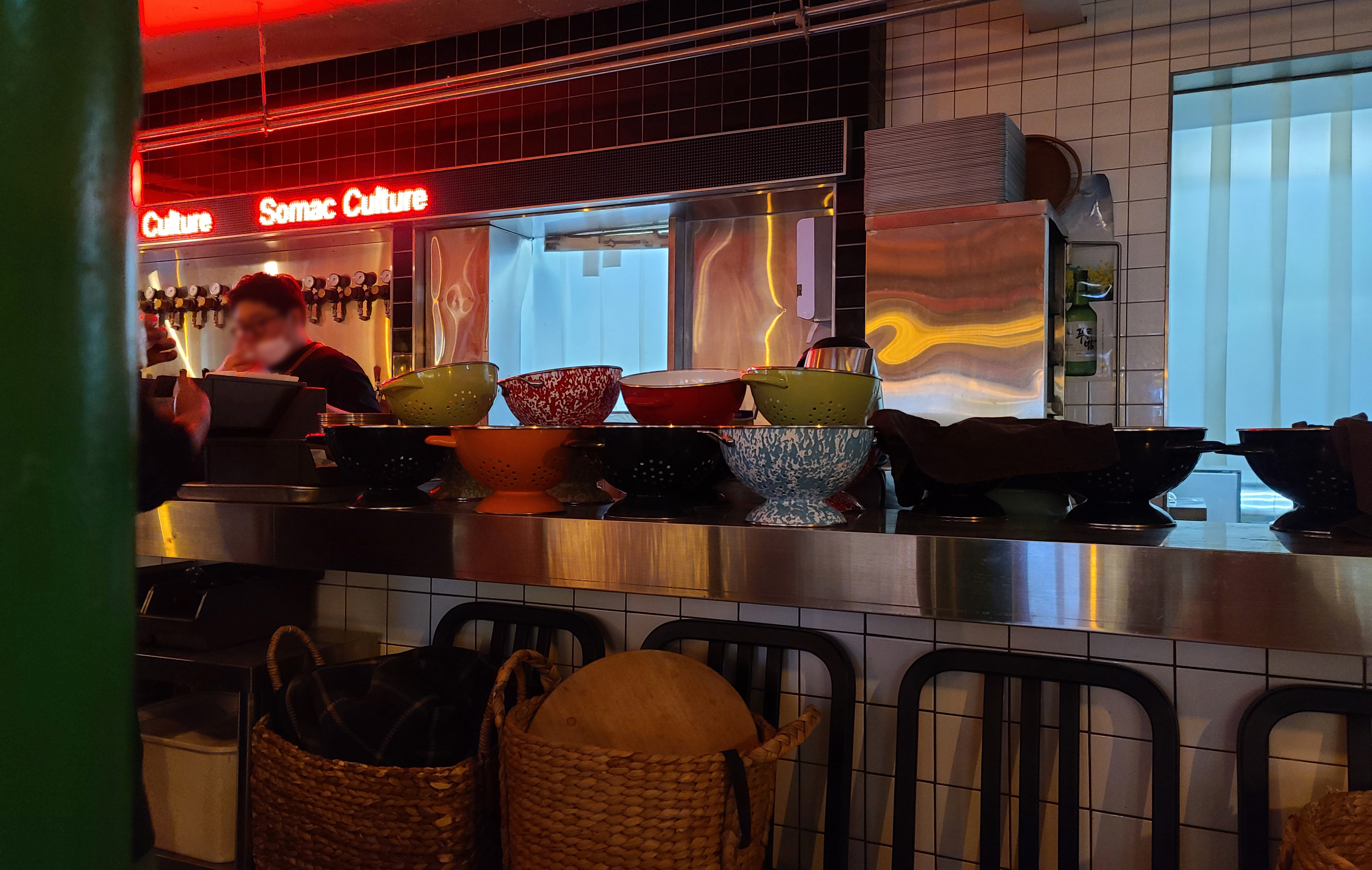 자리에 있는 콜렌더(Colander)에는 집게, 포크, 냅킨 등 식기류가 들어있었고, 이 콜렌더는 치킨을 담는 그릇으로도 활용되었습니다. 앞접시와 집게, 포크를 꺼낸 뒤 메뉴가 나오기를 기다리니, 곧 주문한 치킨과 떡볶이, 감자튀김이 나왔습니다.