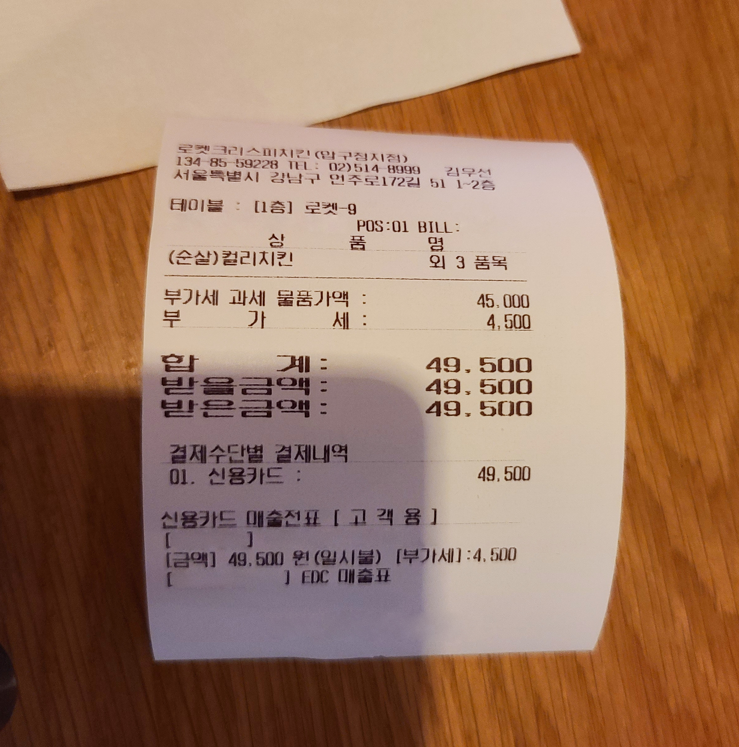 제가 자가용도 가지고 가고, 술을 잘 못 마셔서 음료수로 대체해서 마셨고요. 치킨과 떡볶이, 감자튀김, 음료까지 포함하여 49,500원 이 나왔습니다. 분위기도 괜찮았고 메뉴들도 맛있었습니다. 나중에 술 잘 마시는 친구와 가면 맥주 정도는 주문할 수도 있겠네요~~ㅎㅎ