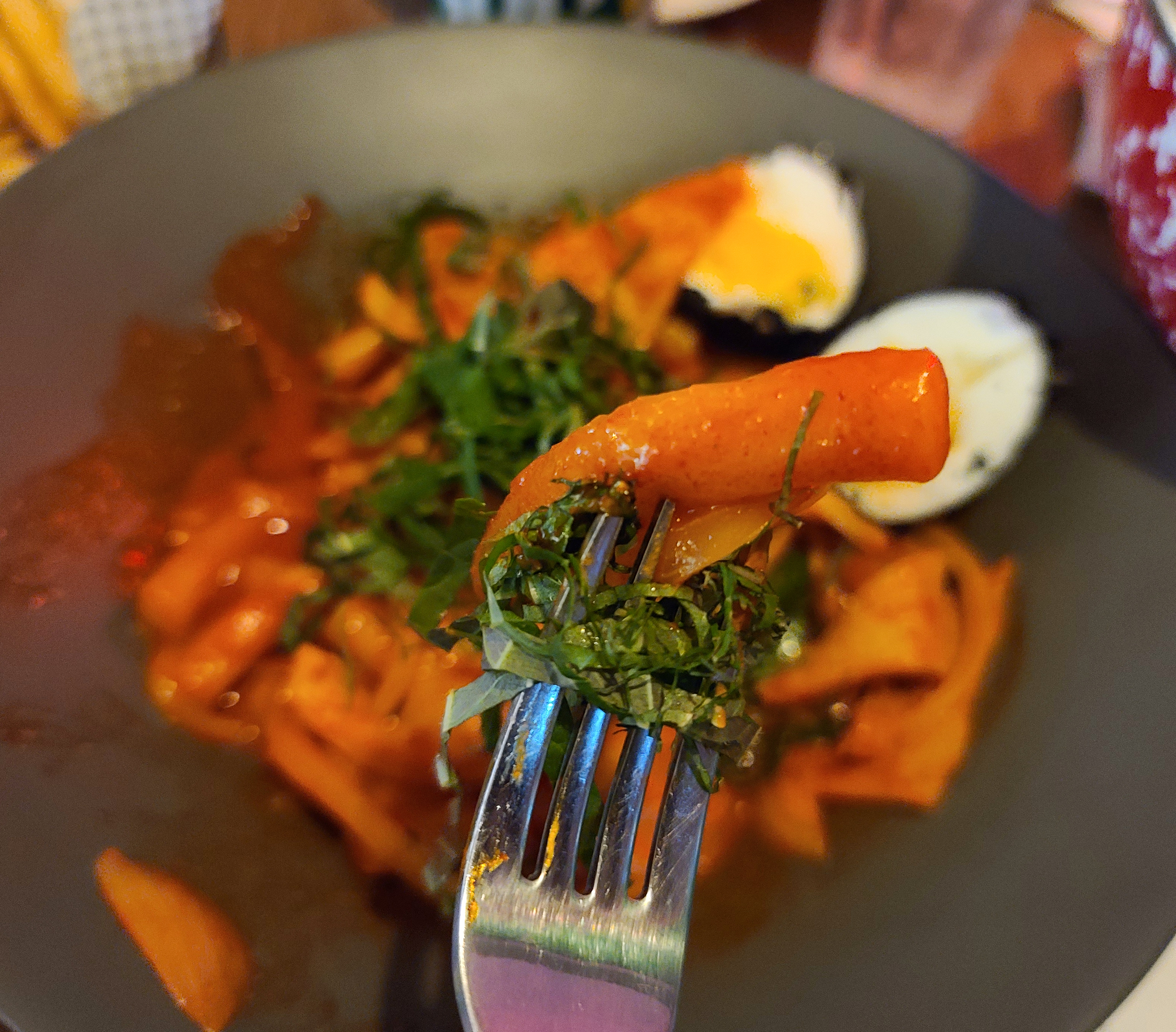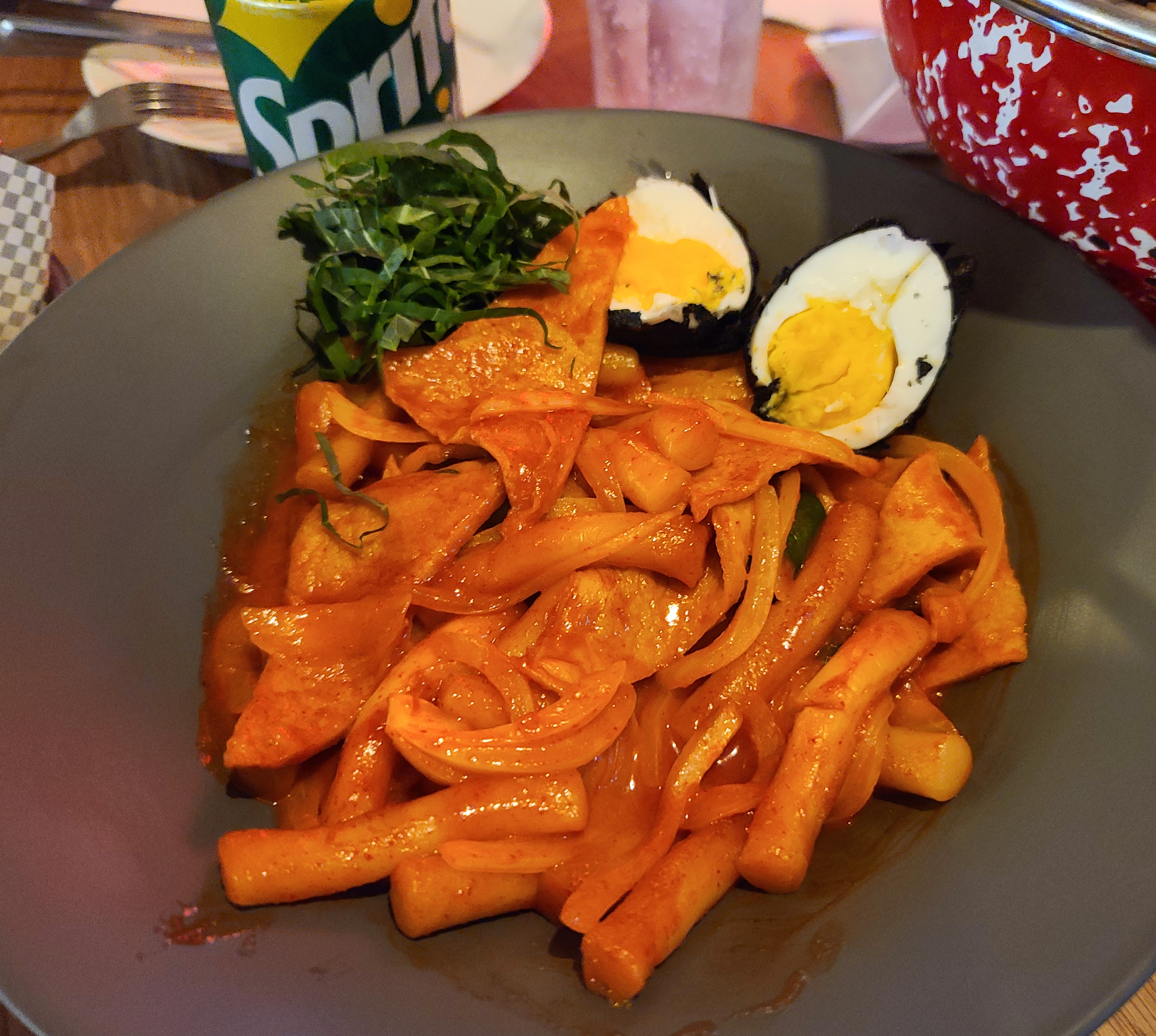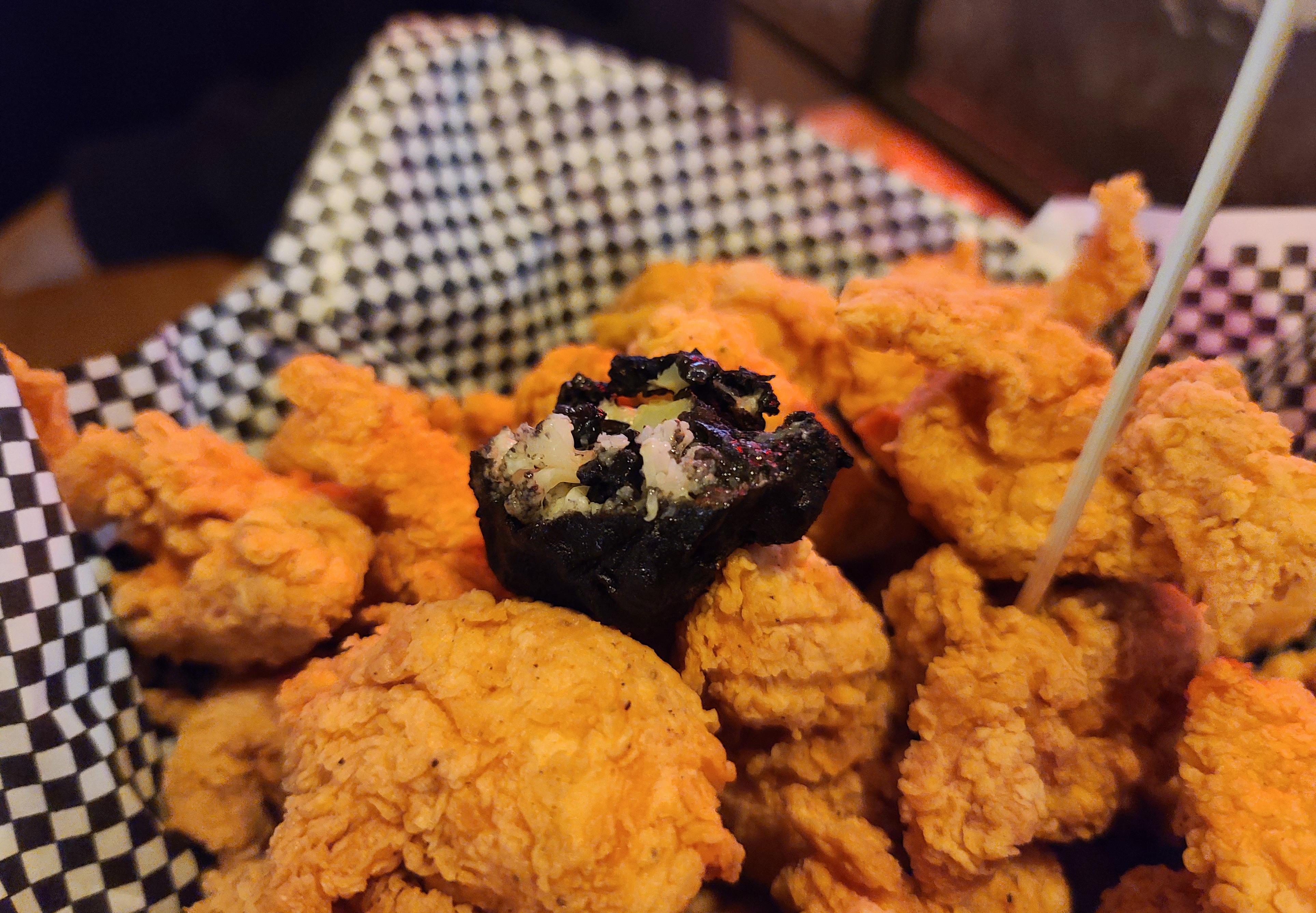 압구정 로켓 크리스피 치킨 '에그 블랙 떡볶이'는 매콤한 떡볶이에 깻잎이 고명으로 올라가며 로데오컬리치킨의 컬리플라워처럼 검은색 튀김옷을 입은 계란이 들어간 메뉴였습니다. 떡볶이도 기대는 안 했는데, 생각보다 입맛에 맞았습니다.