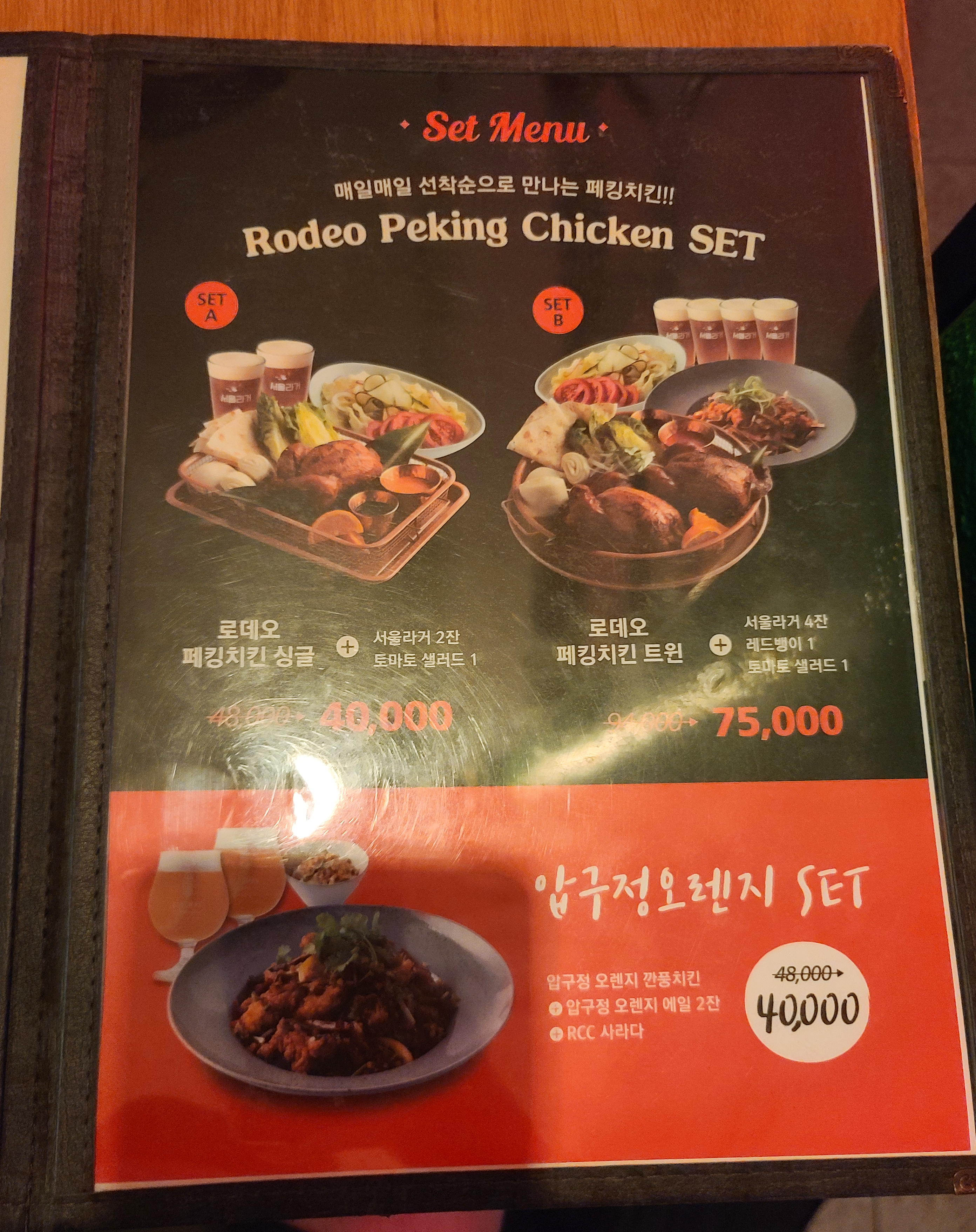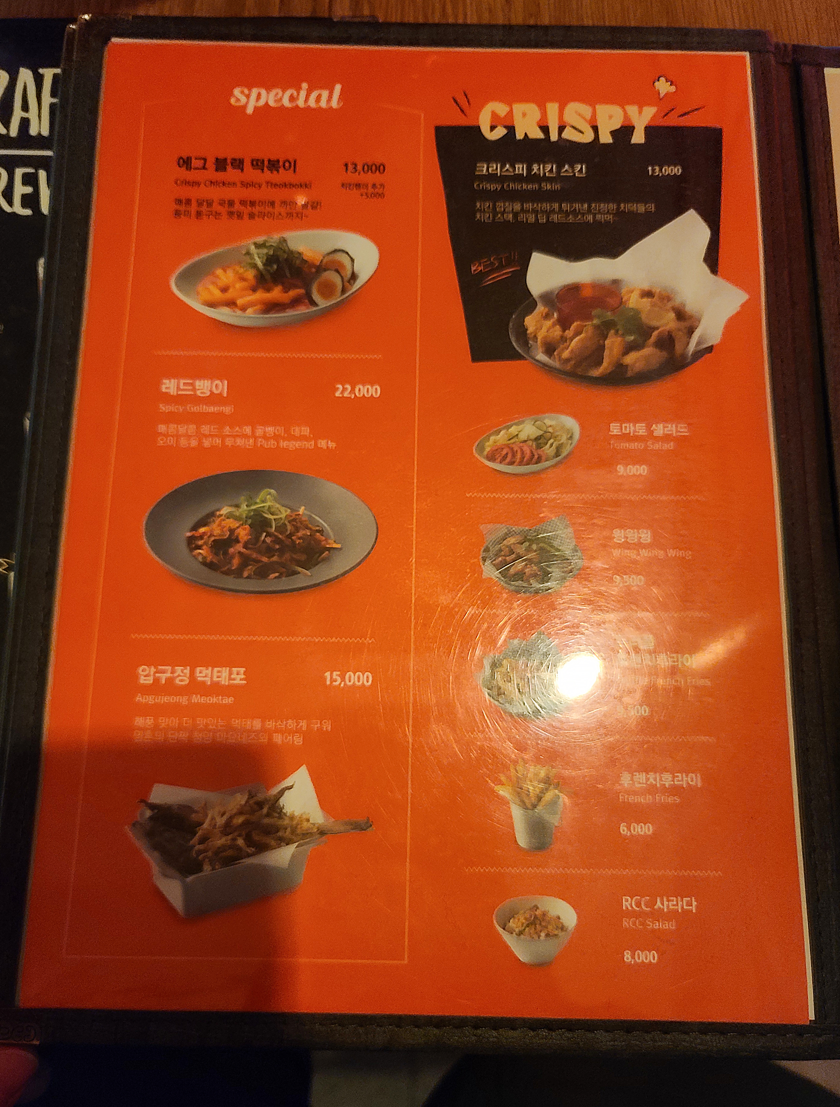 로켓 크리스피 치킨의 메뉴는 다음과 같습니다. 로데오페킹치킨, 압구정오렌지깐풍치킨, 오리엔탈치킨샐러드, 로데오컬리치킨, 맵스양념치킨, 세트메뉴, 에그블랙떡볶이, 레드뱅이, 압구정먹태포, 크리스피치킨스킨, 토마토샐러드, 윙윙윙, 트러플후렌치후라이, 후렌치후라이, RCC사라다 등 이 있었습니다. 저는 로데오컬리치킨, 에그블랙떡볶이, 트러플 후렌치 프라이와 음료를 주문하였습니다.