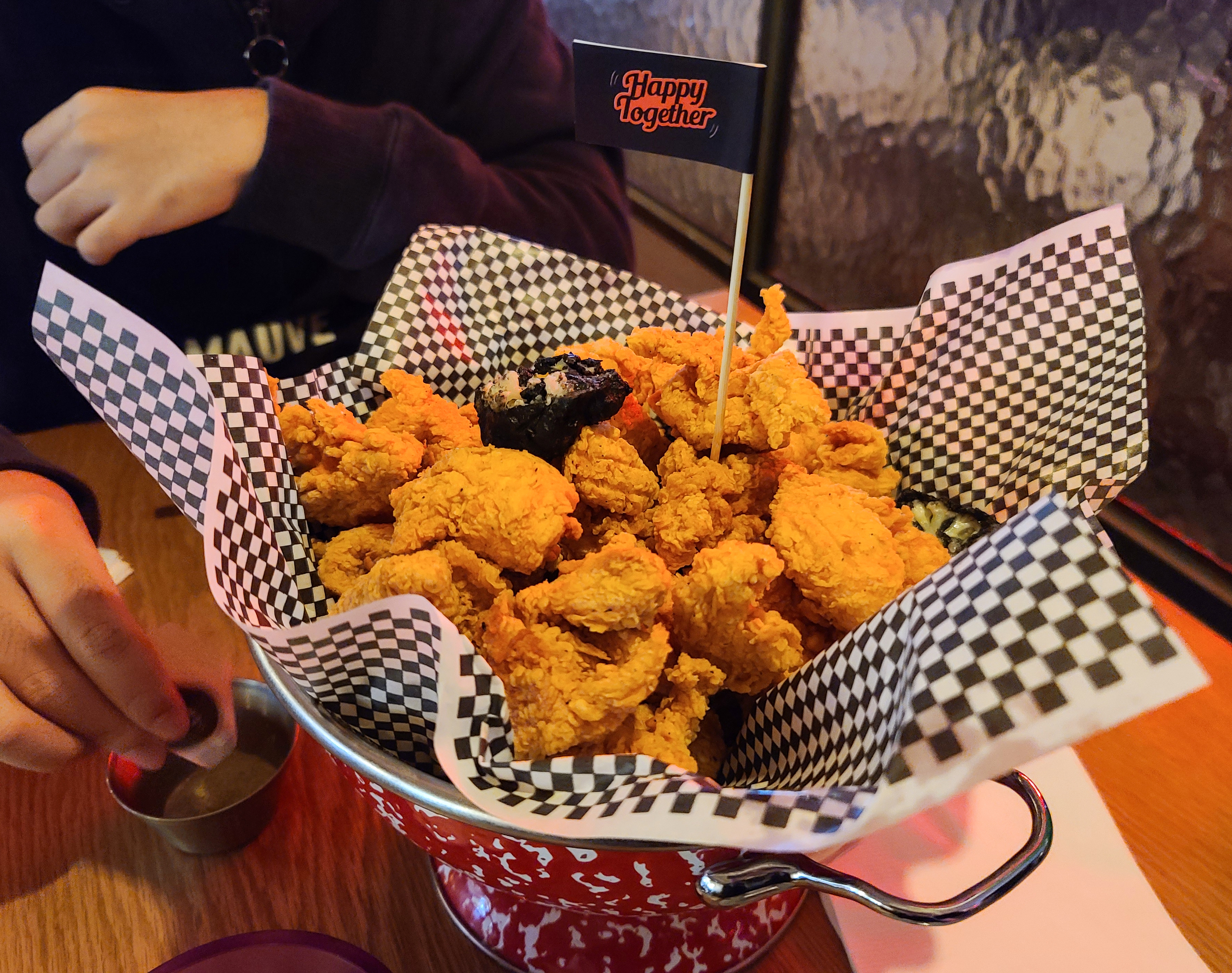 자리에 있는 콜렌더(Colander)에는 집게, 포크, 냅킨 등 식기류가 들어있었고, 이 콜렌더는 치킨을 담는 그릇으로도 활용되었습니다. 앞접시와 집게, 포크를 꺼낸 뒤 메뉴가 나오기를 기다리니, 곧 주문한 치킨과 떡볶이, 감자튀김이 나왔습니다.