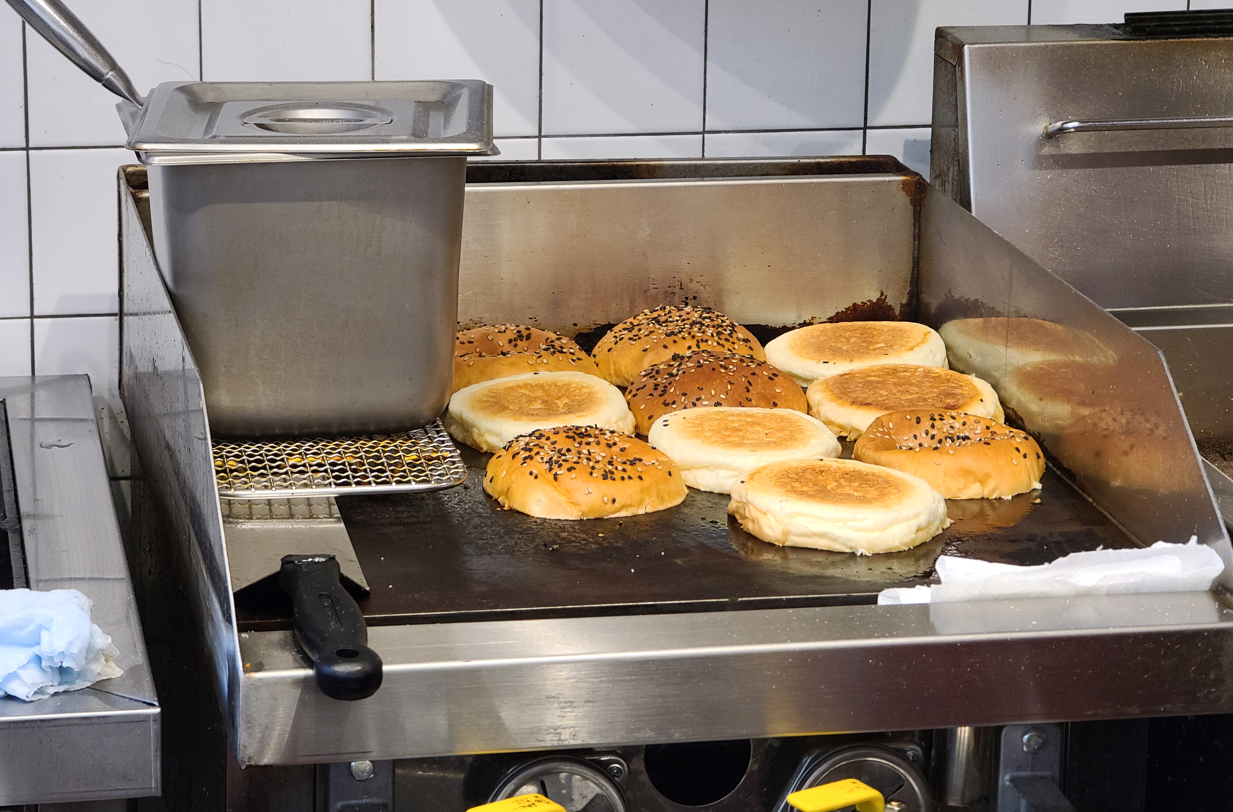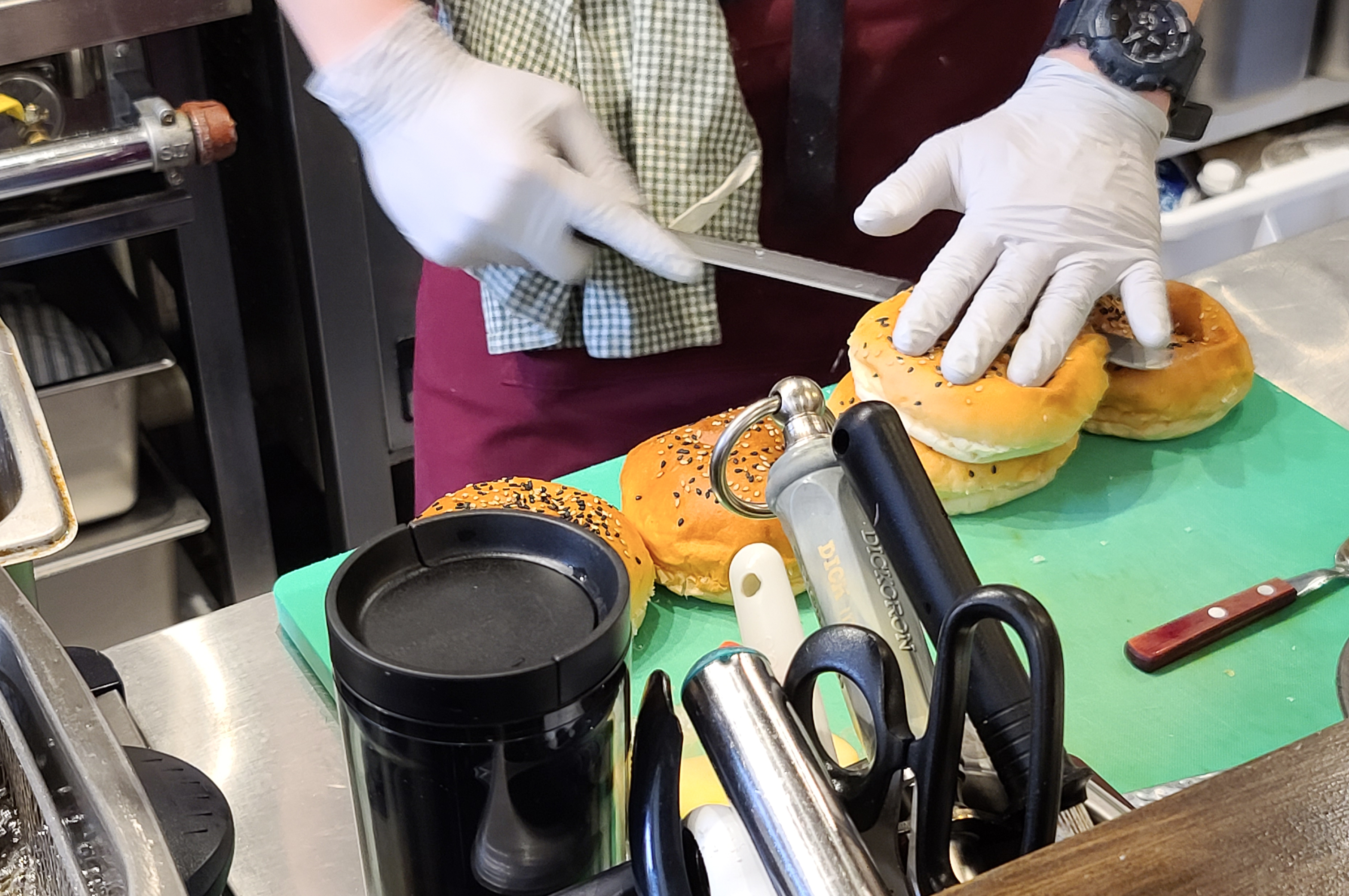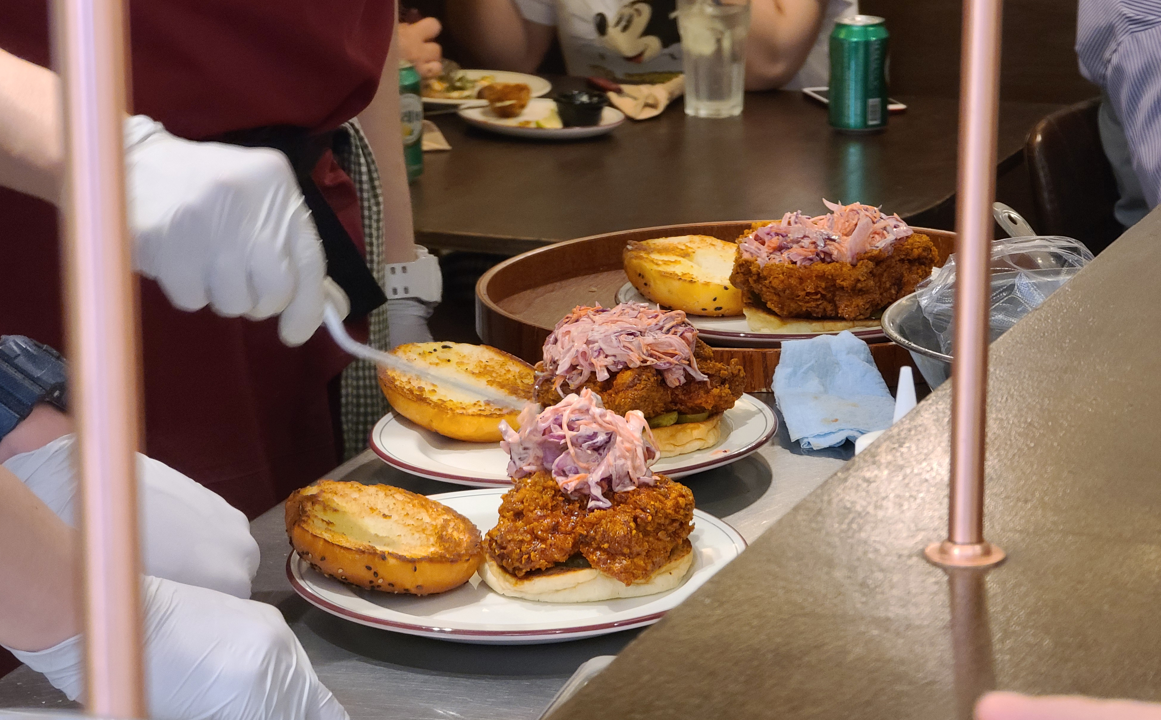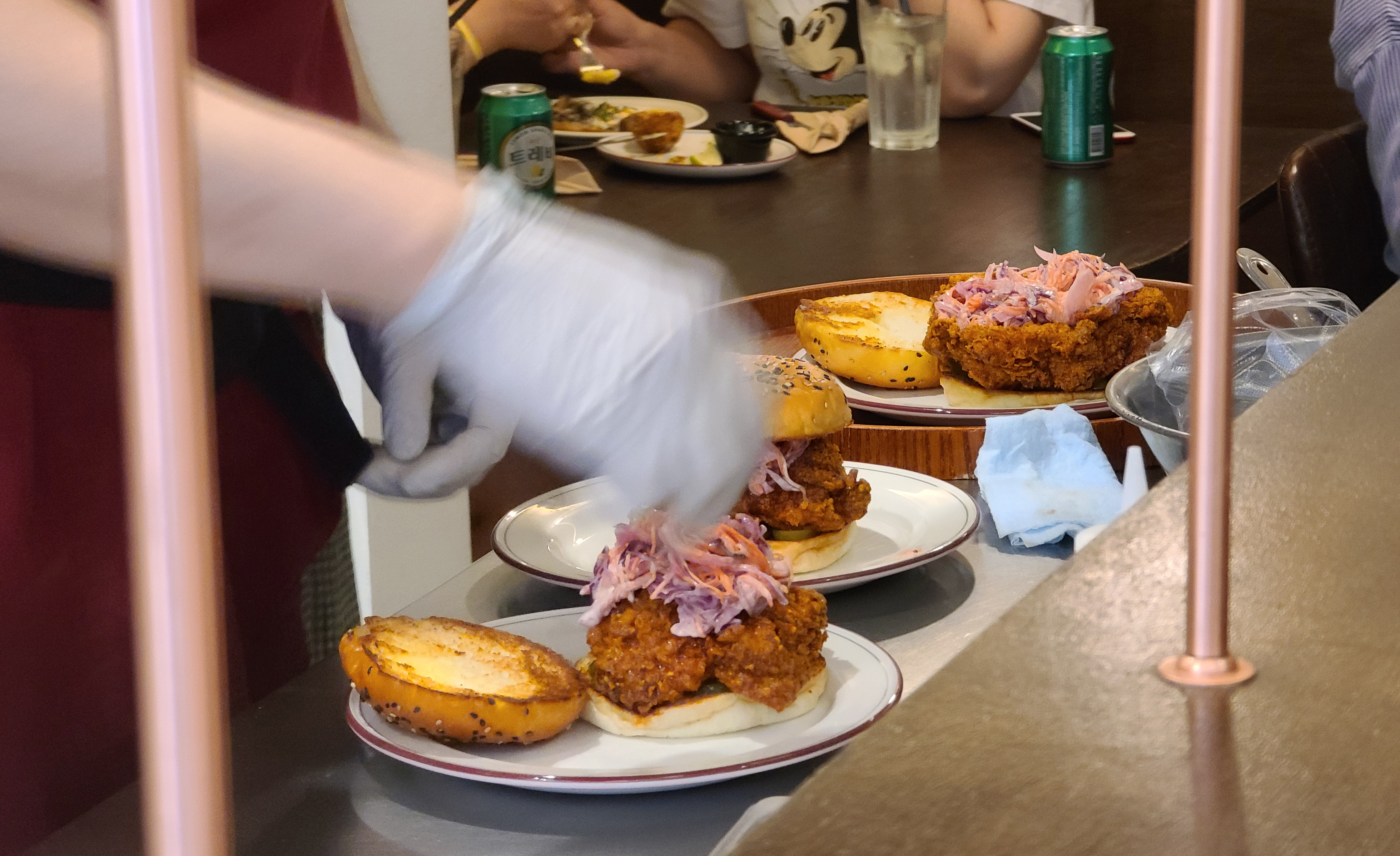 성수동 르프리크는 오픈형 키친이라 버거 만드는 과정을 자리에서 지켜볼 수 있었습니다. 버거 번을 반으로 잘라준 뒤, 버거 번을 익혀주고, 그 위에 큼직한 치킨 패티와 양배추로 만든 토핑을 올려주었습니다.