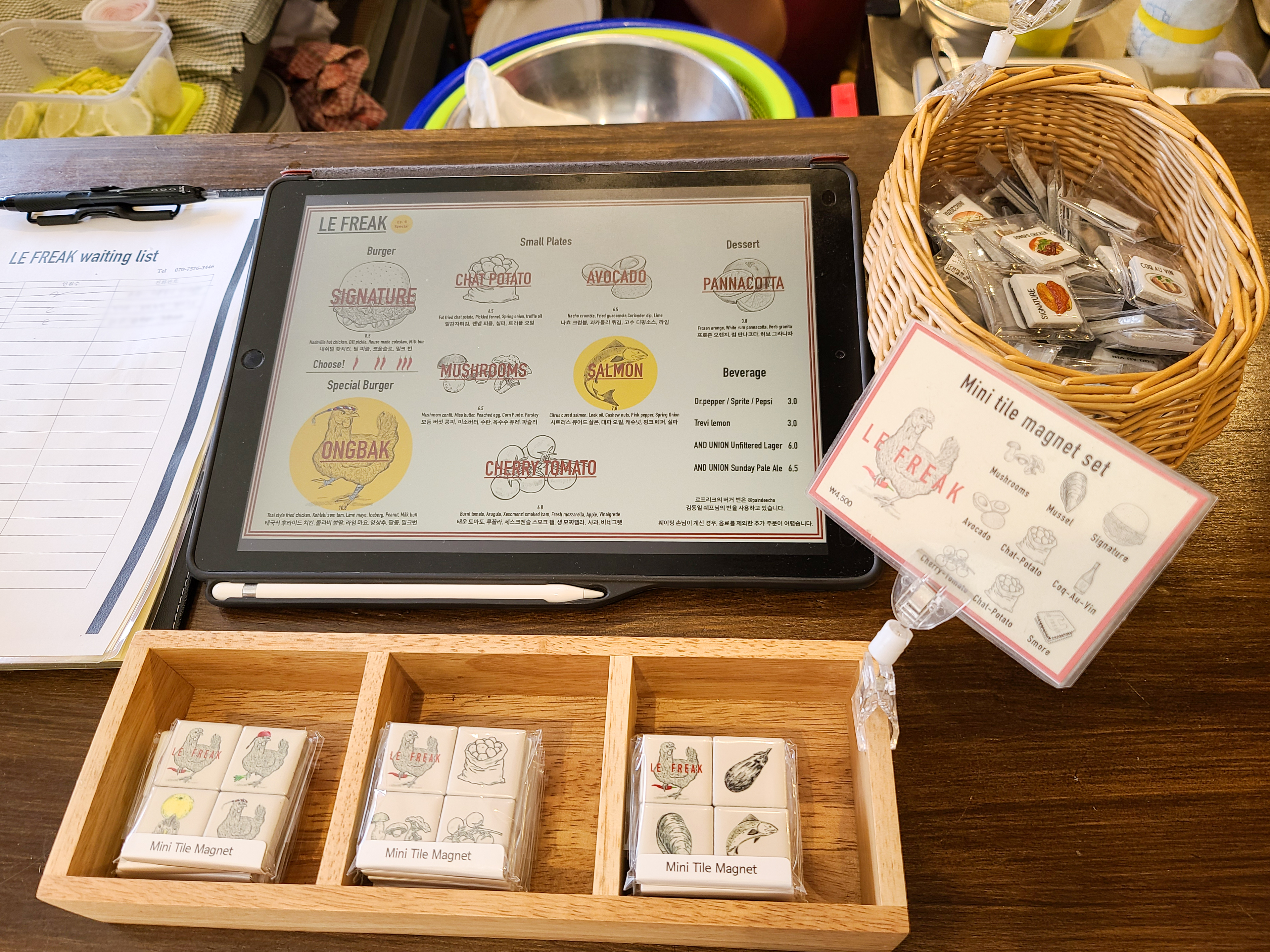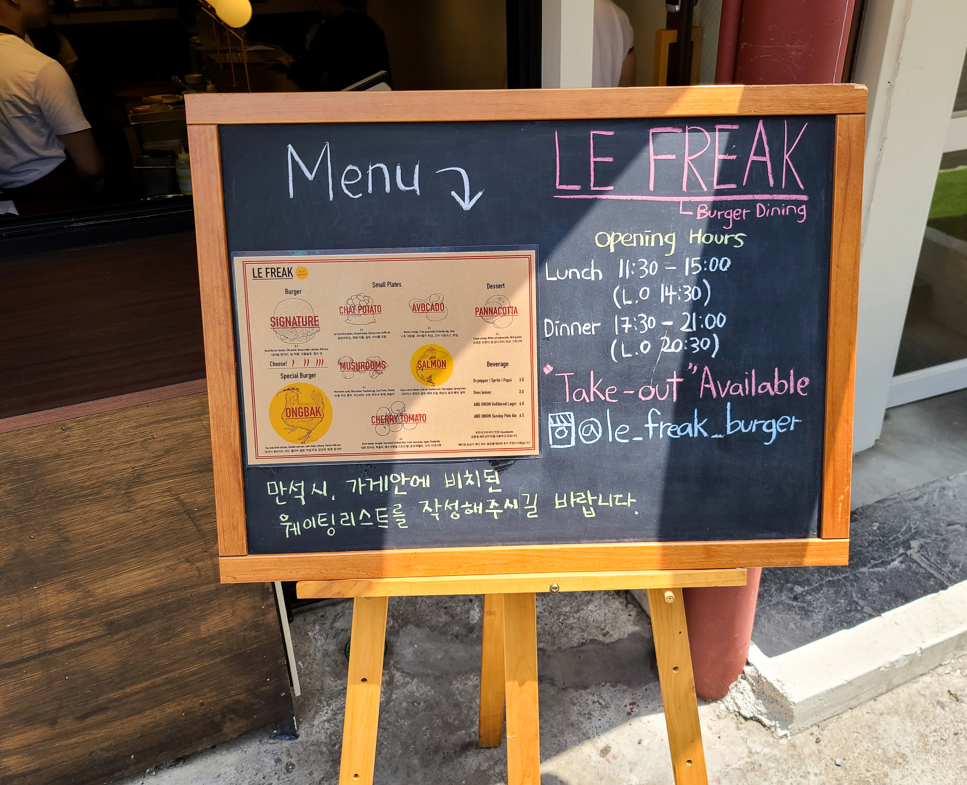 가게에는 예약을 할 수 있는 예약판이 있었고, 르프리크의 메뉴는 위와 같았습니다. Signature, Ongbak, Chai potato, Mushrooms, Avocado, Salmon, Cherry Tomato, Pannacotta 가 있었습니다. 저는 르프리크의 시그니쳐 버거와 음료수를 주문하였습니다.