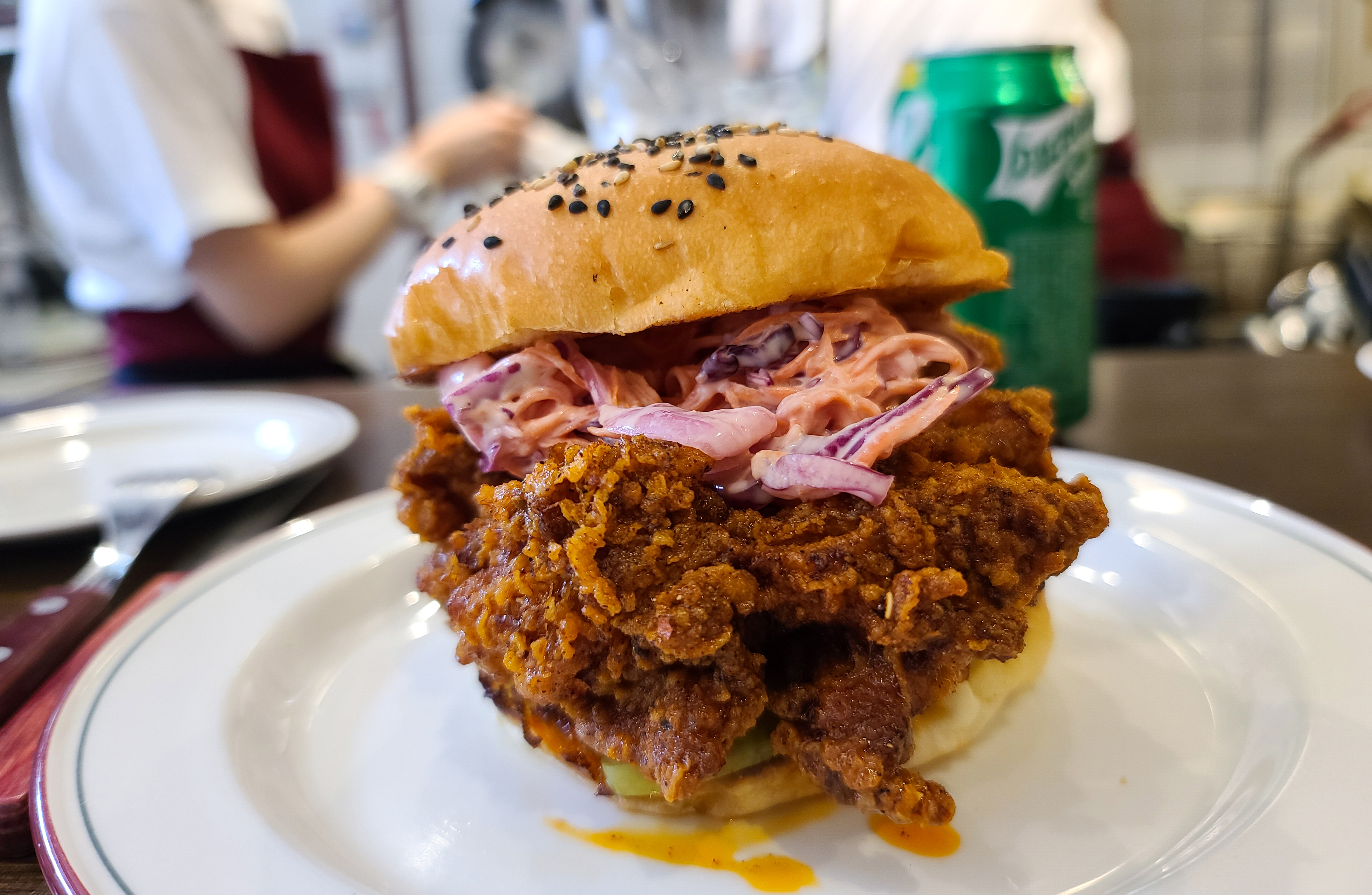 완성된 르프리크 시그니쳐 버거가 나왔습니다. 시그니쳐 버거에는 내쉬빌 핫치킨, 딜 피클, 코울슬로, 밀크 번으로 만들어지는데, 확실히 시그니쳐라는 이름답게 치킨의 크기가 상당했습니다. 저는 사이다와 함께 먹었는데, 꽤 만족스럽게 먹을 수 있었습니다.