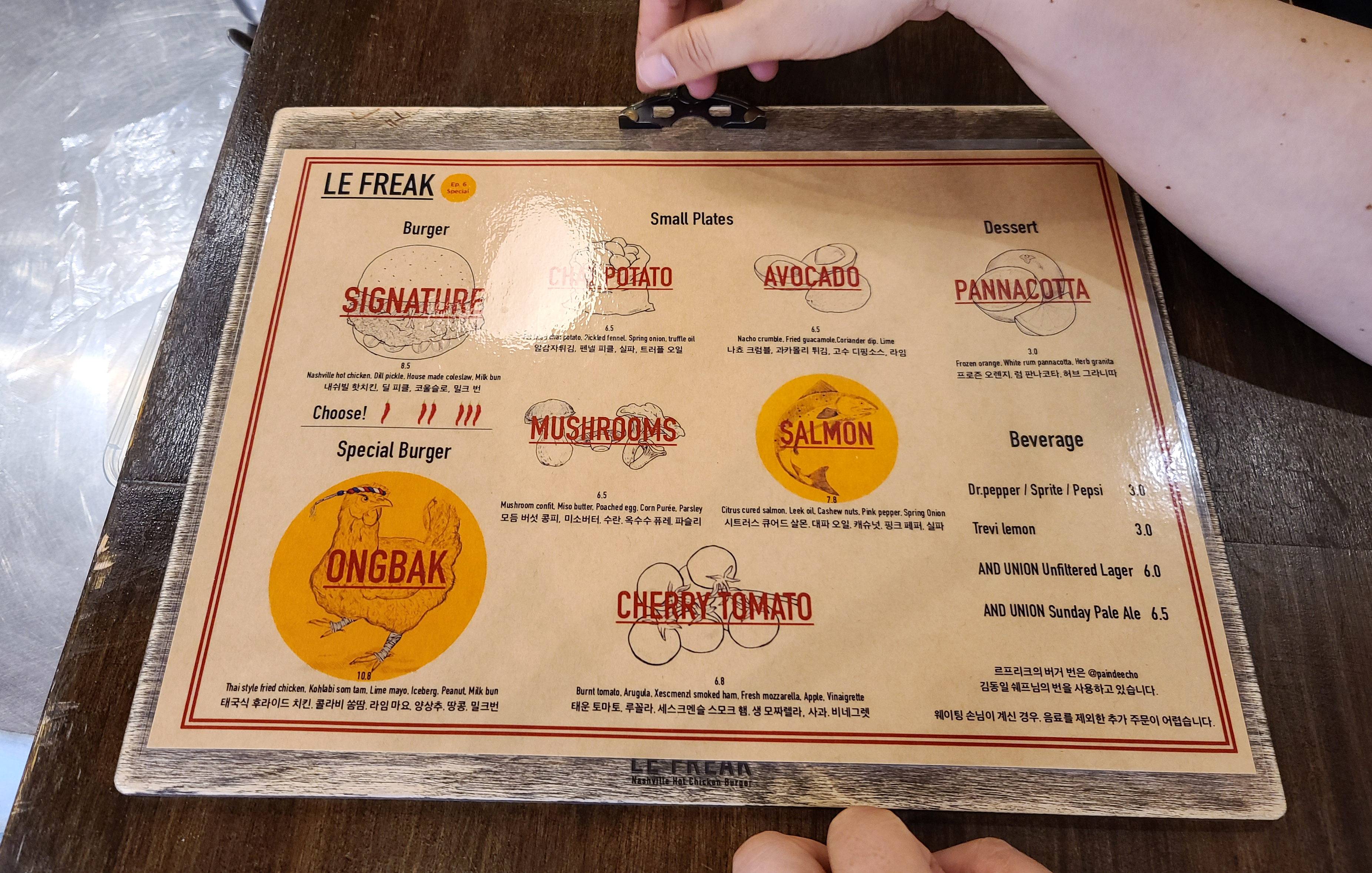 가게에는 예약을 할 수 있는 예약판이 있었고, 르프리크의 메뉴는 위와 같았습니다. Signature, Ongbak, Chai potato, Mushrooms, Avocado, Salmon, Cherry Tomato, Pannacotta 가 있었습니다. 저는 르프리크의 시그니쳐 버거와 음료수를 주문하였습니다.
