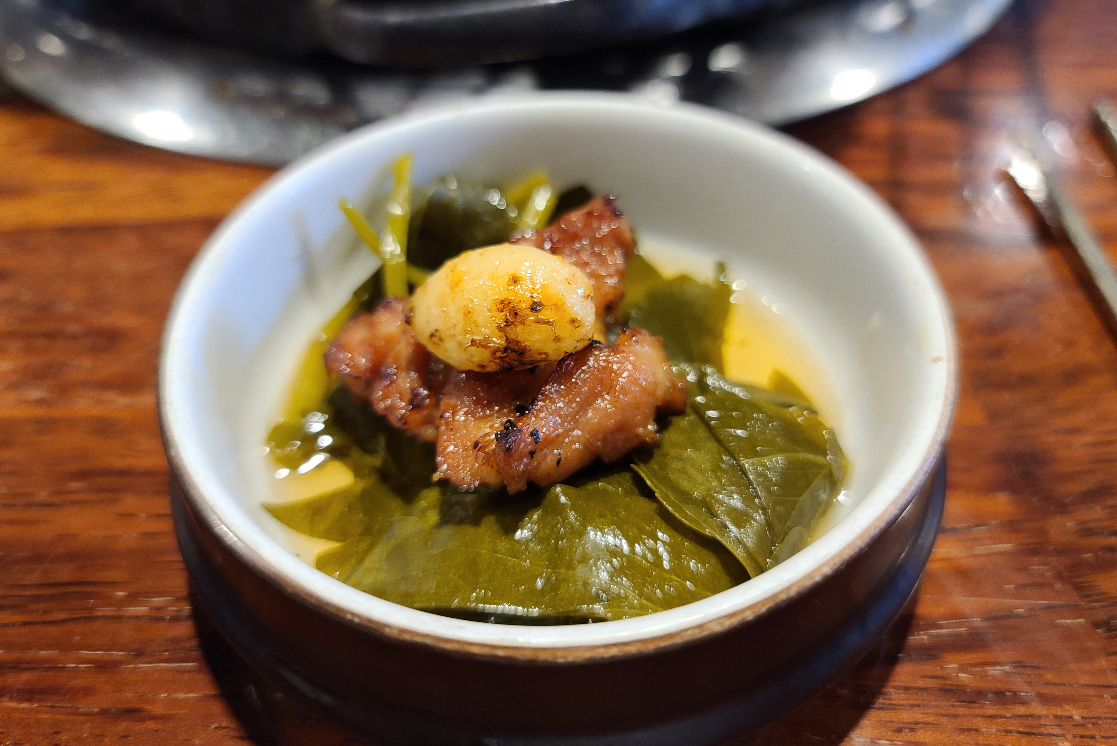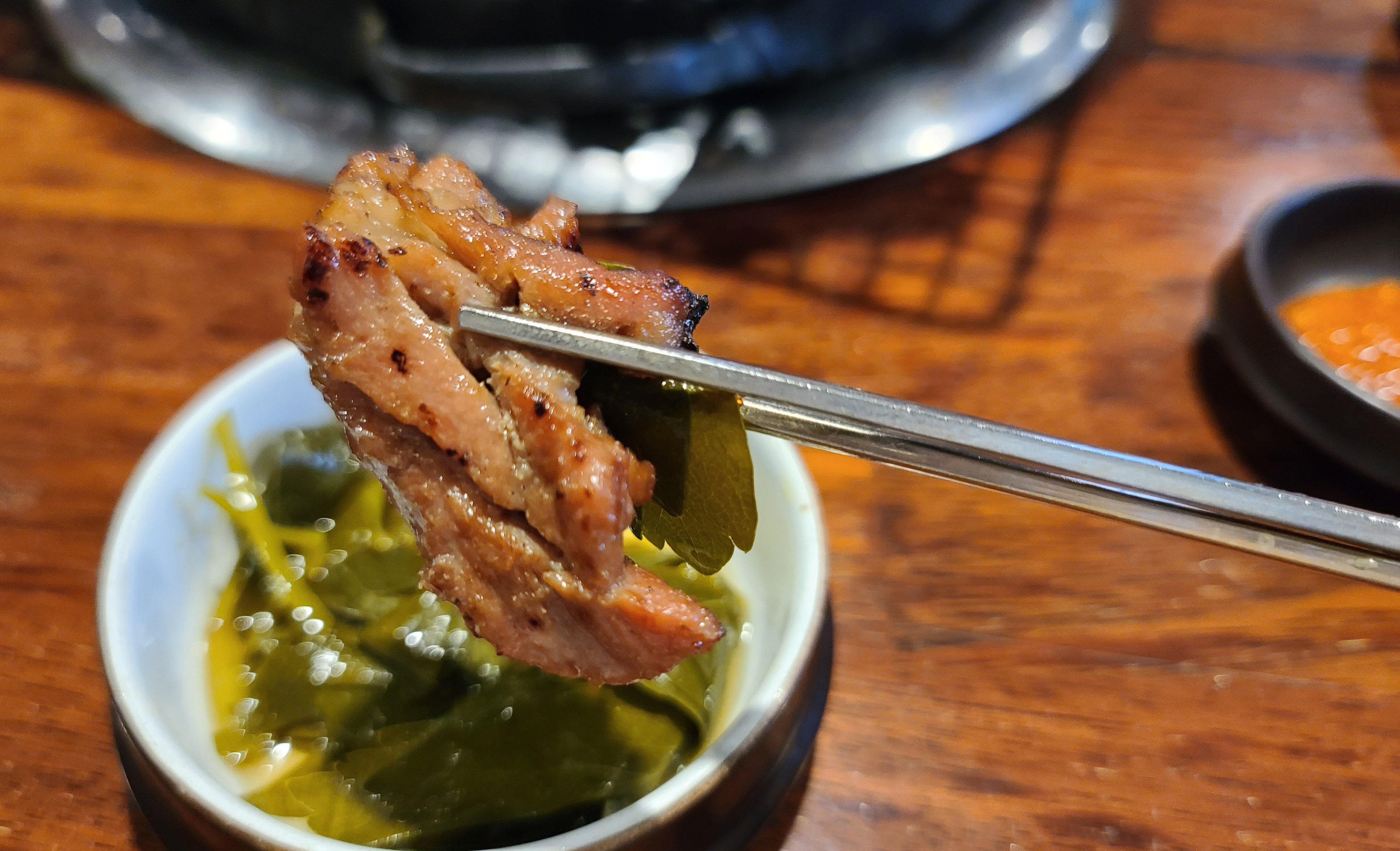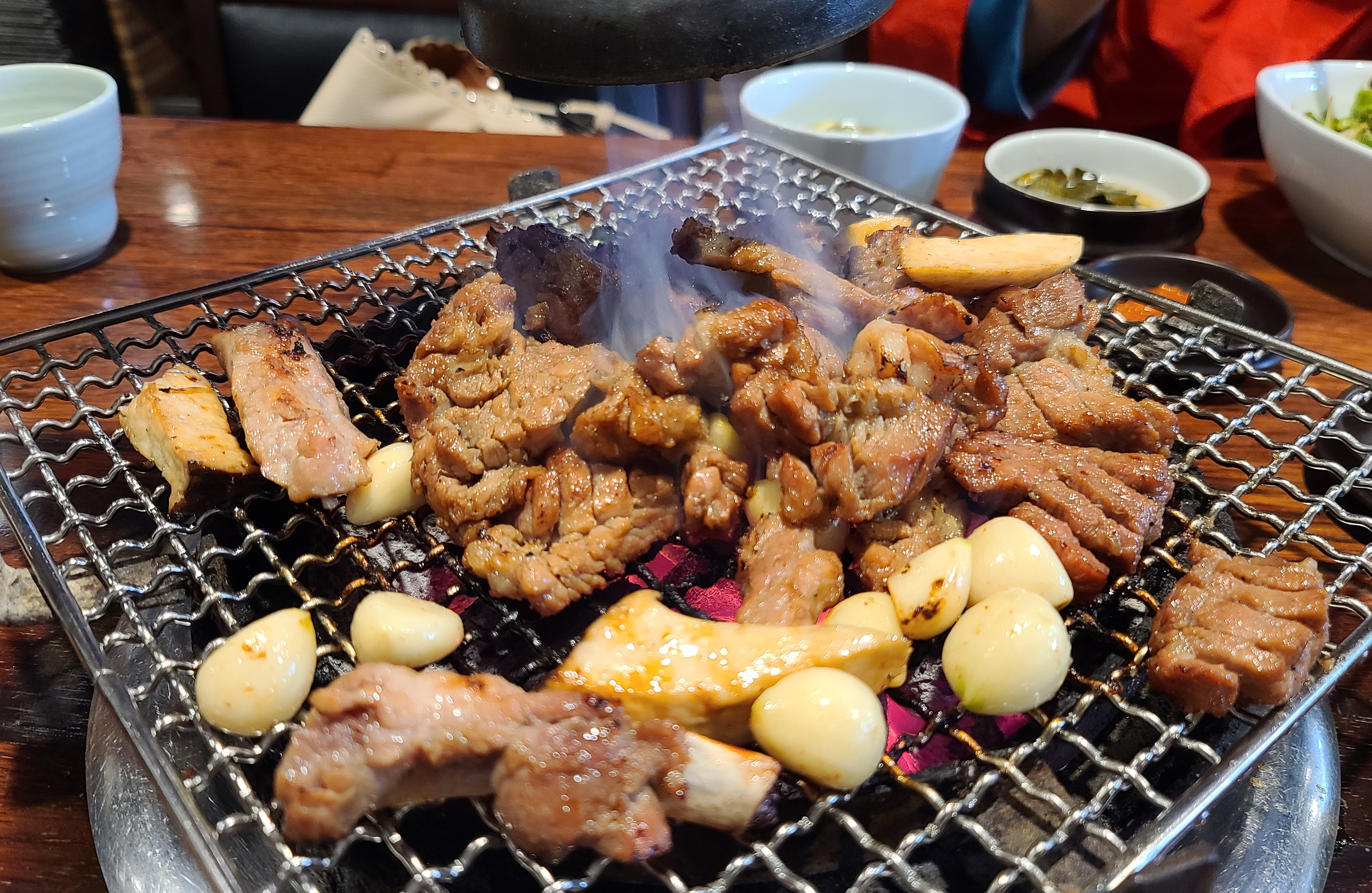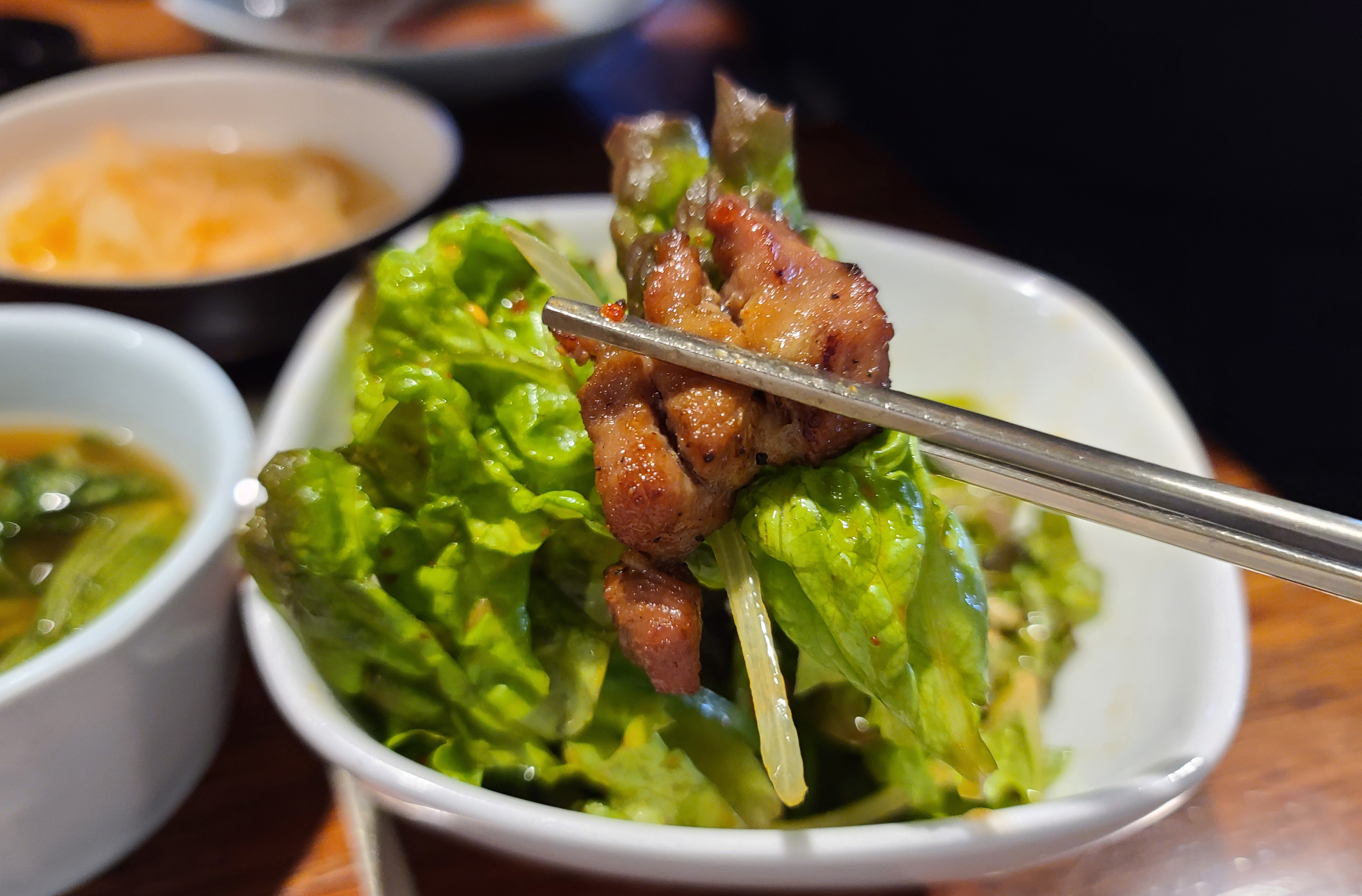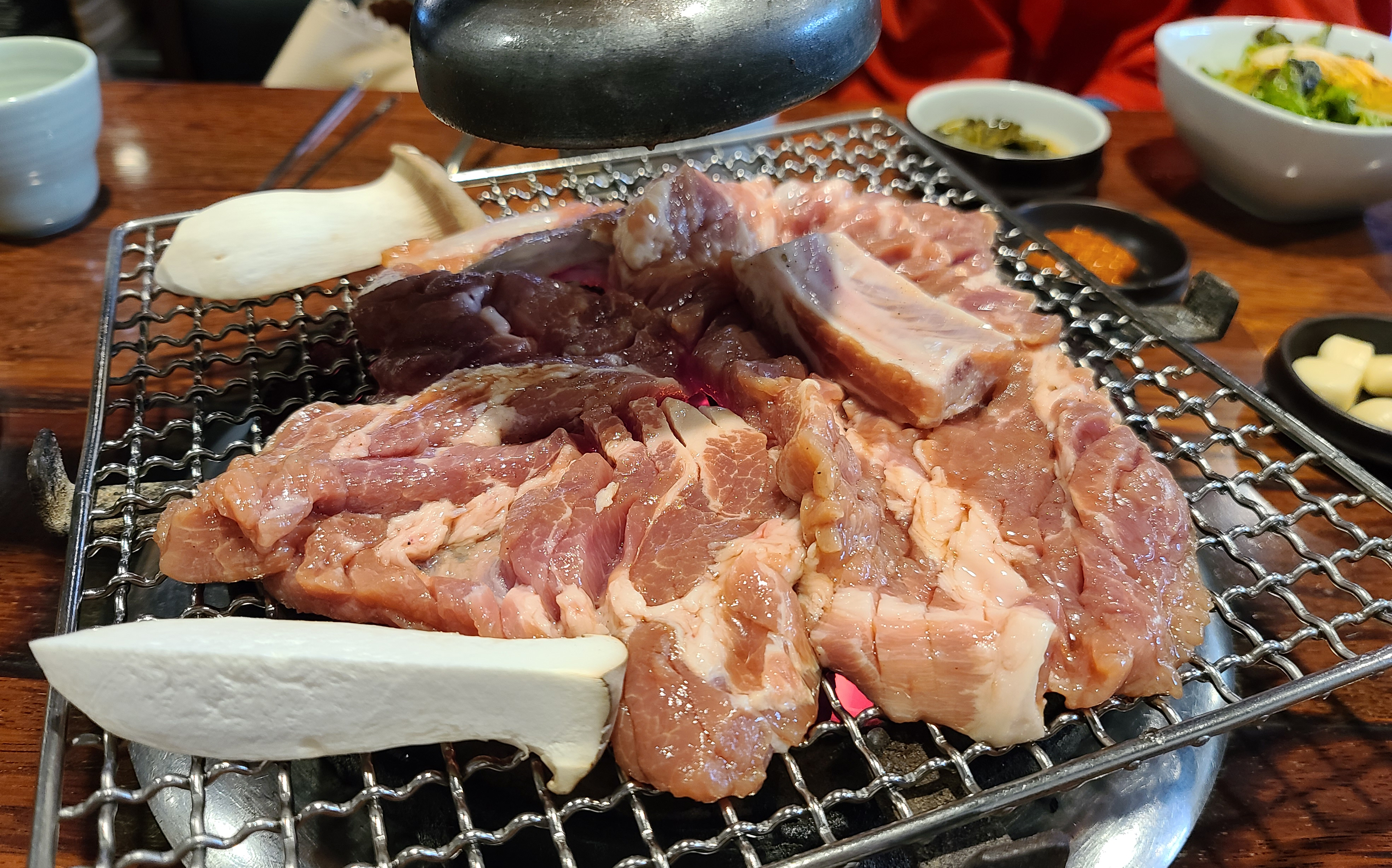 돼지갈비가 다 익으면 알려주시는데, 간이 세지 않고 너무 달거나 하지 않아서 괜찮았고요, 나물에 싸 먹거나 상추 무침과 곁들여도 괜찮았습니다. 가격이 1인분에 27,000원이라는 게 조금 부담이 될 수 있지만, 가족끼리 식사할 때 이용하기에 괜찮았습니다. 서비스도 좋았고요.