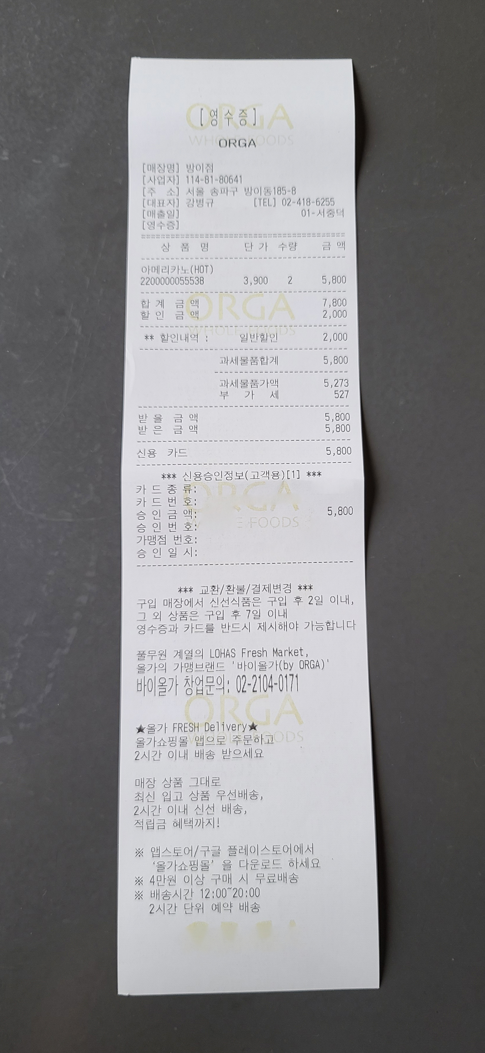 저희는 아메리카노 2 잔을 마셨는데, 원래는 1잔에 3,900원씩 7,800원이 나와야 하지만, 2,000원 할인되어 5,800원에 마실 수 있었습니다. 커피의 맛도 꽤 괜찮았고요. 유기농 먹거리들도 다양하게 판매 중이어서 나중에 기회 되면 <올가>에 대해 더 자세히 소개하는 시간을 가져볼까 합니다.