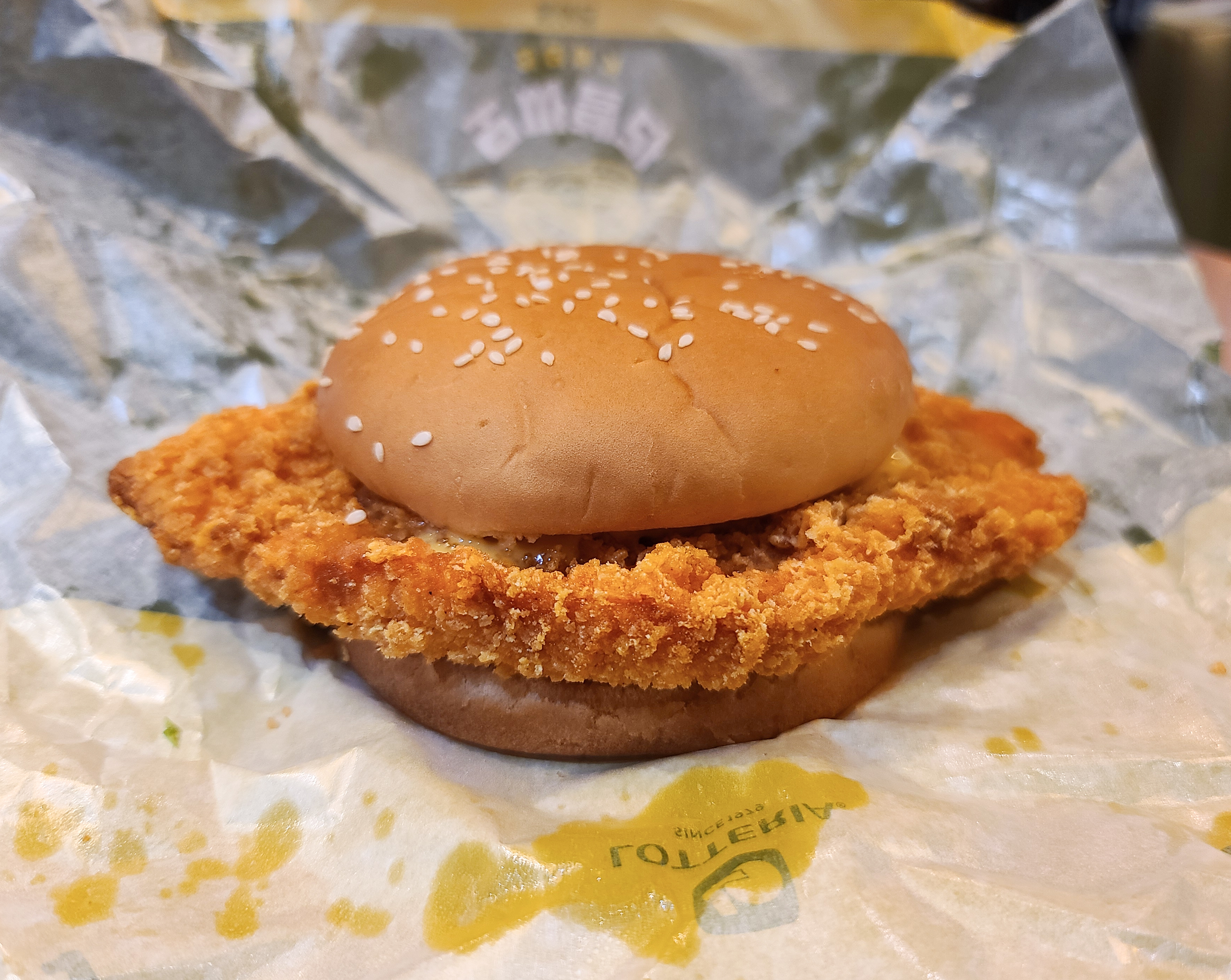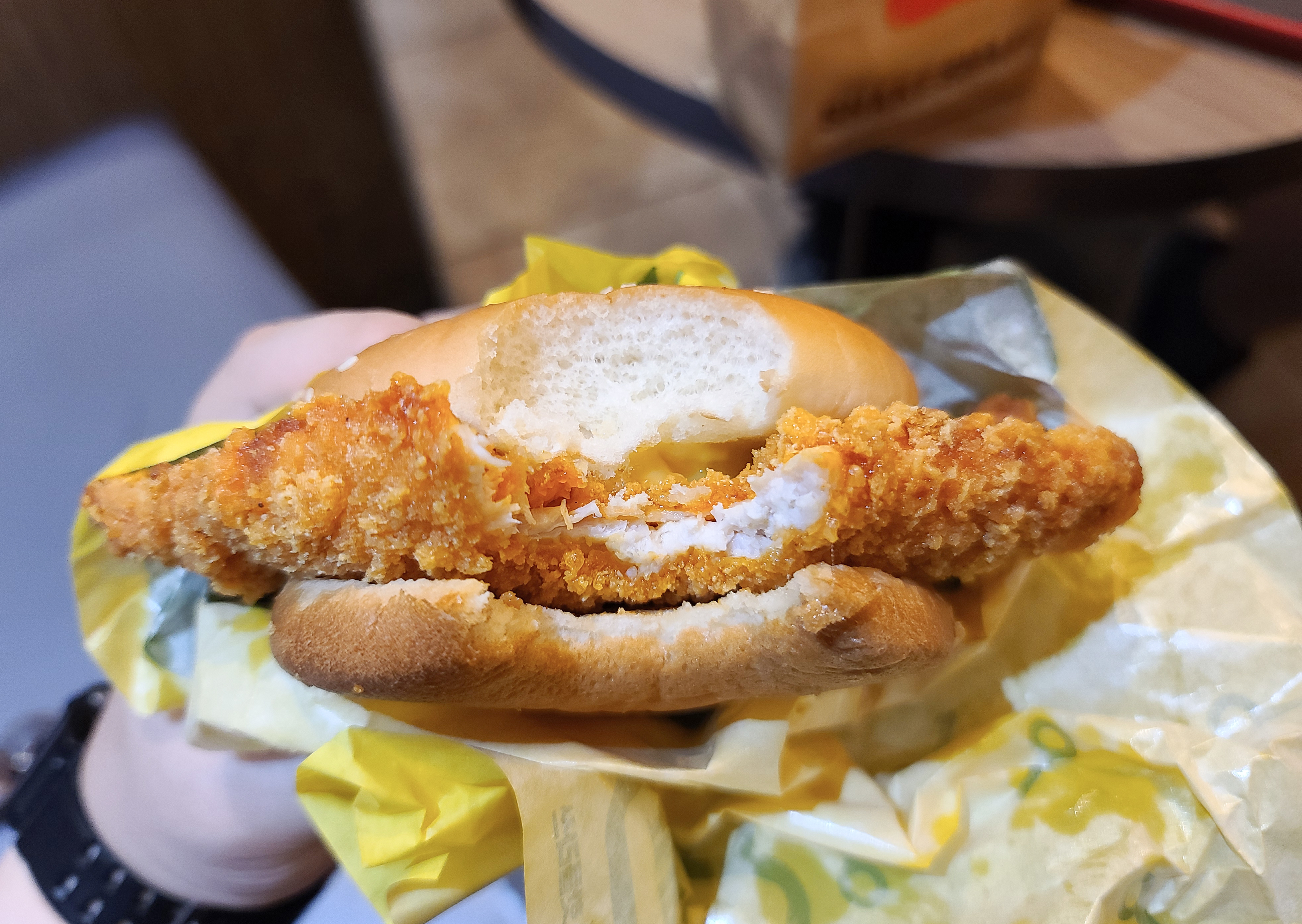 롯데리아 핫 클라쓰버거의 모습은 위와같이 생겼습니다. 예전에 제 블로그로 소개 해드렸던 티렉스버거는 얇고 긴 패티였다면, 핫클라쓰 버거는 전체적으로 돈가스 비슷한 모양의 치킨 패티가 올라간 햄버거라고 보시면 되겠습니다.