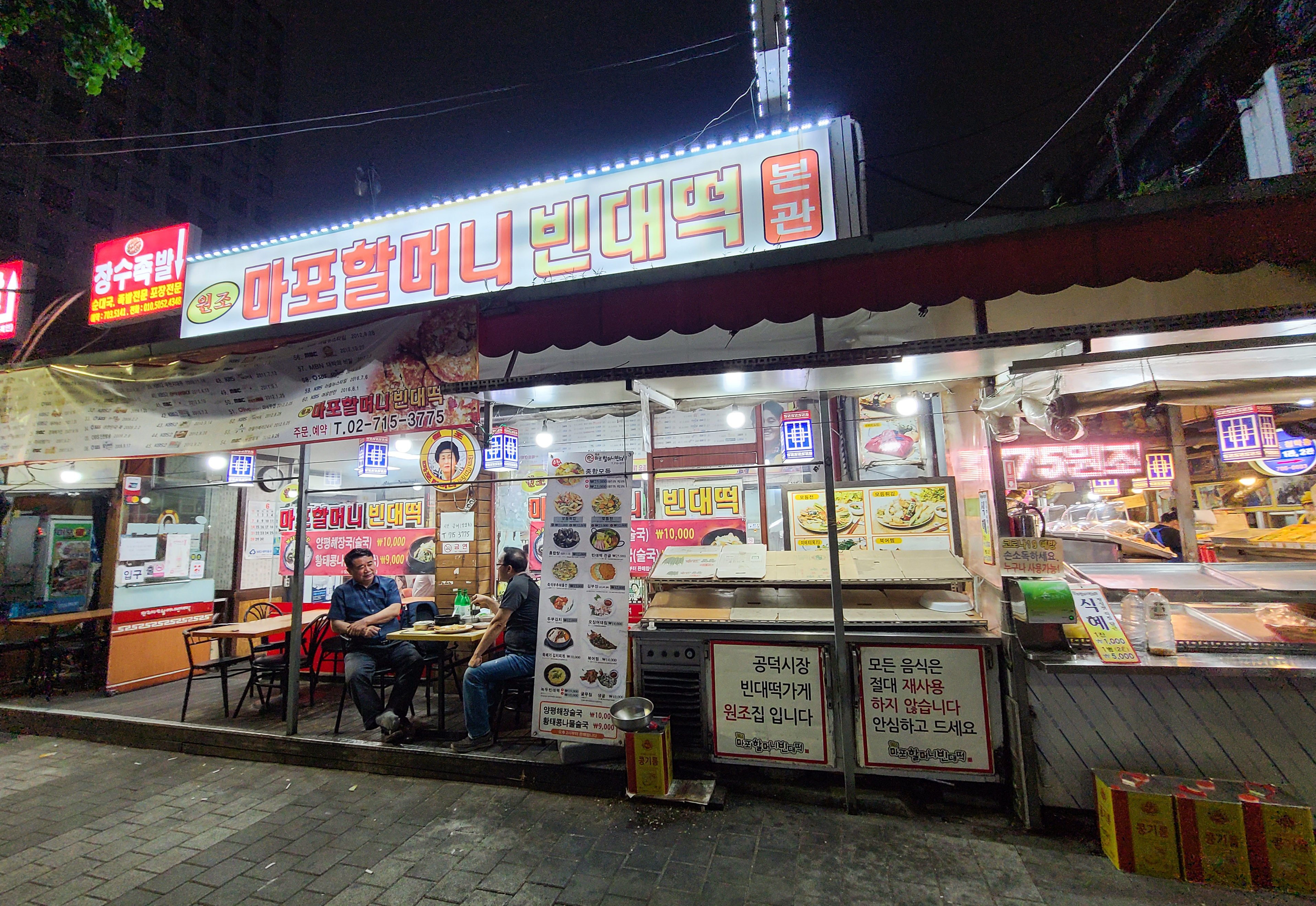 전에 공덕동 전 골목에 방문했을 때는 옆 가게인 '청학동 부침개' 라는 가게를 이용했는데요, 이번에는 '원조 마포할머니 빈대떡' 가게를 이용하기로 했죠.