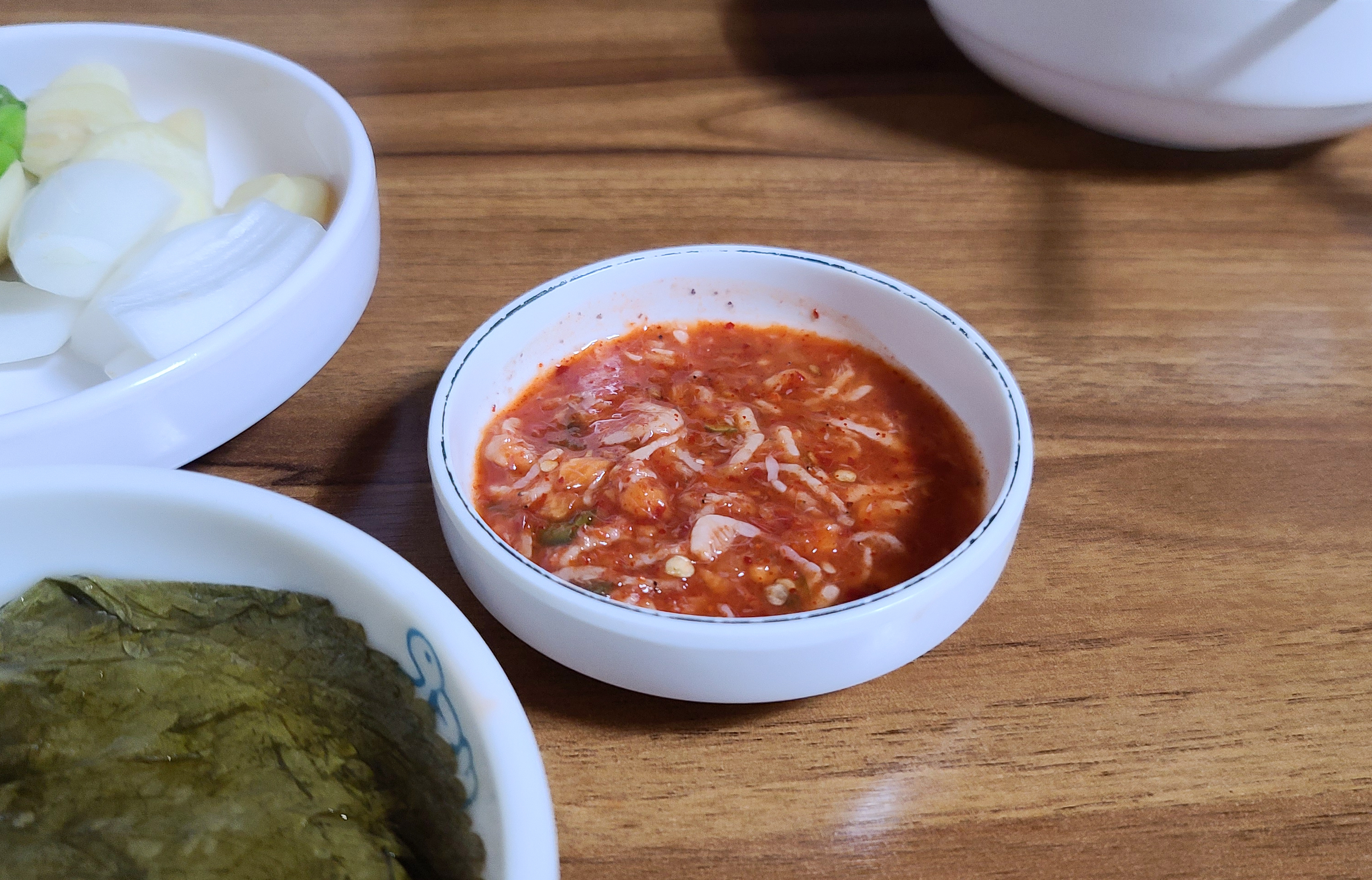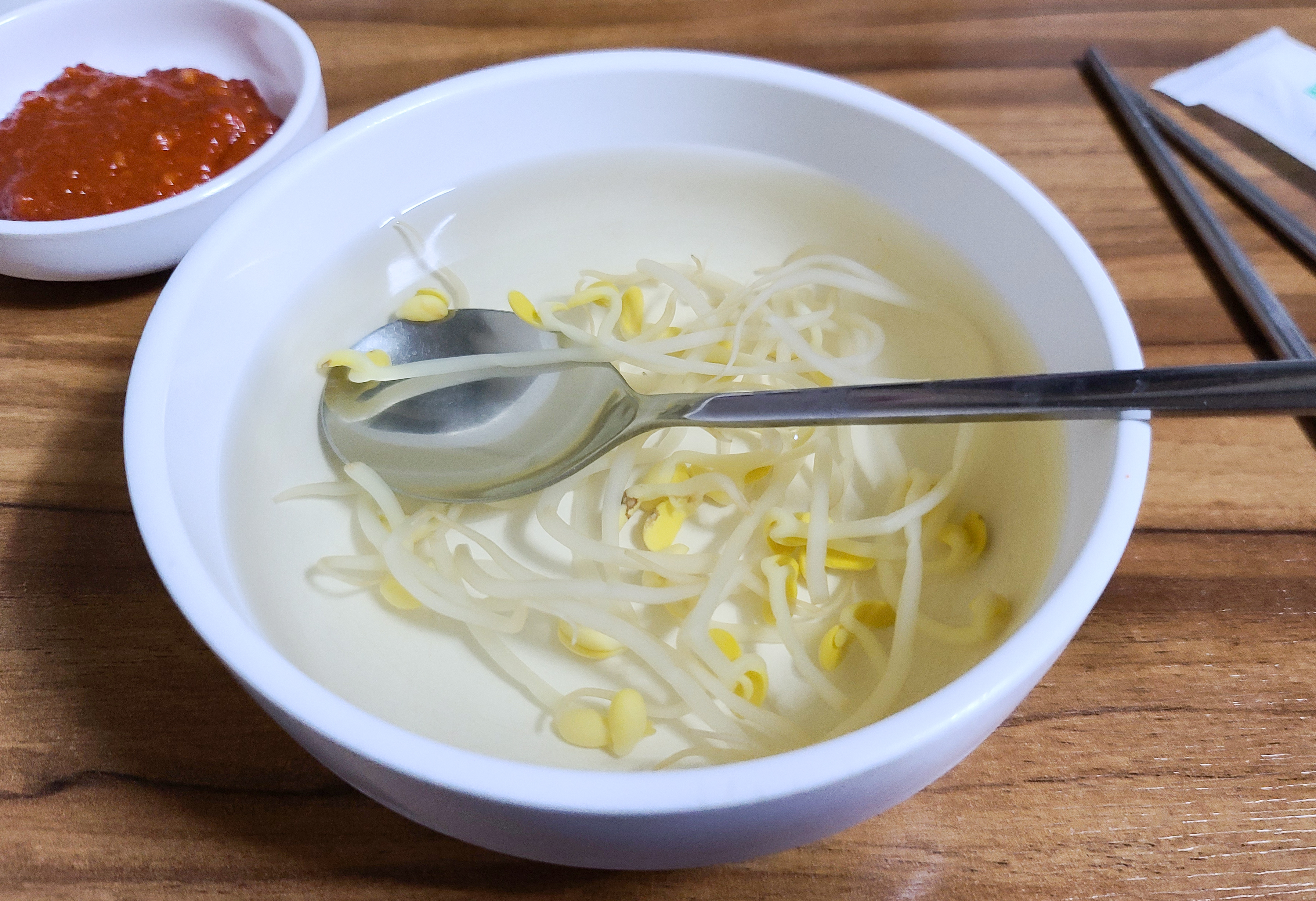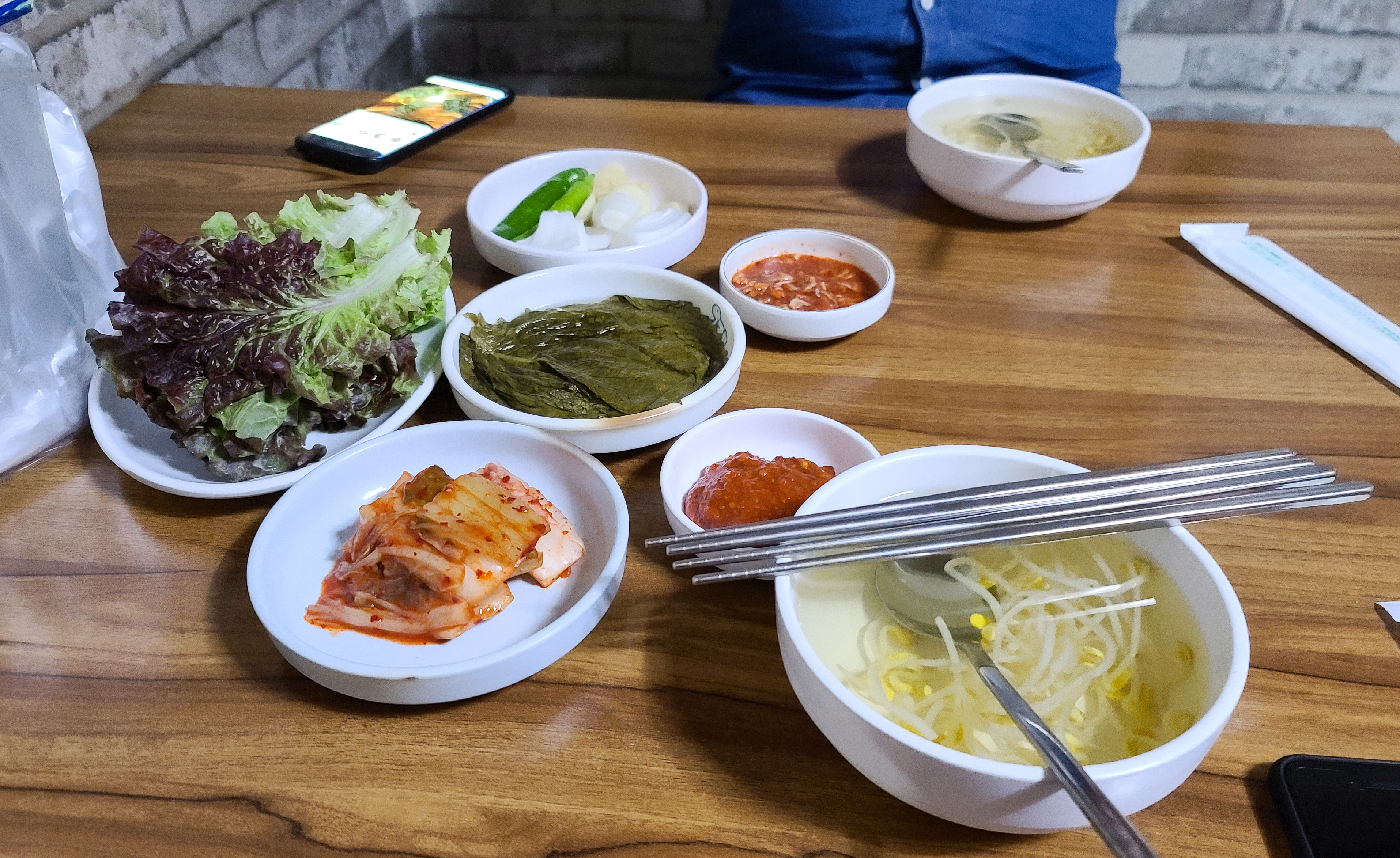 곧이어 옥천 매운 족발의 밑반찬이 준비되었습니다. 콩나물국 쌈채소와 깻잎장아찌, 배추김치, 고추, 양파, 마늘, 쌈장, 새우젓 등이 제공되었습니다. 매운 족발을 먹어야 하기에 콩나물국은 시원하게 만들었더라고요.