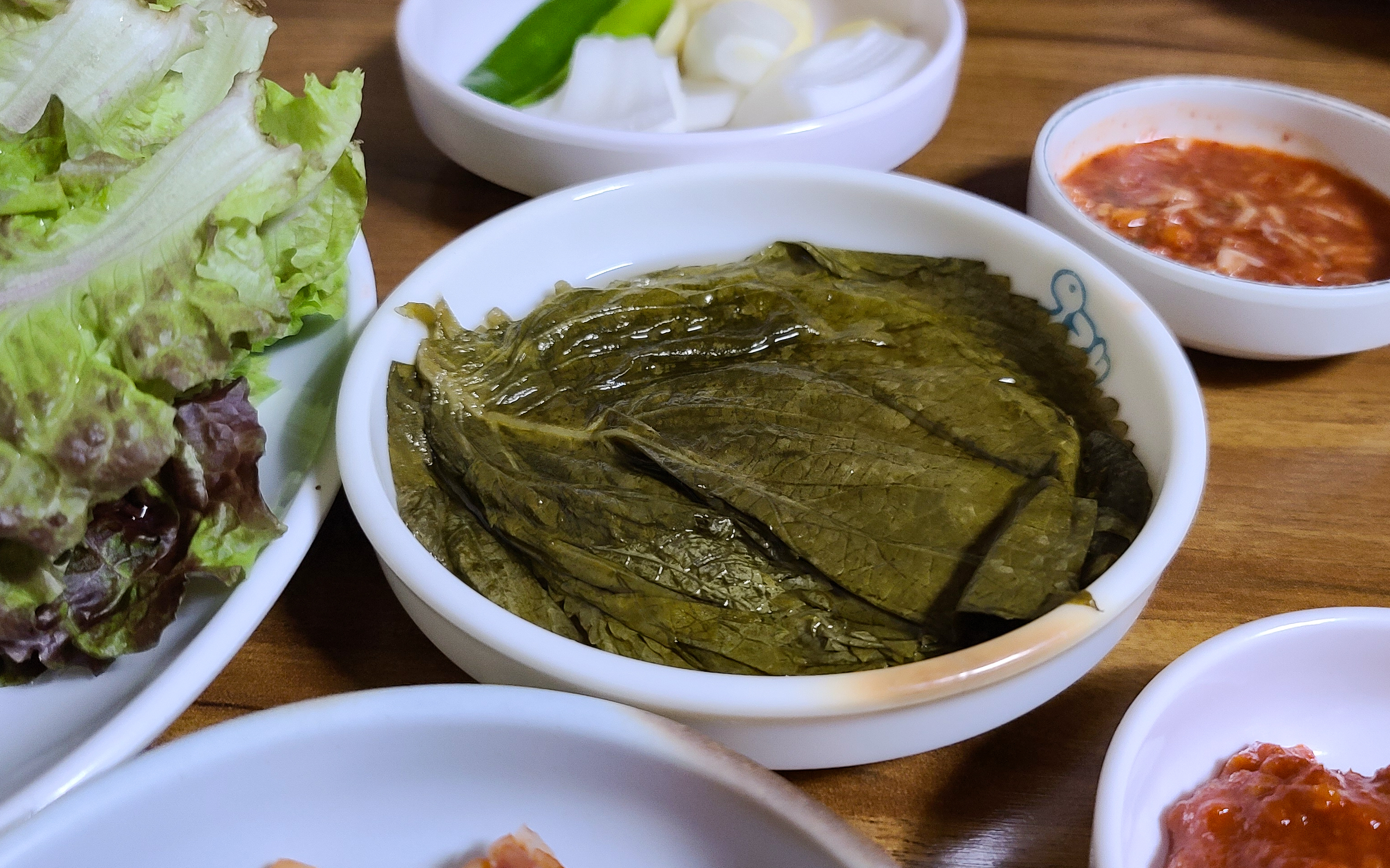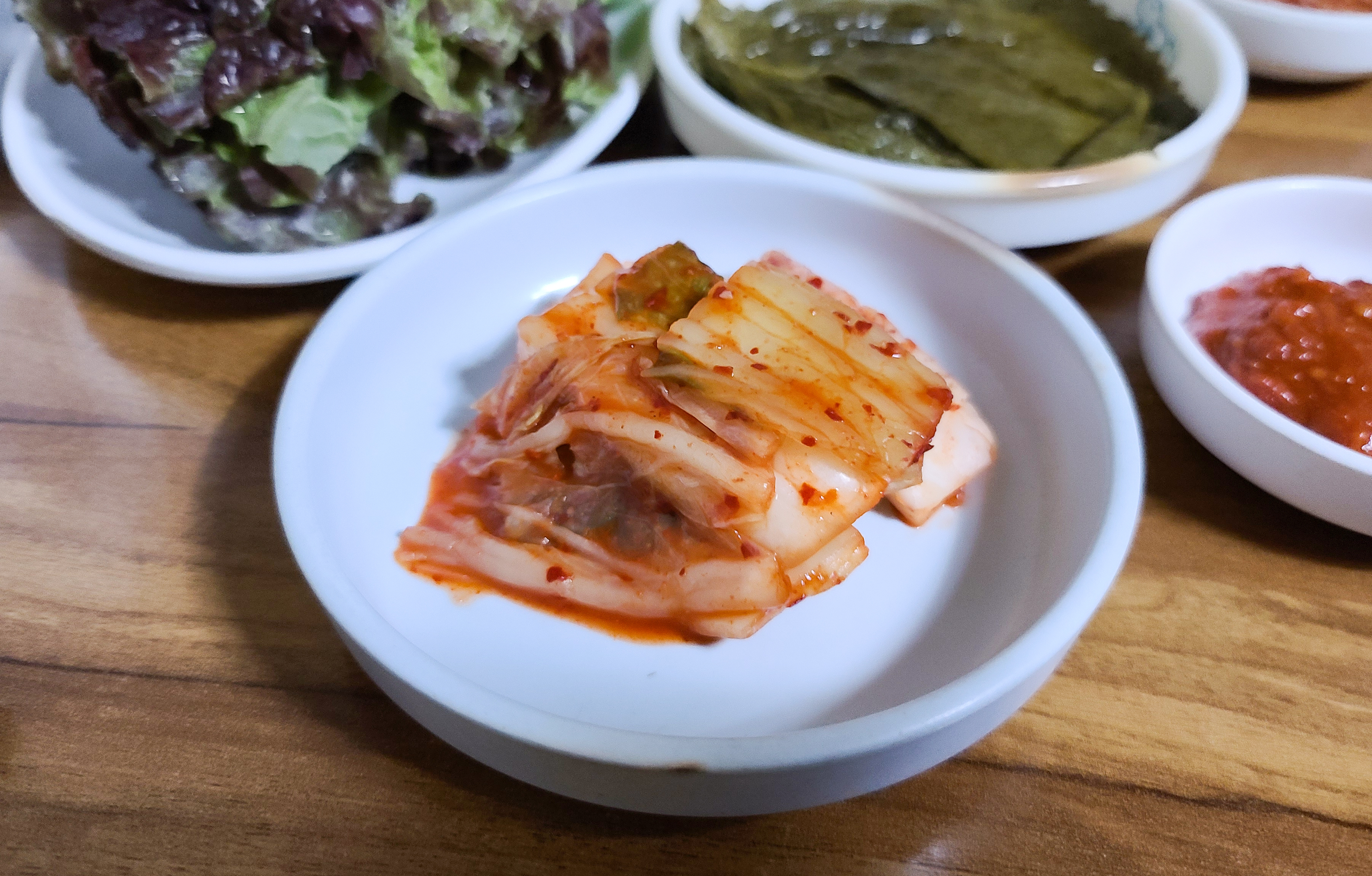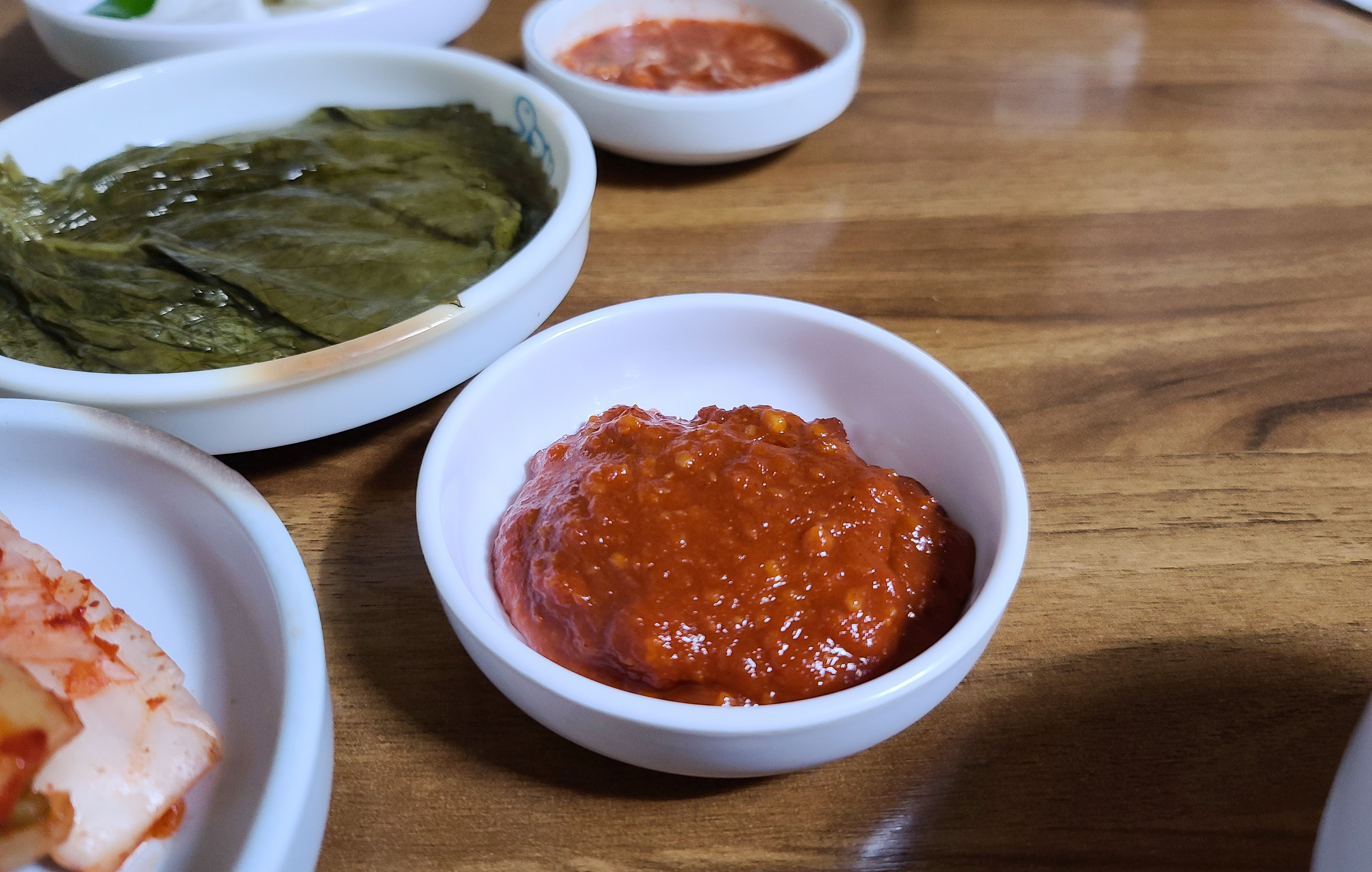 곧이어 옥천 매운 족발의 밑반찬이 준비되었습니다. 콩나물국 쌈채소와 깻잎장아찌, 배추김치, 고추, 양파, 마늘, 쌈장, 새우젓 등이 제공되었습니다. 매운 족발을 먹어야 하기에 콩나물국은 시원하게 만들었더라고요.