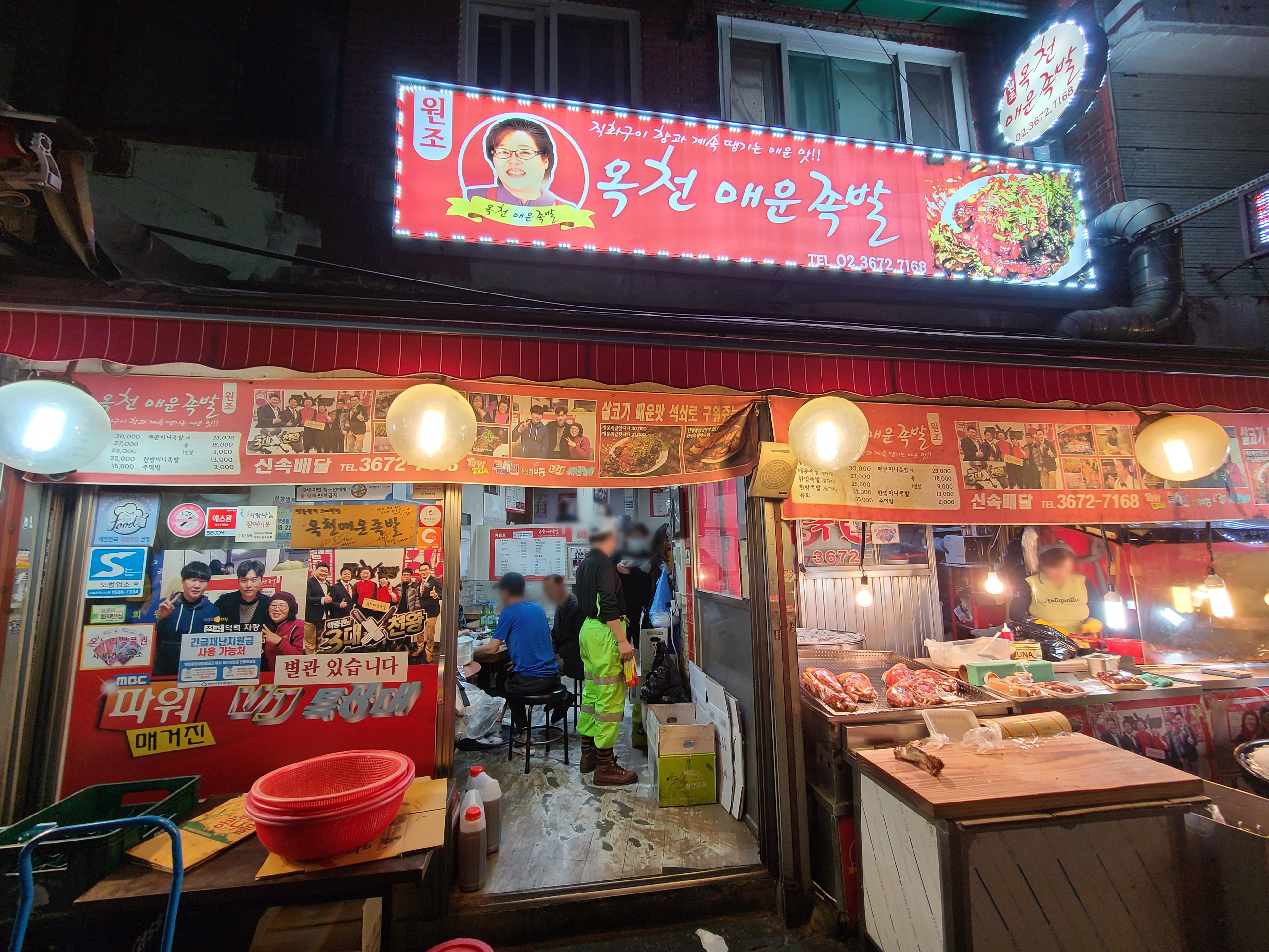 창신동 옥천 매운족발 가게는 위와 같이 생겼으며, 오후 11시가 넘은 시간인데도 손님이 많았습니다. 가게 앞에서는 매운 족발의 불맛을 위해 그릴에 직화를 하는 모습을 볼 수 있었고, 곳곳에 TV 방영의 흔적이 남아있었습니다.