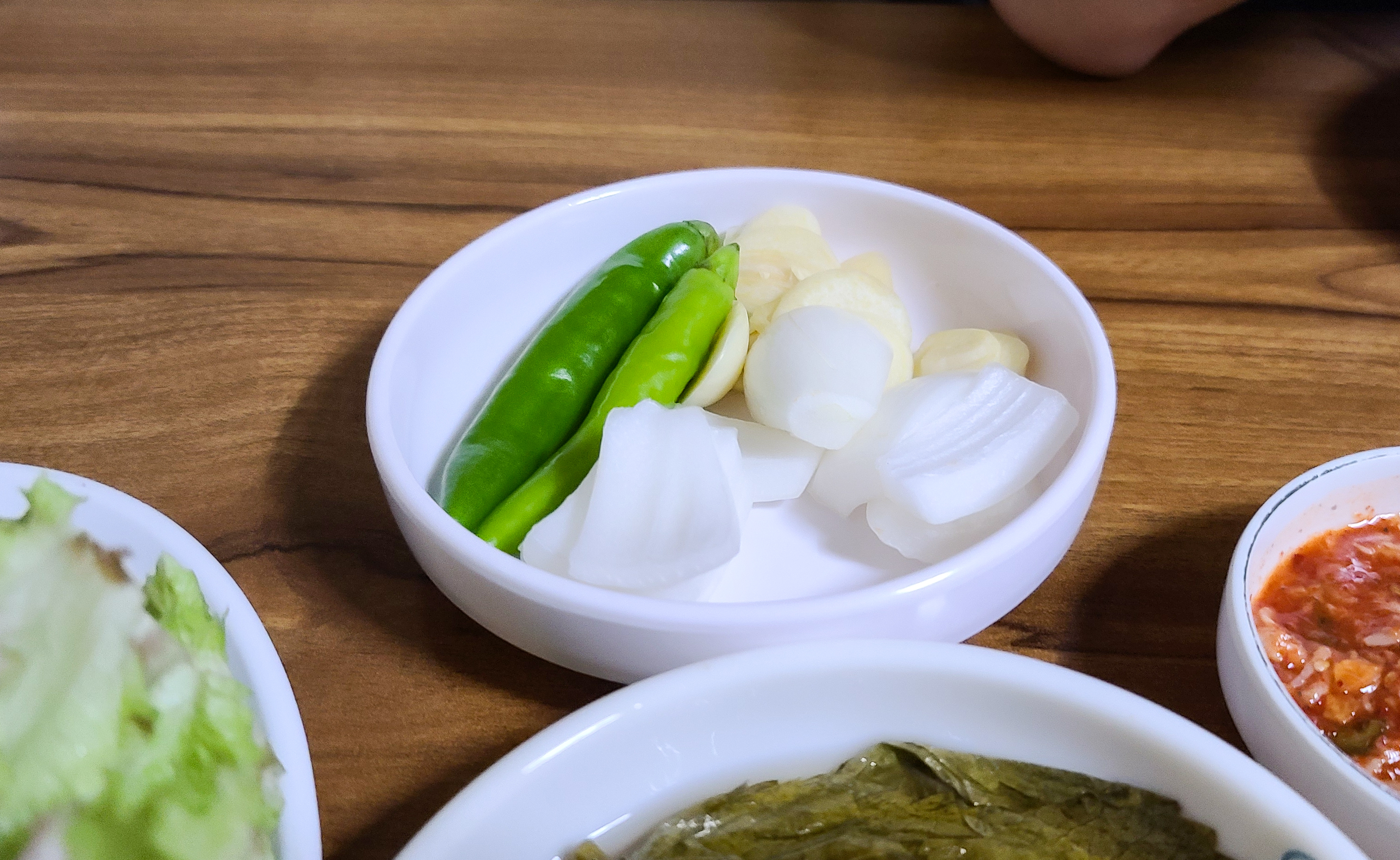 곧이어 옥천 매운 족발의 밑반찬이 준비되었습니다. 콩나물국 쌈채소와 깻잎장아찌, 배추김치, 고추, 양파, 마늘, 쌈장, 새우젓 등이 제공되었습니다. 매운 족발을 먹어야 하기에 콩나물국은 시원하게 만들었더라고요.