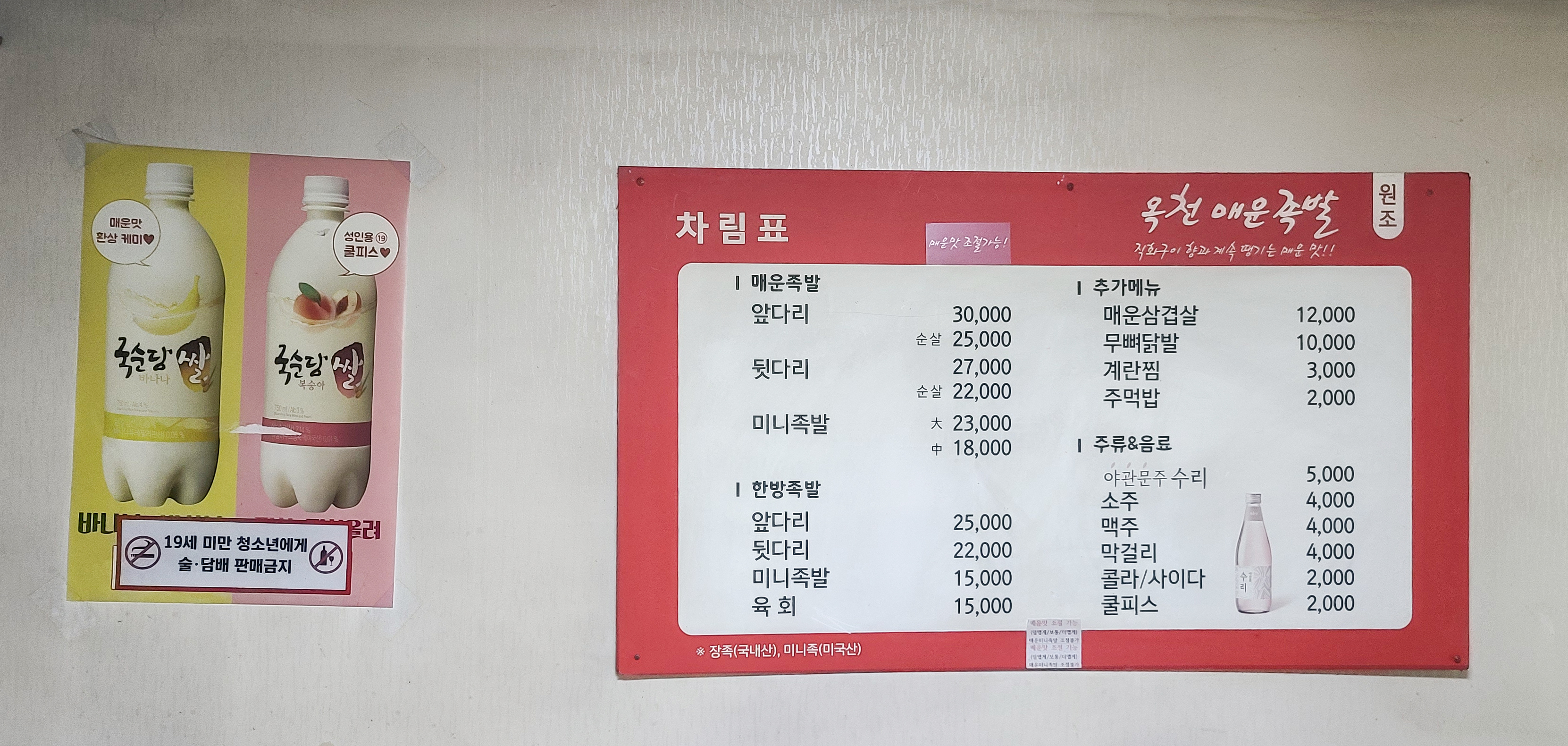 옥천 매운 족발 가게의 메뉴는 위와 같습니다. 매운 족발(앞다리/뒷다리/미니족발), 한방족발(앞다리/뒷다리/미니족발/육회) 매운삼겹살, 무뼈닭발, 계란찜, 주먹밥 등 이 있었습니다. 저희는 매운족발 순살 앞다리를 주문하였습니다.