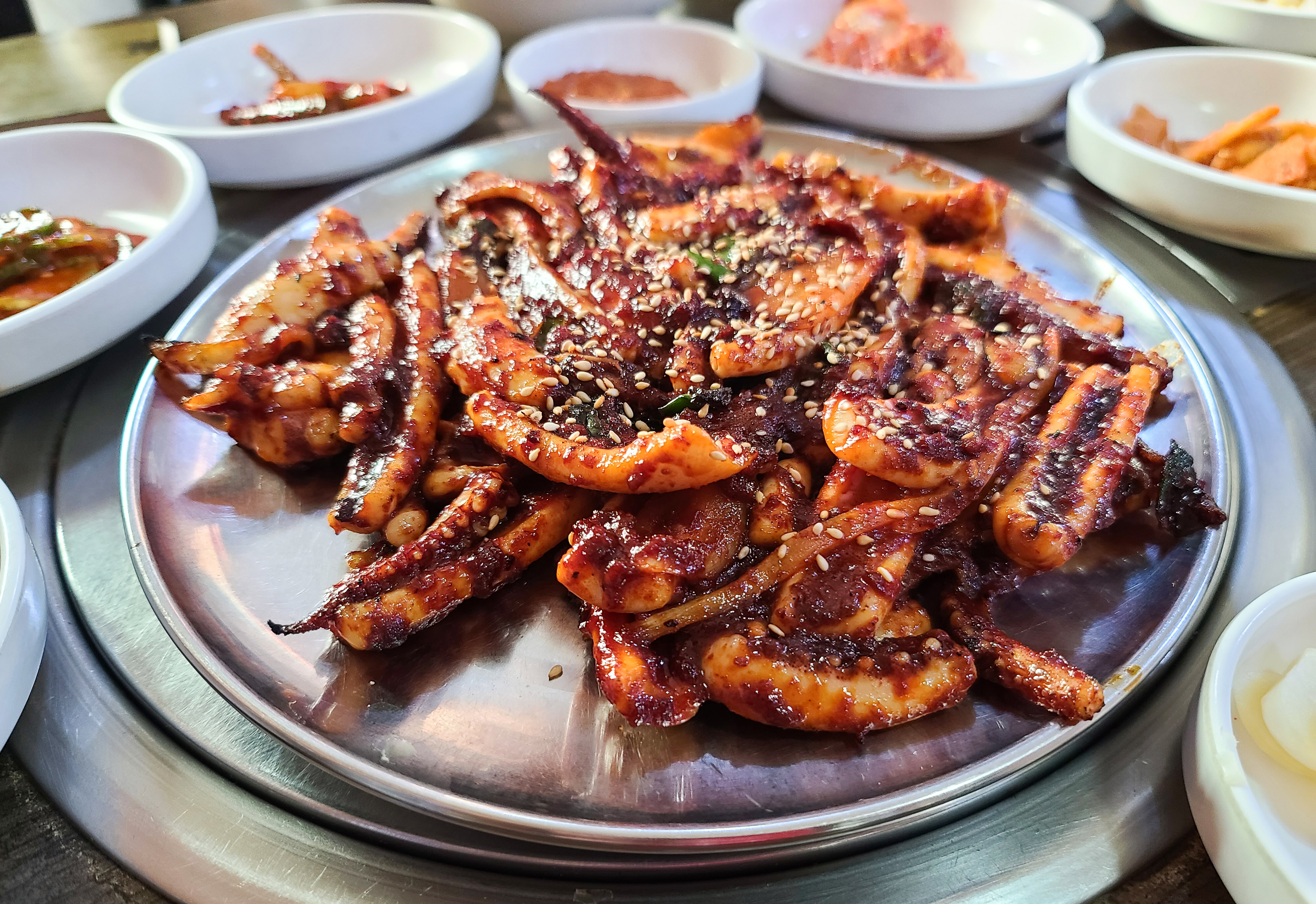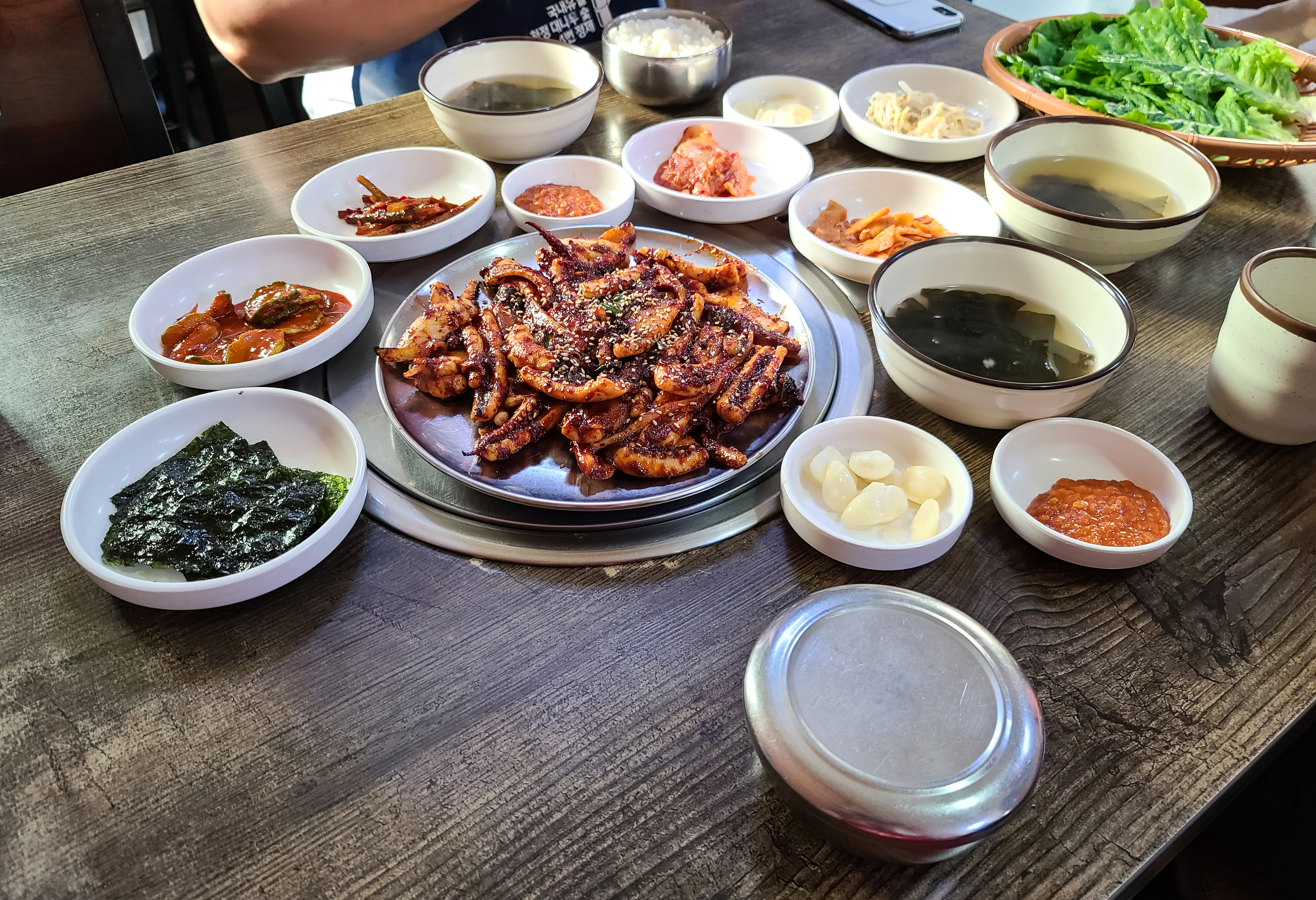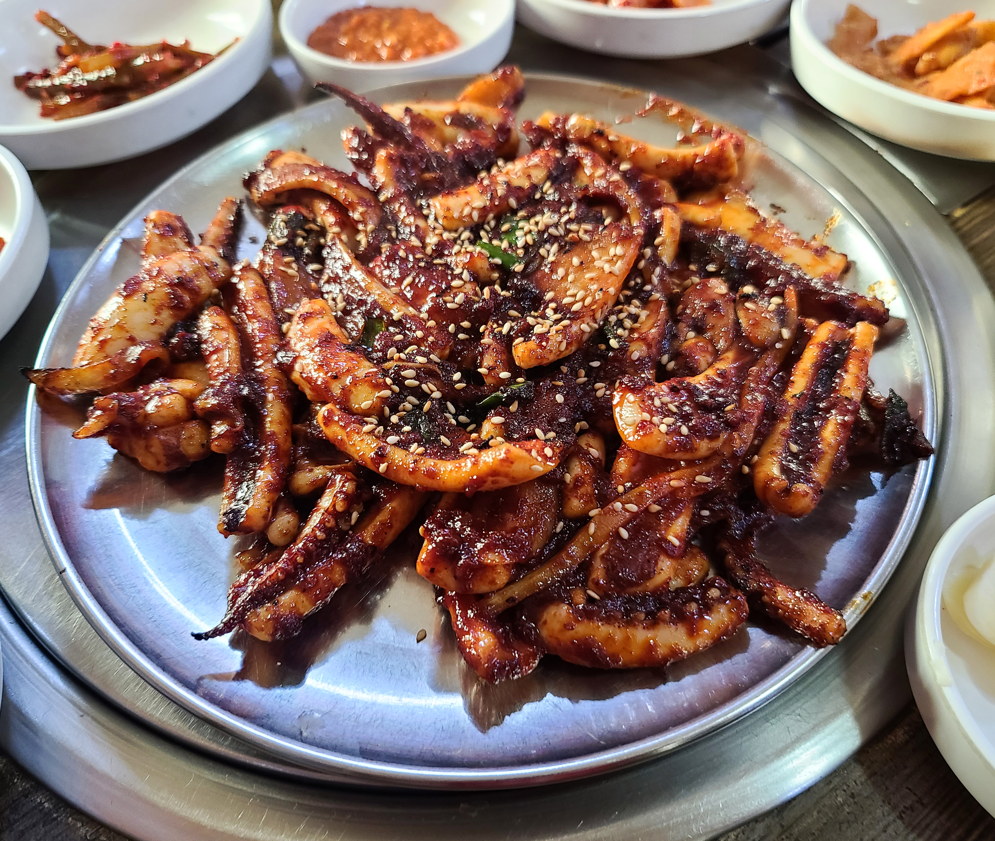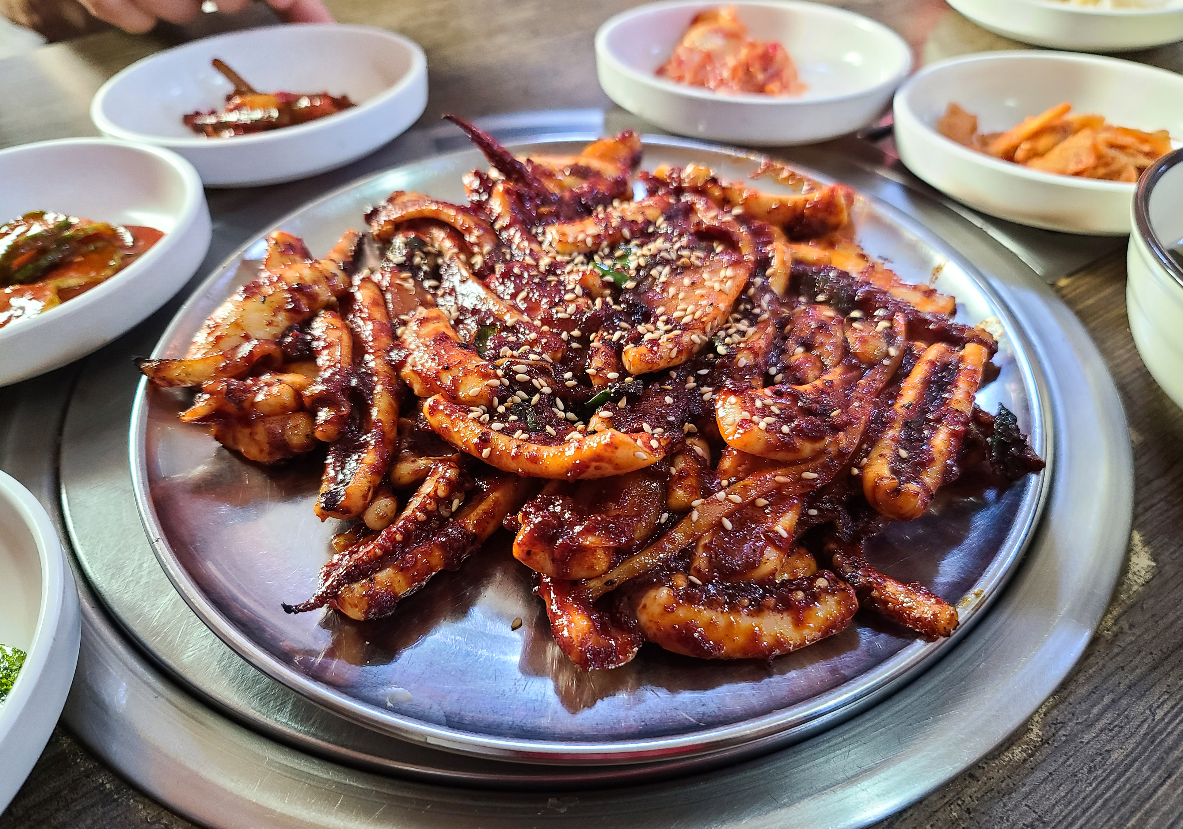 곧이어 반찬들과 함께 양지 석쇠불고기의 석쇠 매운 오징어가 나왔습니다. 석쇠 매운 오징어는 큼직큼직하게 썰은 오징어를 고추장 양념하여 석쇠에 구워내는 형태로 보였습니다.