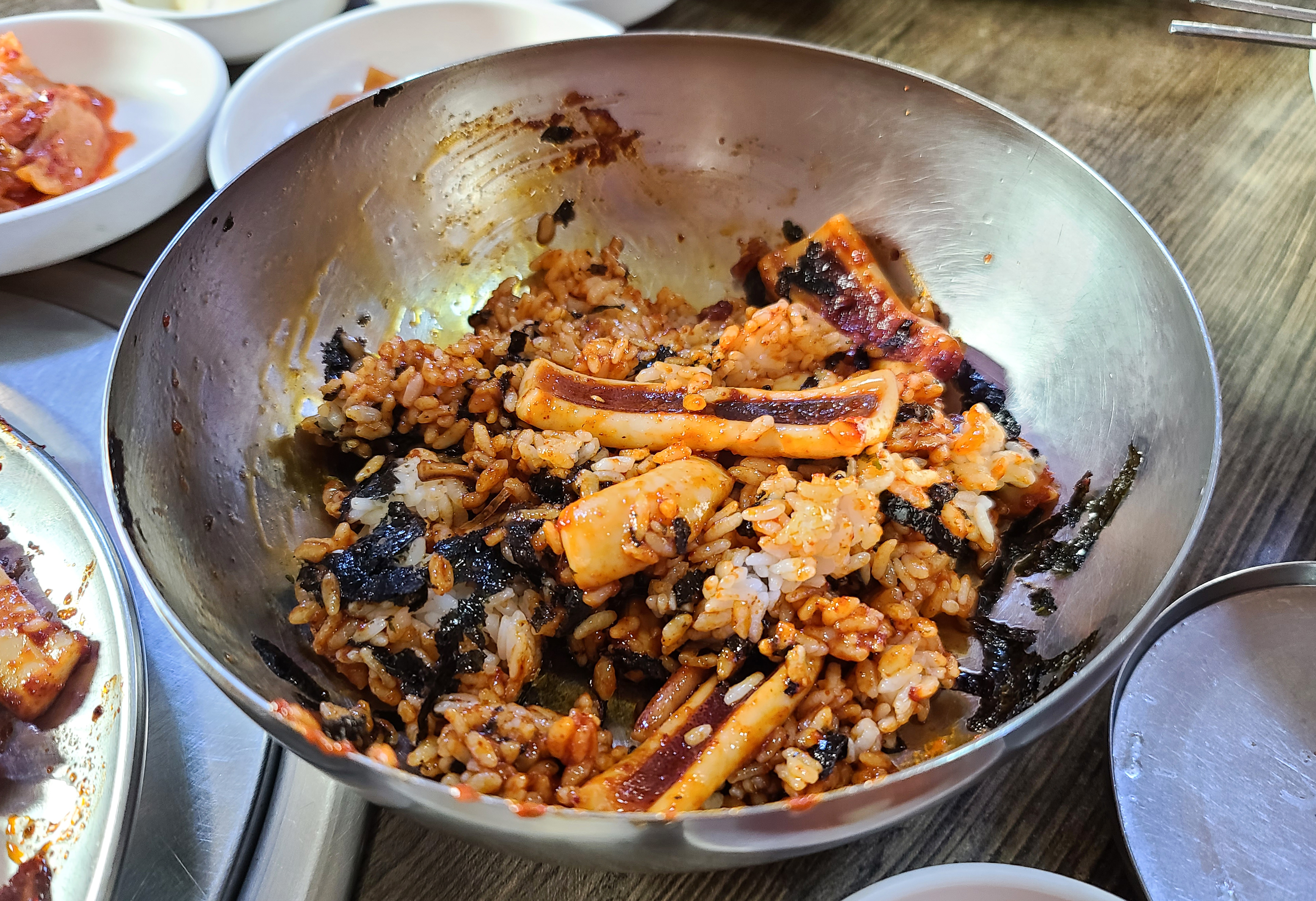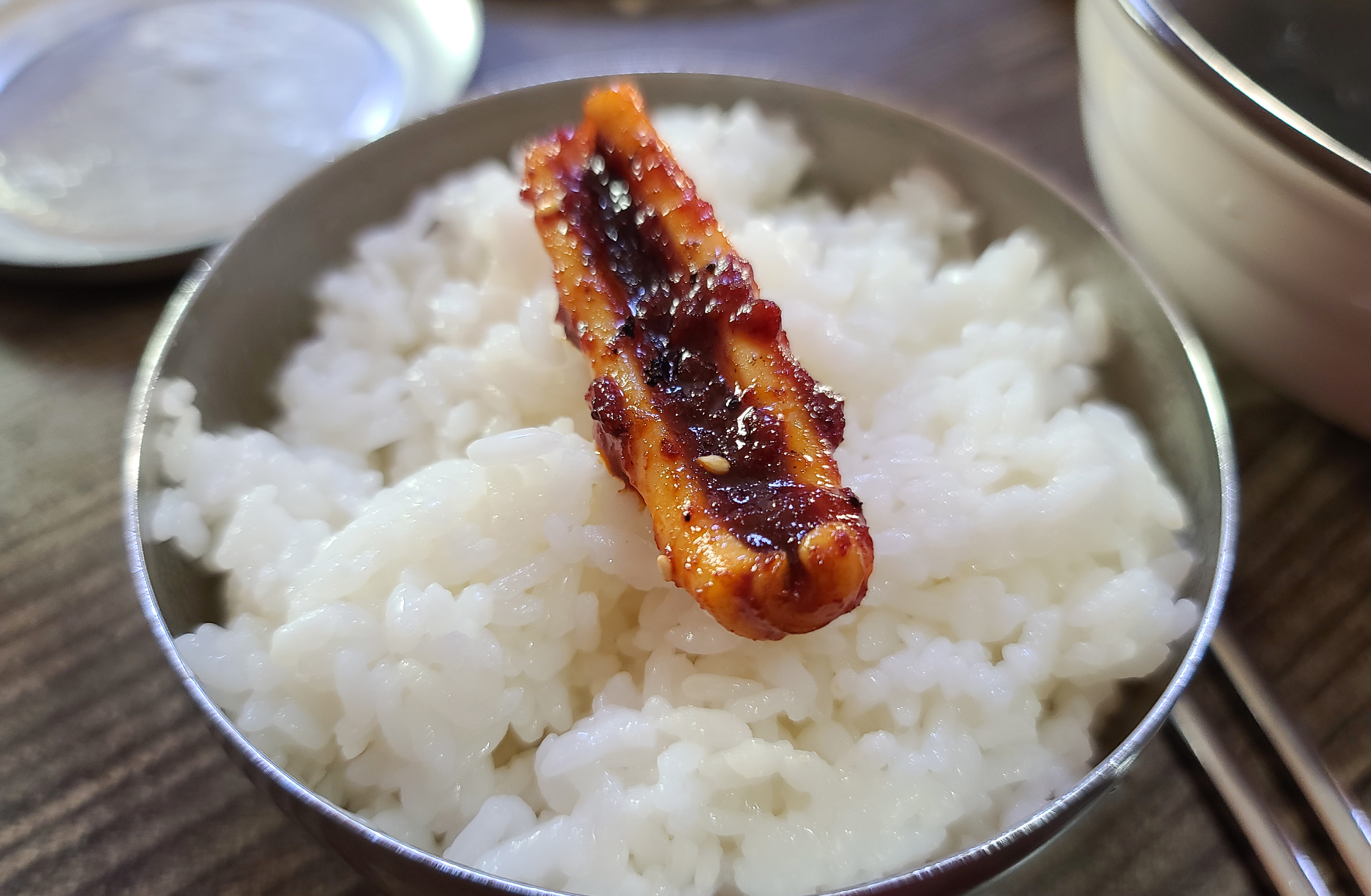 석쇠 매운 오징어를 대접에 밥이랑 양념 등을 추가하여 비벼먹을 수도 있었습니다. 오징어 볶음의 양을 워낙 감질나게 주는 바람에, 차마 비벼먹는 것은 못했고 맛만 좀 보는(?) 느낌이었어요. 맛은 같이 간 일행들 모두 괜찮게 여겼는데, 양은 많이 부족했었다는 느낌을 동시에 받은 것 같습니다.