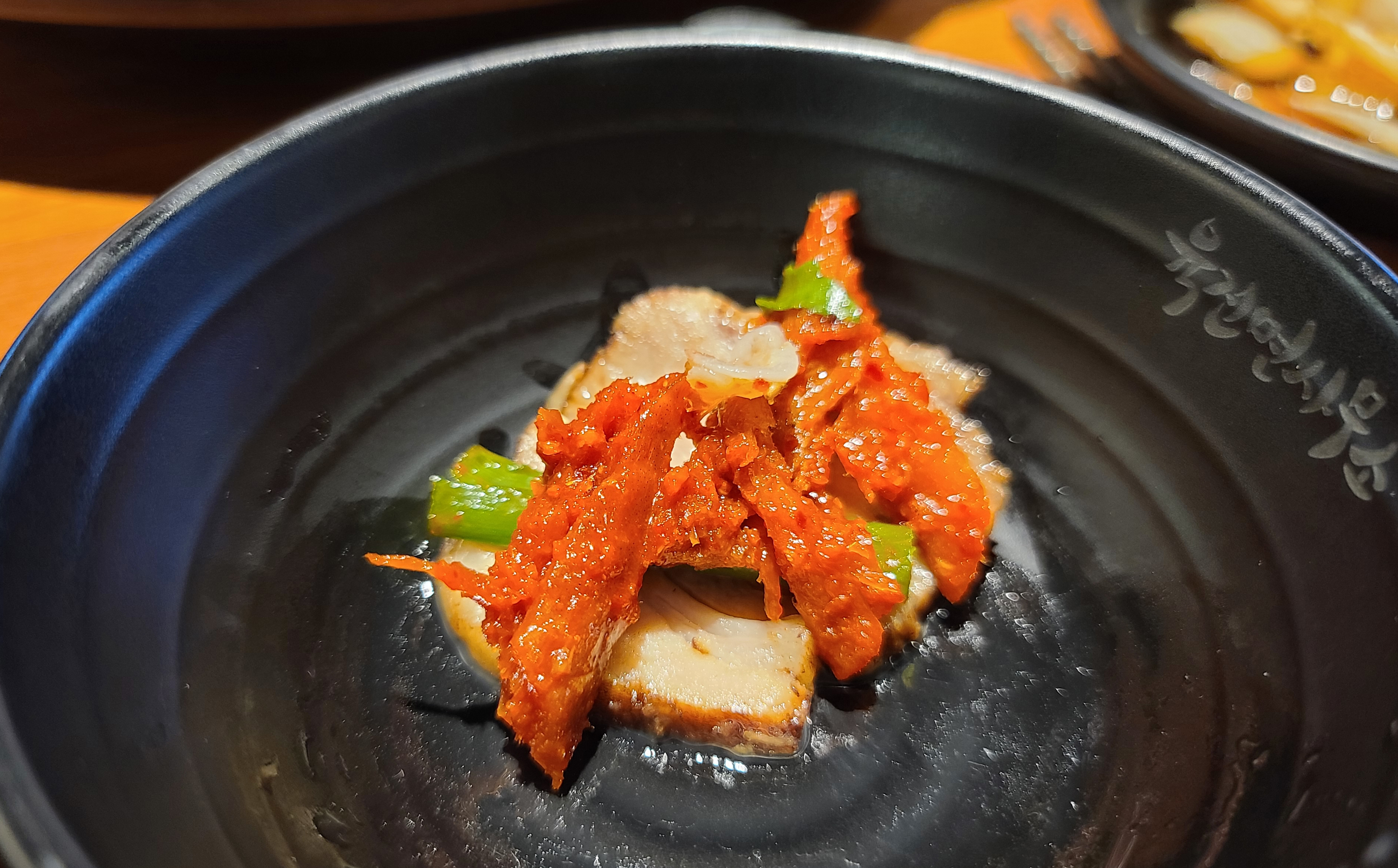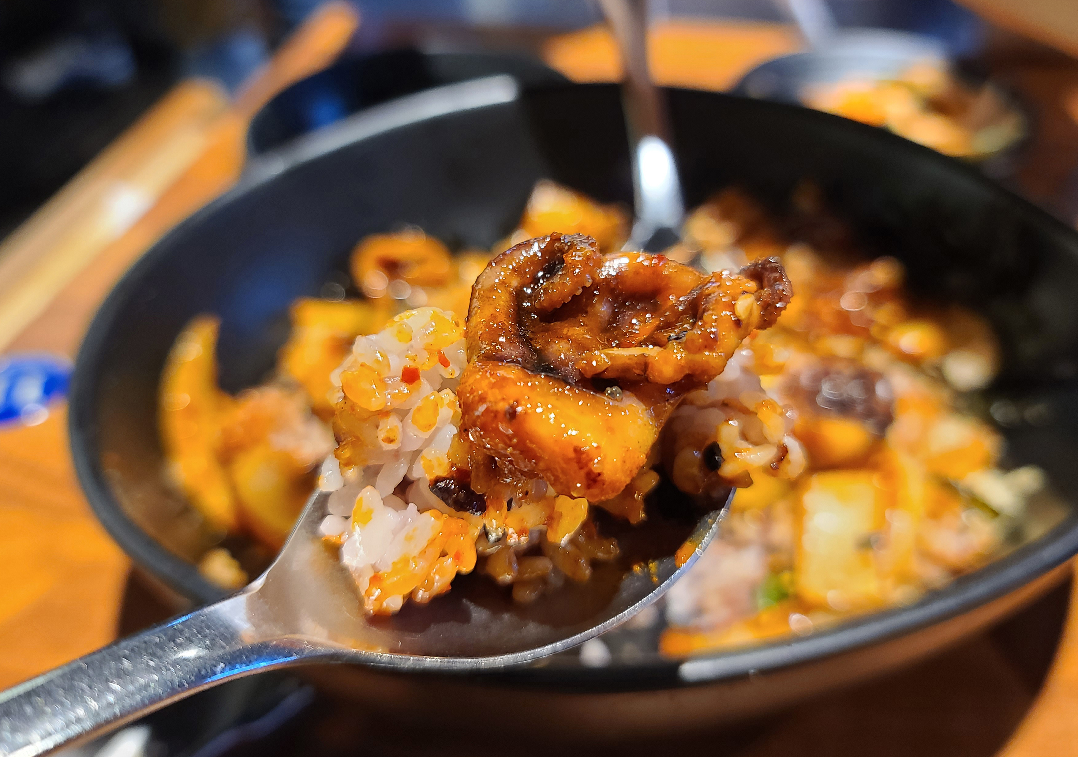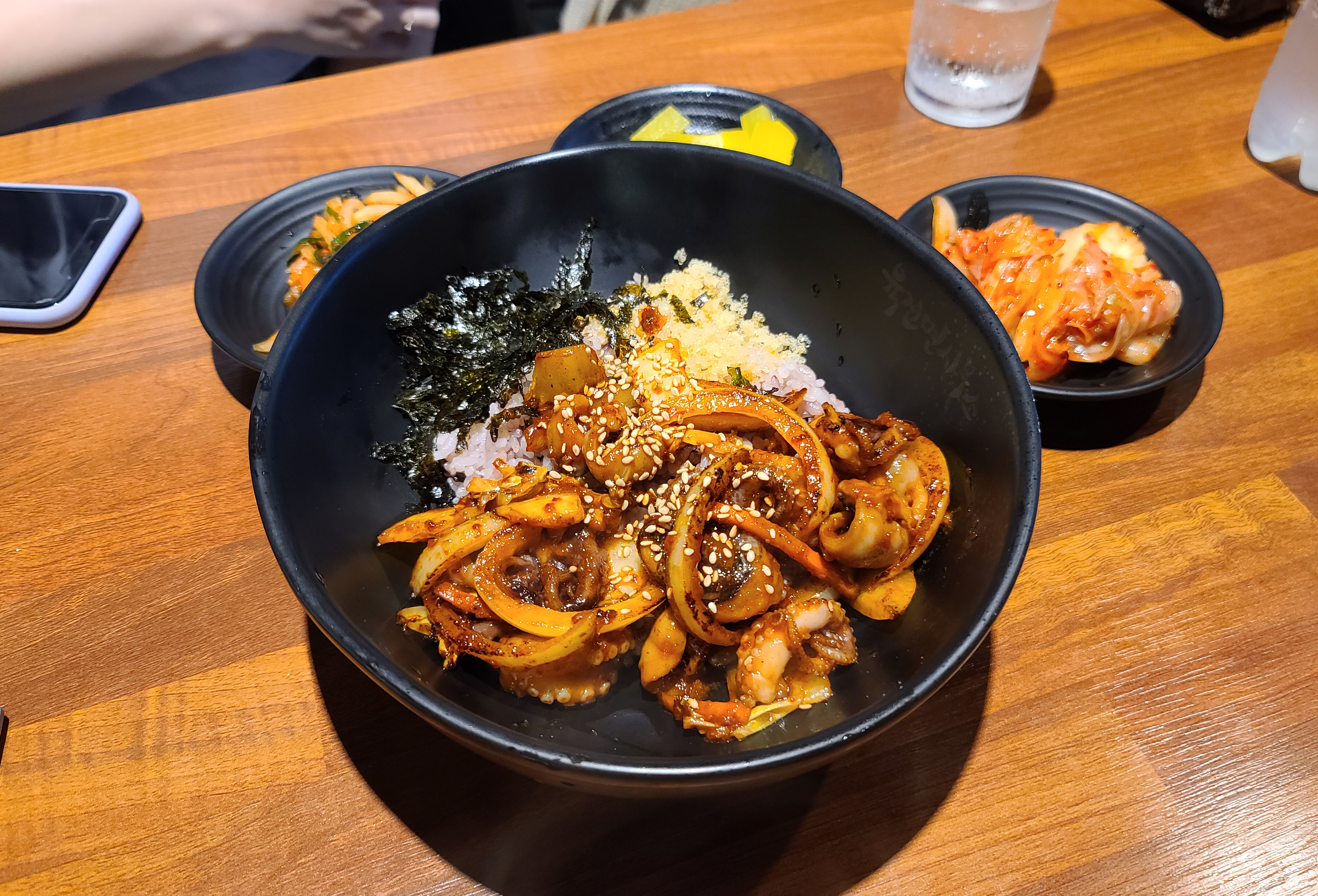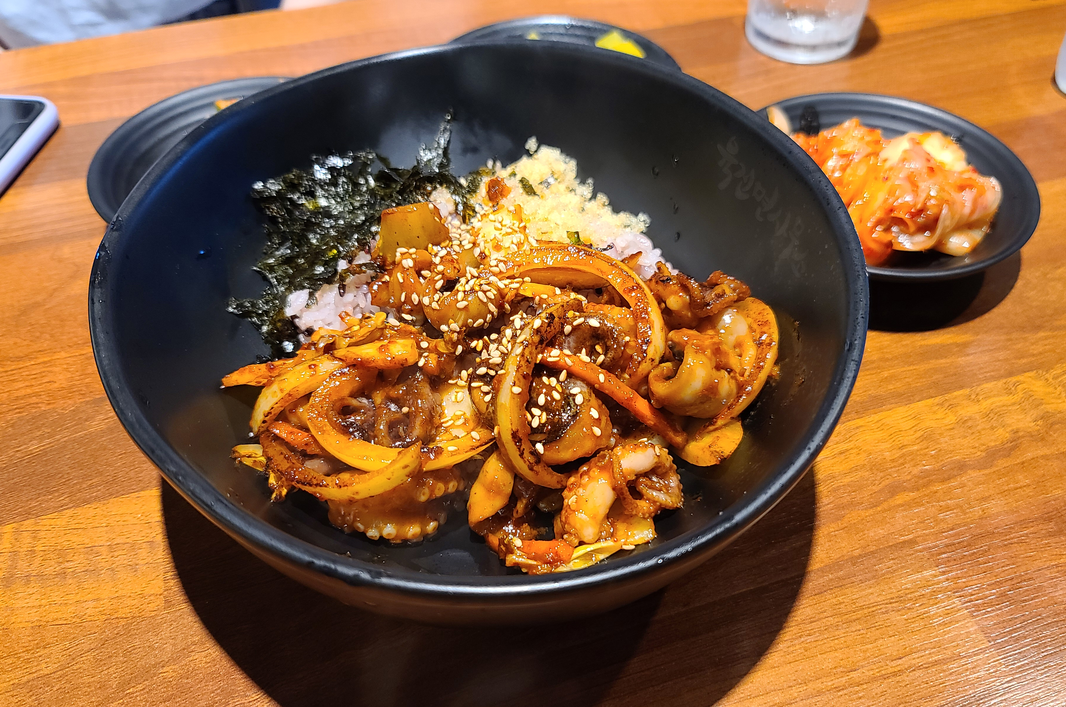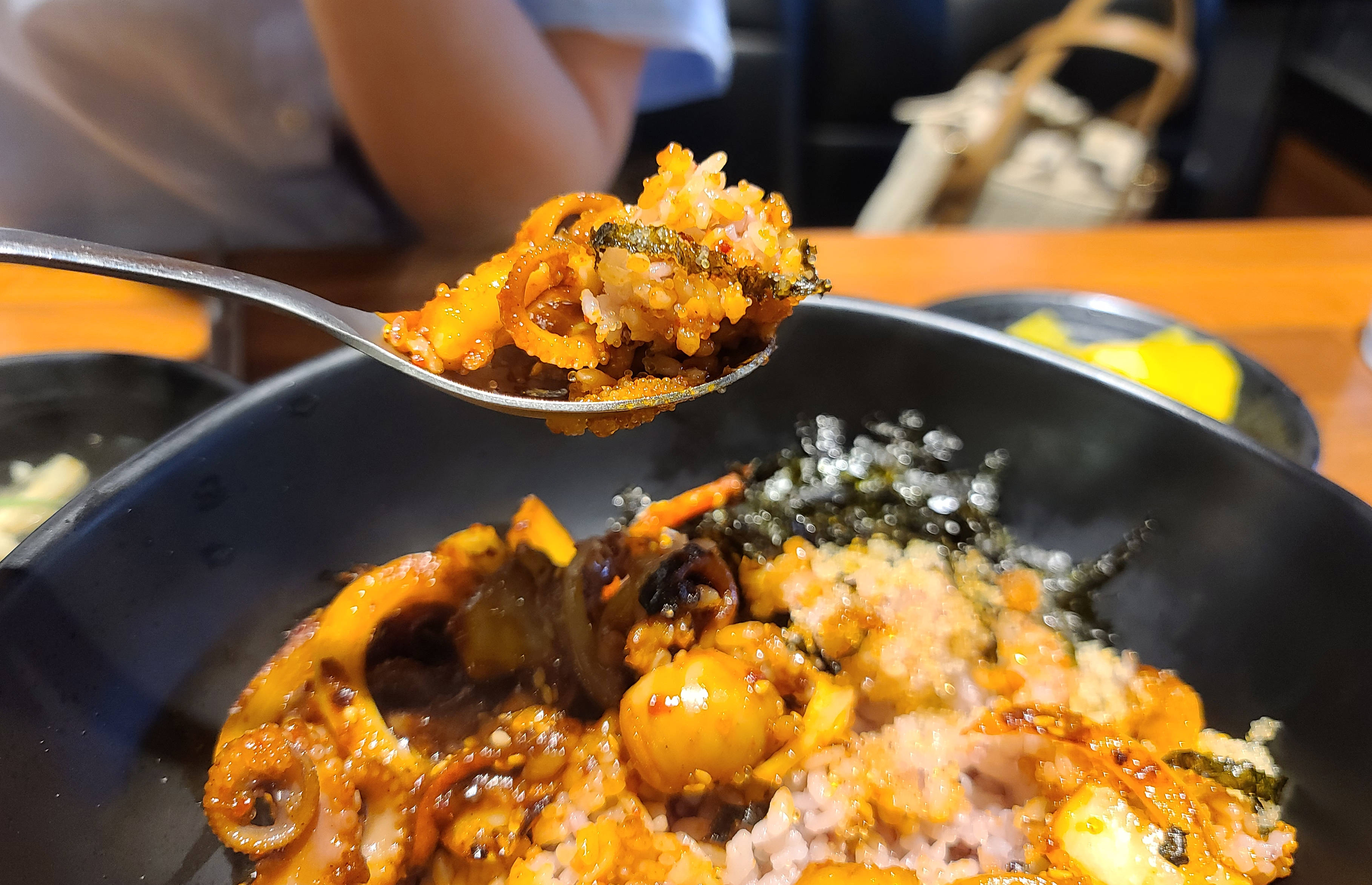 먼저 육전면사무소의 쭈꾸미알가득덮밥이 나왔습니다. 매콤한 주꾸미볶음과 날치알이 들어있는 이 메뉴는 더운 날 입맛을 돋우는 데 괜찮은 메뉴였습니다. 탱글탱글한 식감의 주꾸미는 매콤한 양념과 잘 어울렸습니다.