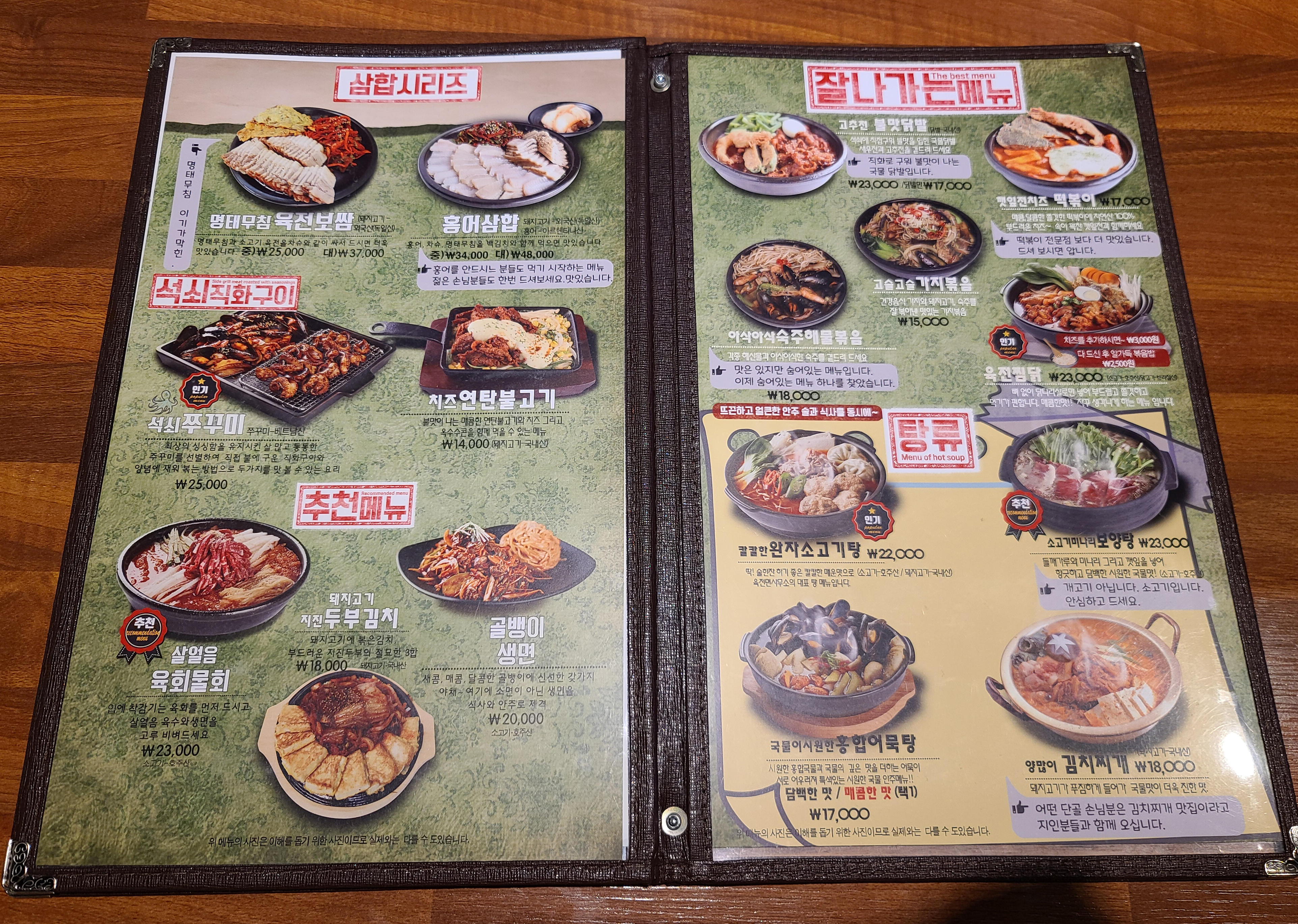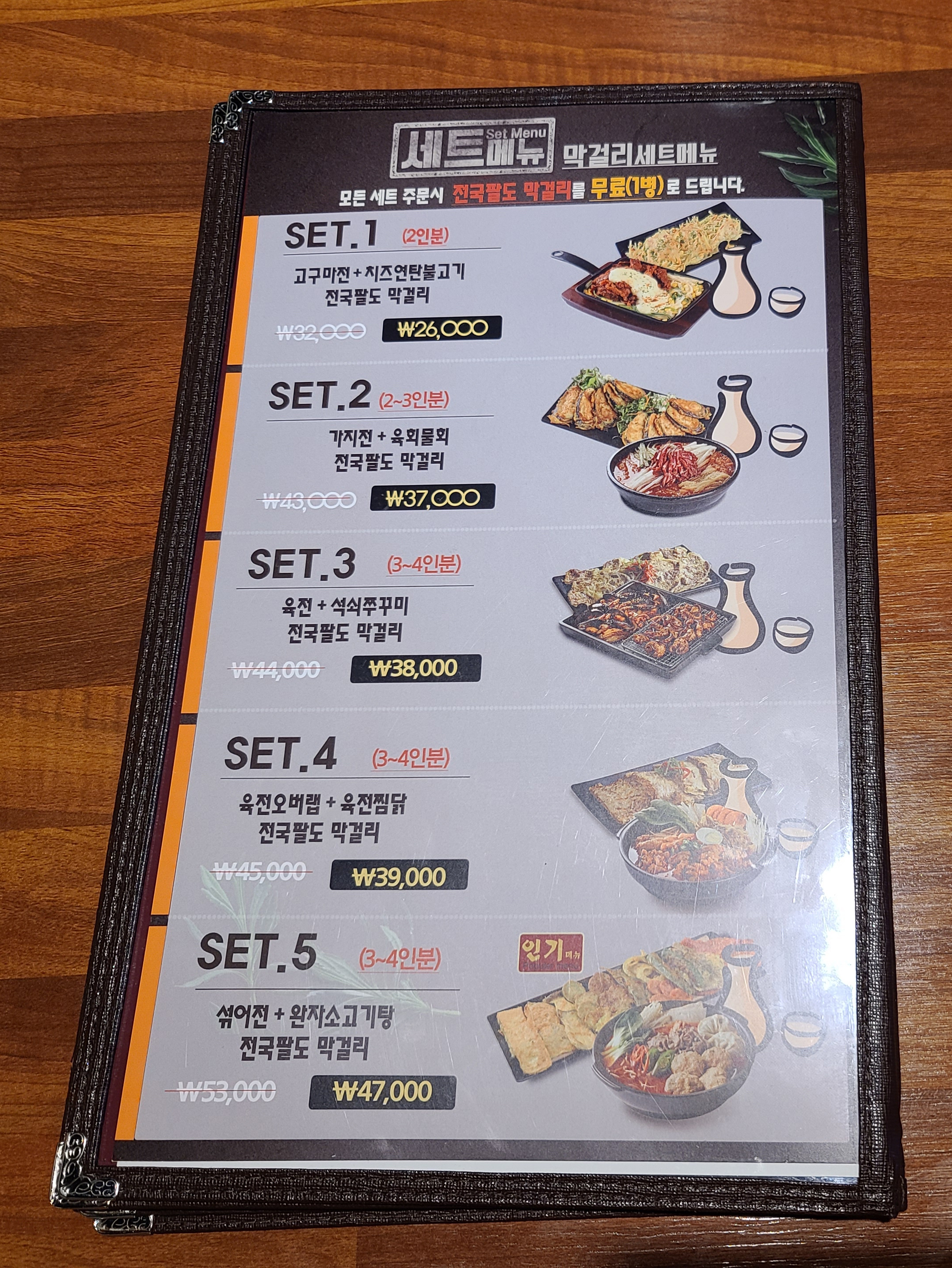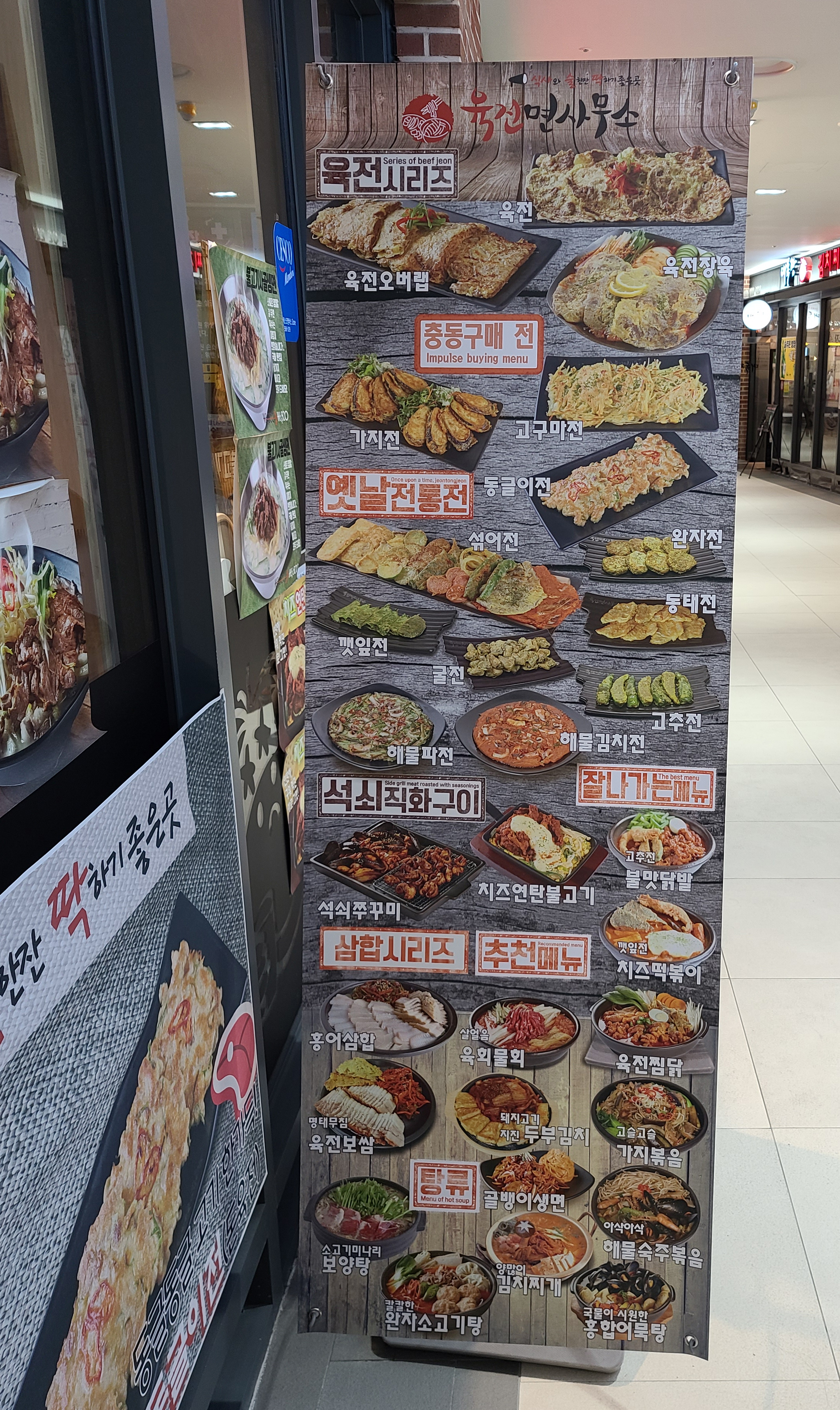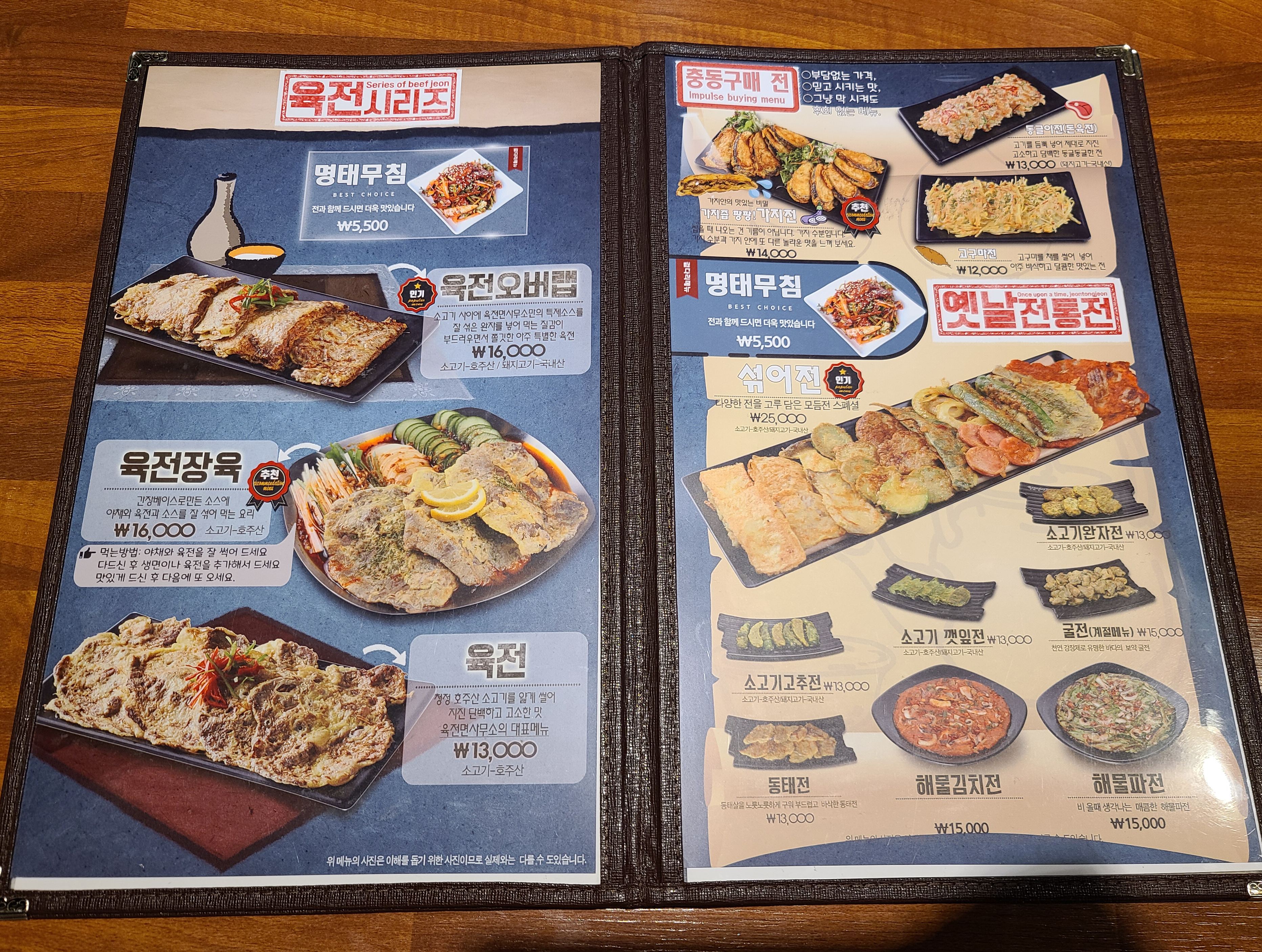 육전면사무소의 메뉴는 다음과 같았습니다. 불고기사골생면, 해장생면, 소고기생면, 자작생면, 커리생면, 육전냉면, 갈릭생면, 비빔생면, 직화연탄불고기덮밥, 쭈꾸미알가득덮밥, 직화불고기덮밥, 버섯소고기뚝배기, 육전비빔밥, 칼칼한완자소고기탕, 육전찜닭, 명태무침, 육전오버랩, 육전장육, 육전 등이 있었습니다. (저희는 육전냉면, 쭈꾸미알가득덮밥, 육전보쌈을 주문하였습니다.)