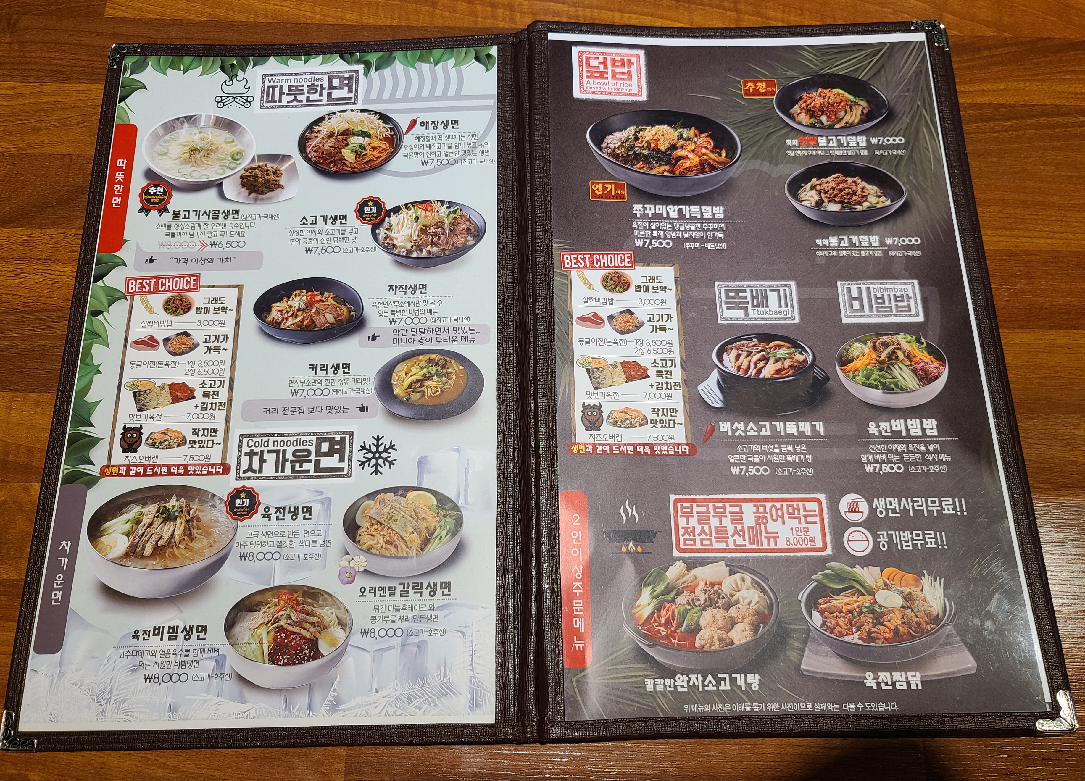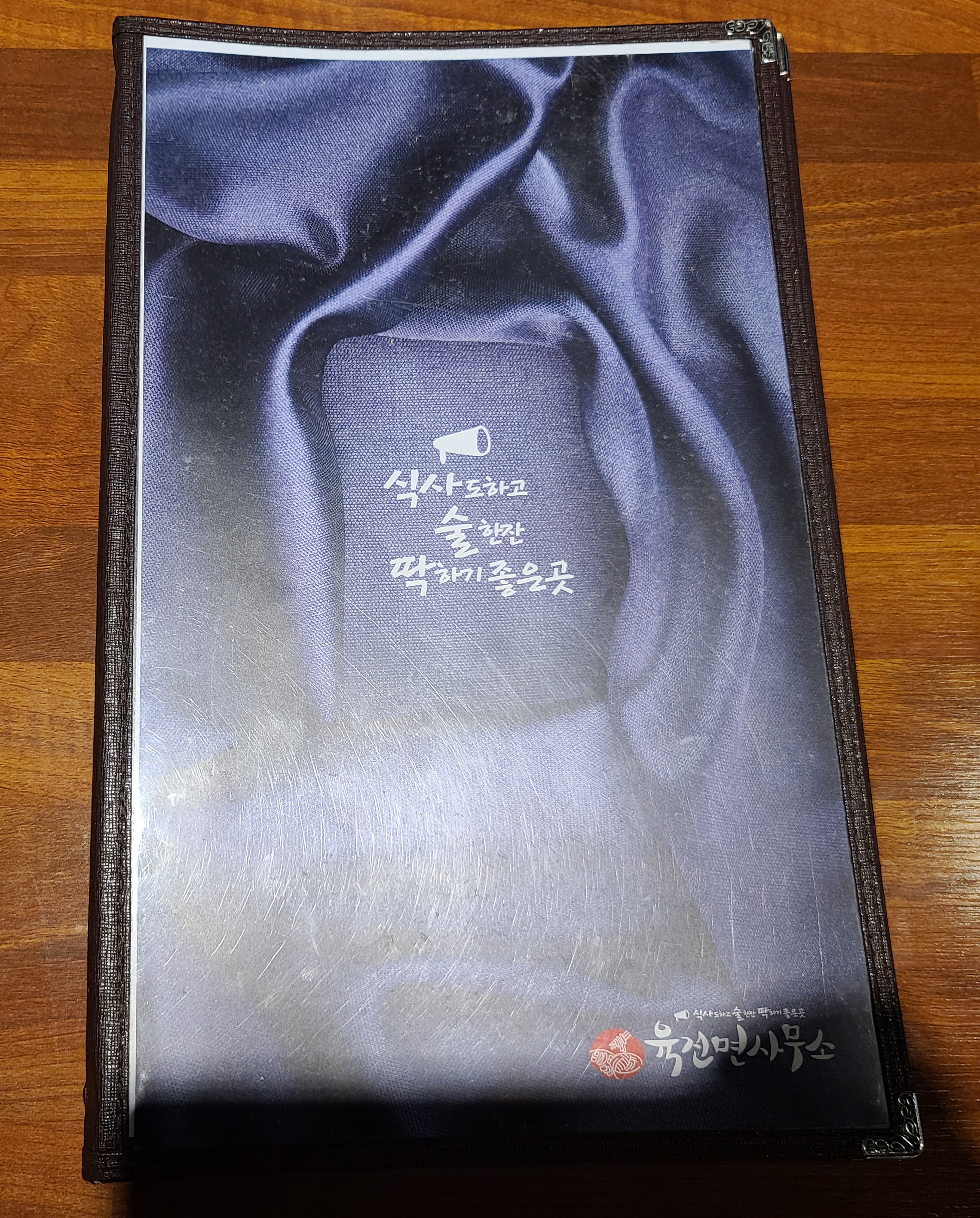 육전면사무소의 메뉴는 다음과 같았습니다. 불고기사골생면, 해장생면, 소고기생면, 자작생면, 커리생면, 육전냉면, 갈릭생면, 비빔생면, 직화연탄불고기덮밥, 쭈꾸미알가득덮밥, 직화불고기덮밥, 버섯소고기뚝배기, 육전비빔밥, 칼칼한완자소고기탕, 육전찜닭, 명태무침, 육전오버랩, 육전장육, 육전 등이 있었습니다. (저희는 육전냉면, 쭈꾸미알가득덮밥, 육전보쌈을 주문하였습니다.)