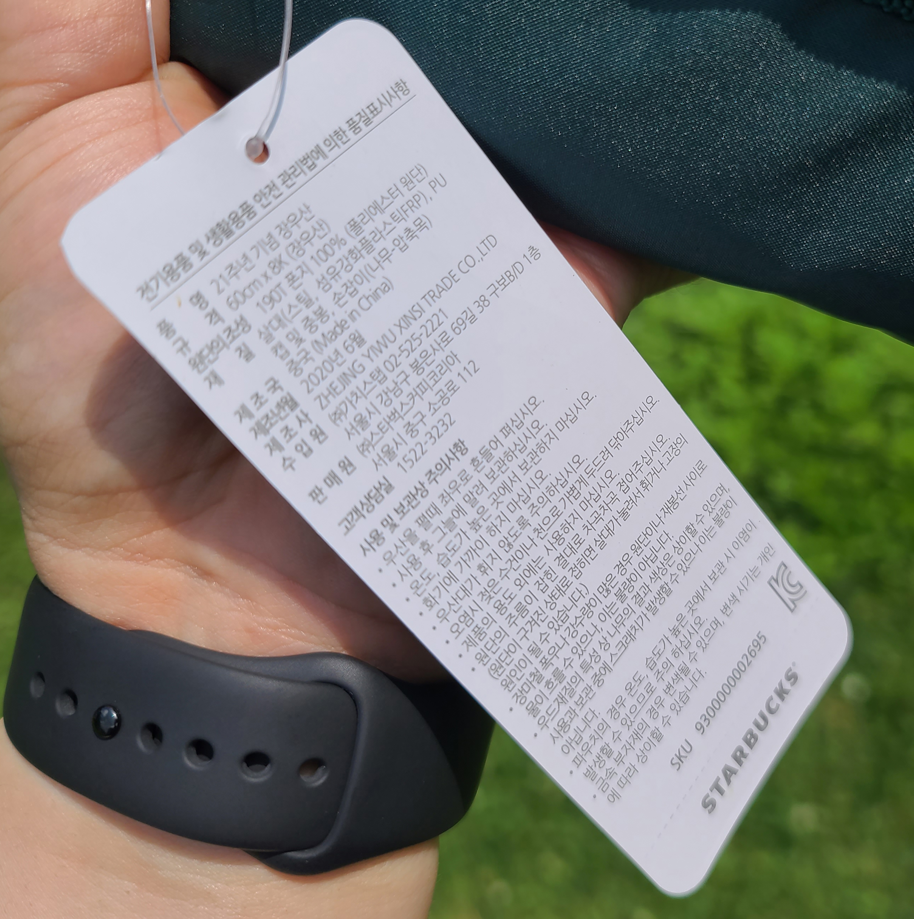스타벅스 우산의 1개당 가격은 25,000원으로 적당한 수준이었으며, 우산의 원단은 2겹으로 되어있어 오늘같이 자외선이 강한 날 차단도 꽤 잘 되는 편이었고 중봉이나 손잡이의 소재도 우드로 마감되어 괜찮아 보였습니다. 제가 원래 사용 중이던 우산은 독일에서 제조되었지만, 스타벅스에서 MD로 구입한 제품은 중국에서 제조되었고요. 2020년 6월 생산되었다고 알려주고 있었습니다.