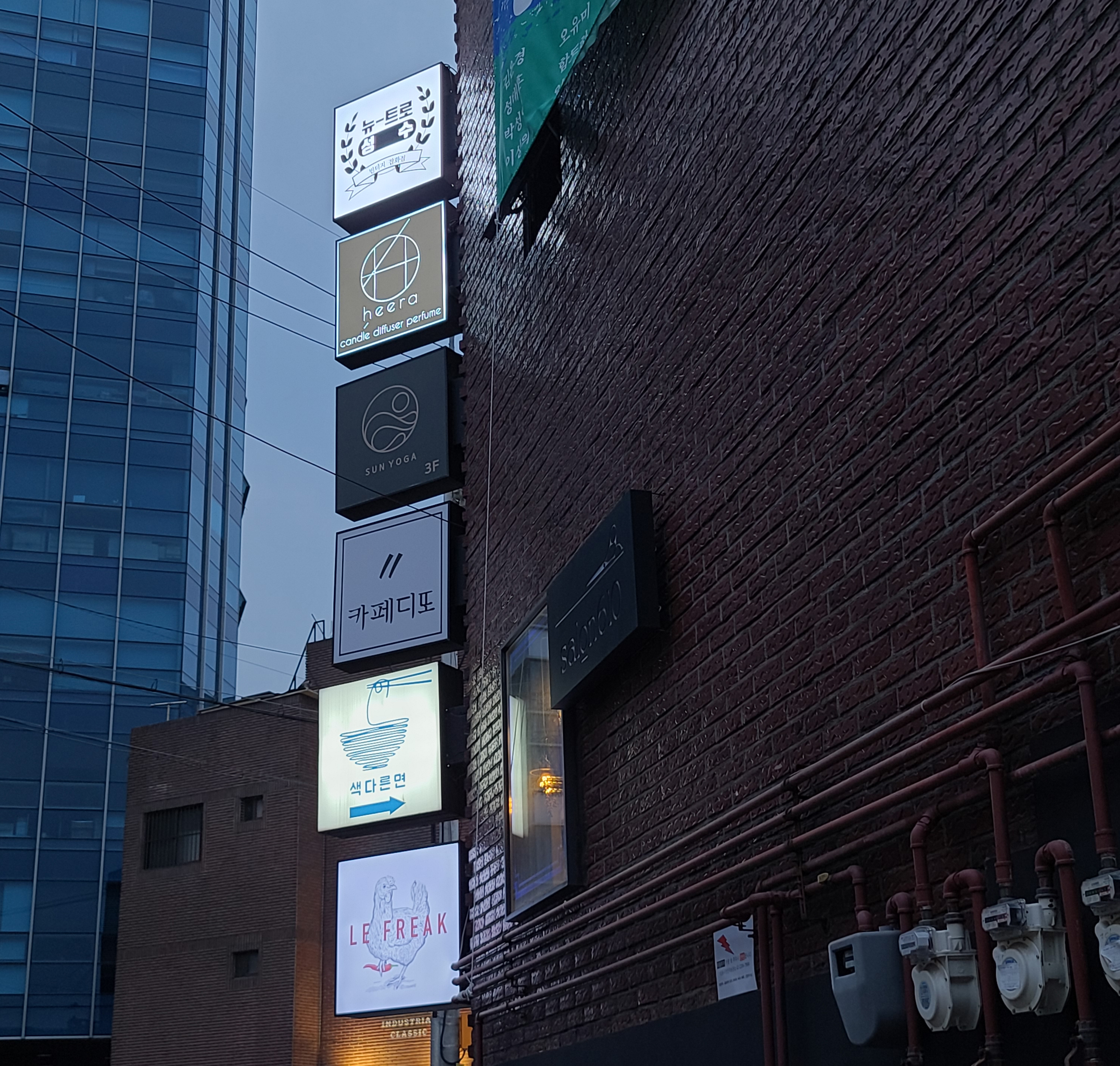 치킨버거 전문점 르 프리크가 위치한 건물은 독특하게 간판도 통일감 있게 설치하고, 가게들의 분위기도 비슷하게 꾸며져 분위기가 있었습니다. 건물의 1층에 위치한 르프리크는 항상 손님들로 문전성시였는데요, 이 날도 대기줄을 20여분 선 뒤 식사를 할 수 있었습니다.