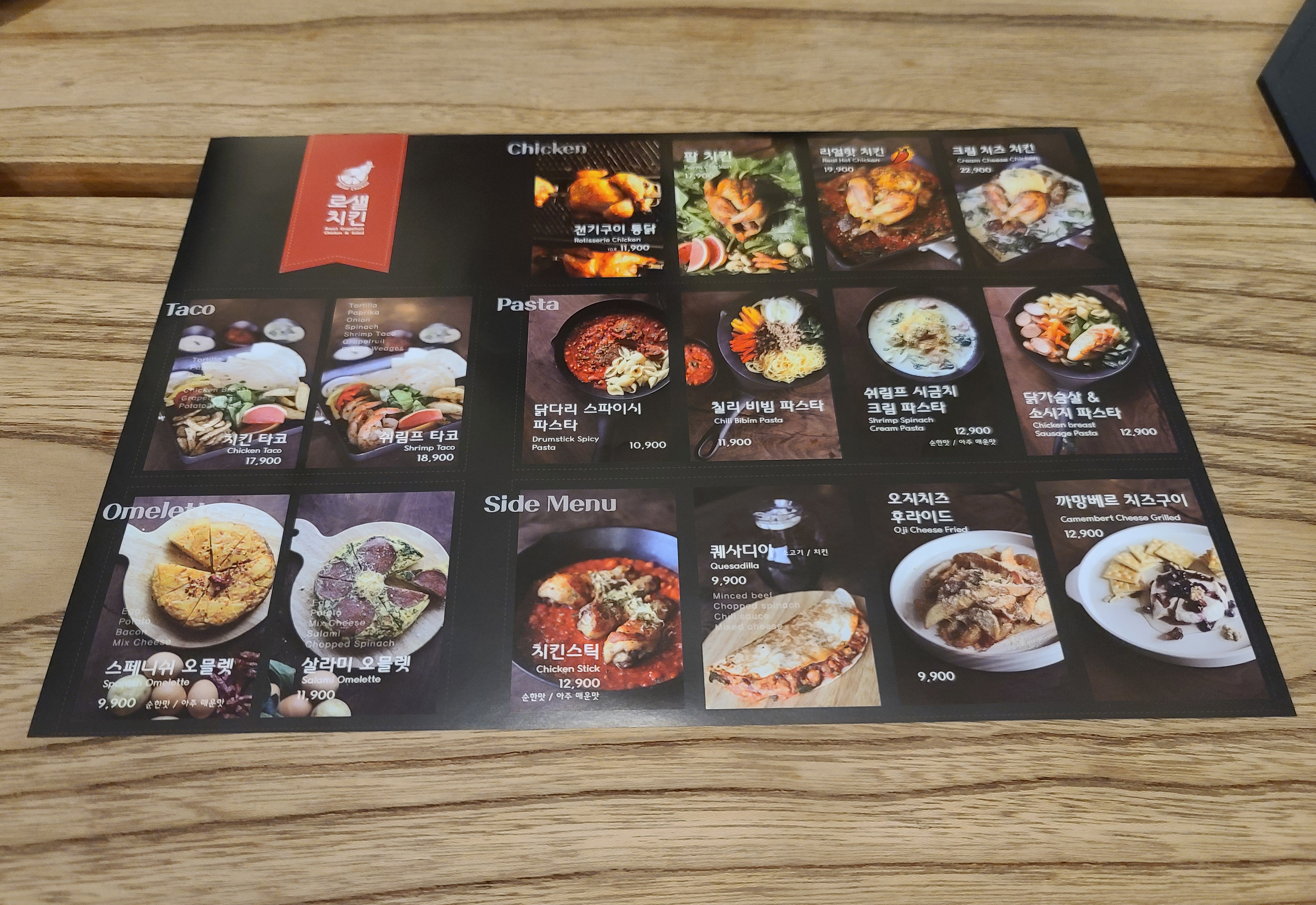 로샐치킨의 메뉴를 살펴보면, 치킨타코, 쉬림프타코, 스페니쉬오믈렛, 살라미오믈렛, 전기구이통닭, 팜치킨, 리얼핫치킨, 크림치즈치킨, 닭다리스파이시파스타, 칠리비빔파스타, 쉬림프시금치크림파스타, 닭가슴살소세지파스타, 치킨스틱, 퀘사디아, 오지치즈후라이드, 까망베르치즈구이 등 이 있었습니다. (저희는 크림치즈 치킨과 음료를 주문했습니다.)