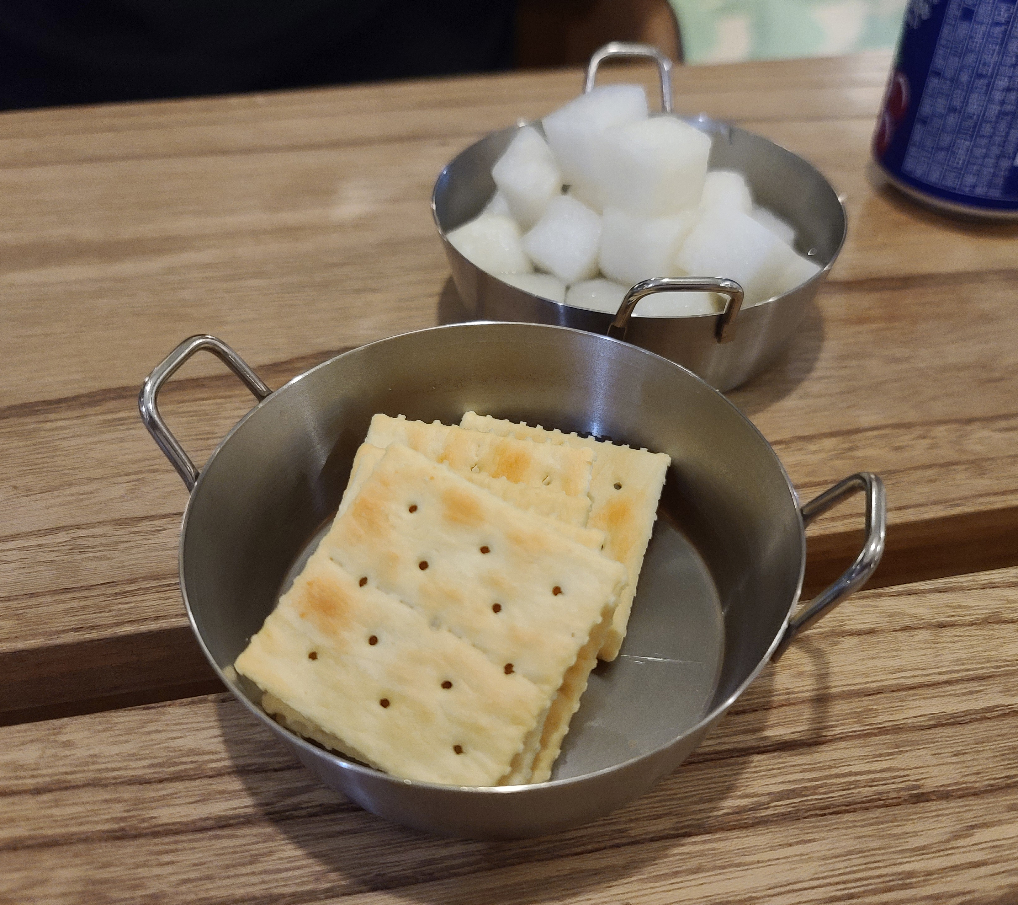 주문한 메뉴가 나오기를 기다리는 동안, 치킨무와 소금 비스킷이 제공되었습니다. 물론 치킨을 먹을 포크와 나이프도 제공되었습니다. 곧이어 주문한 크림치즈 치킨이 나왔습니다.
