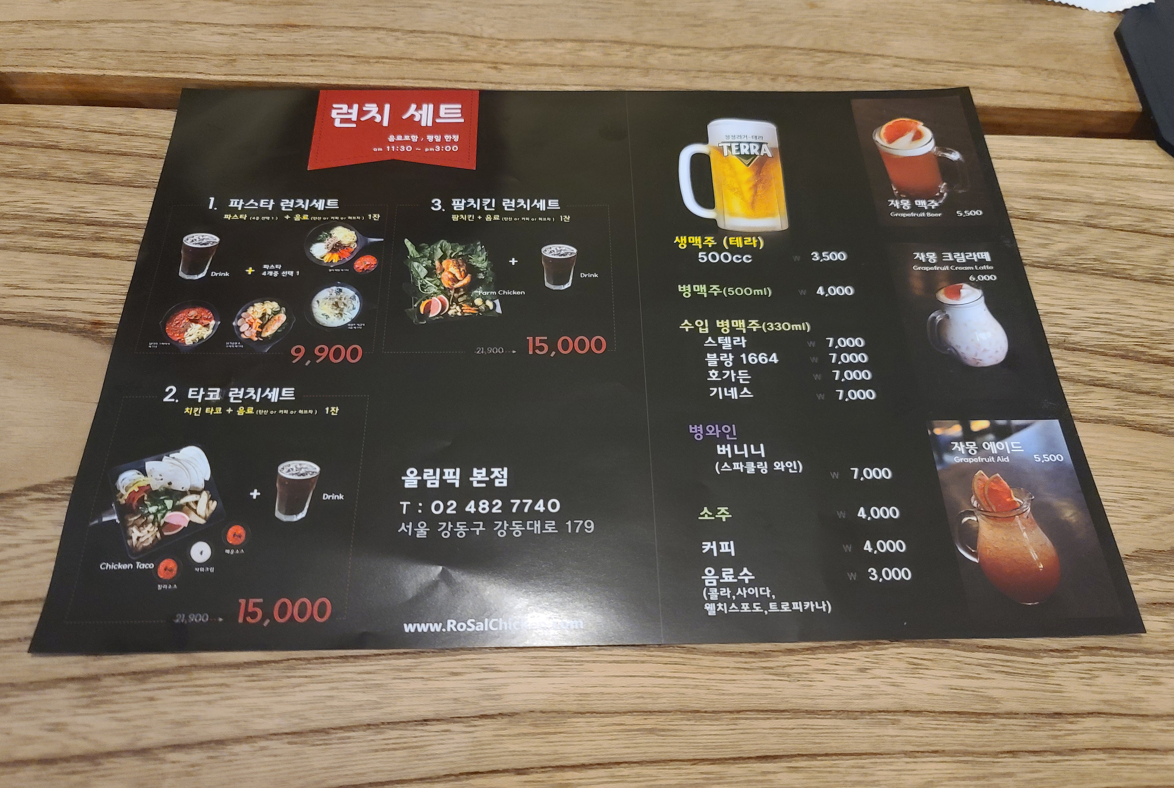 로샐치킨의 메뉴를 살펴보면, 치킨타코, 쉬림프타코, 스페니쉬오믈렛, 살라미오믈렛, 전기구이통닭, 팜치킨, 리얼핫치킨, 크림치즈치킨, 닭다리스파이시파스타, 칠리비빔파스타, 쉬림프시금치크림파스타, 닭가슴살소세지파스타, 치킨스틱, 퀘사디아, 오지치즈후라이드, 까망베르치즈구이 등 이 있었습니다. (저희는 크림치즈 치킨과 음료를 주문했습니다.)