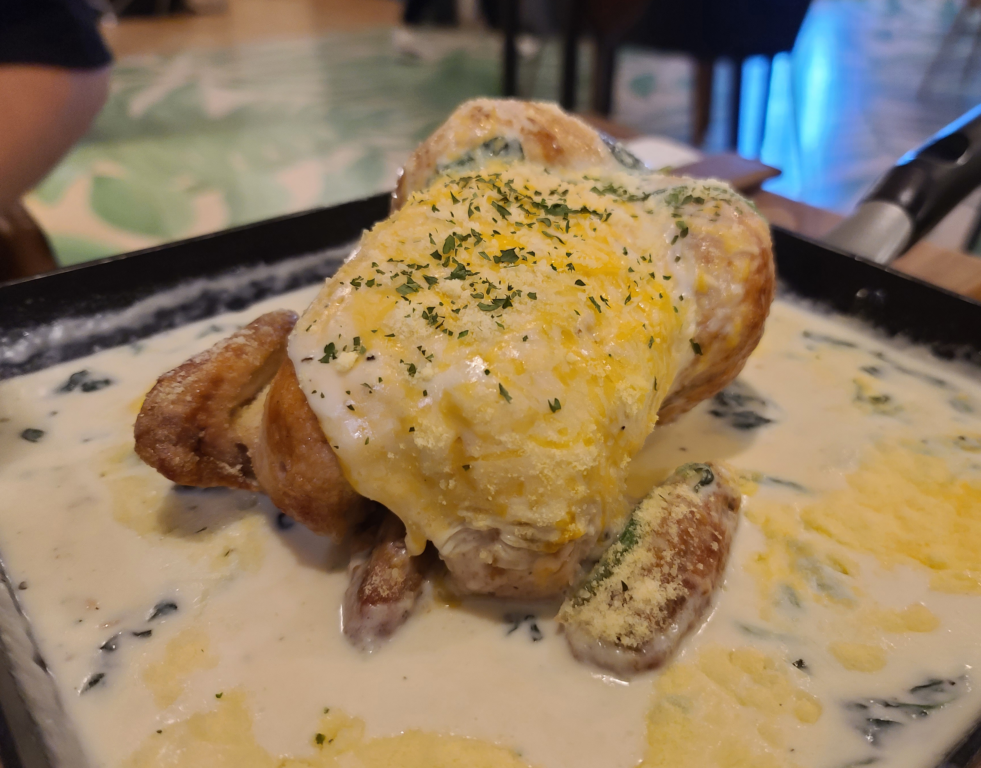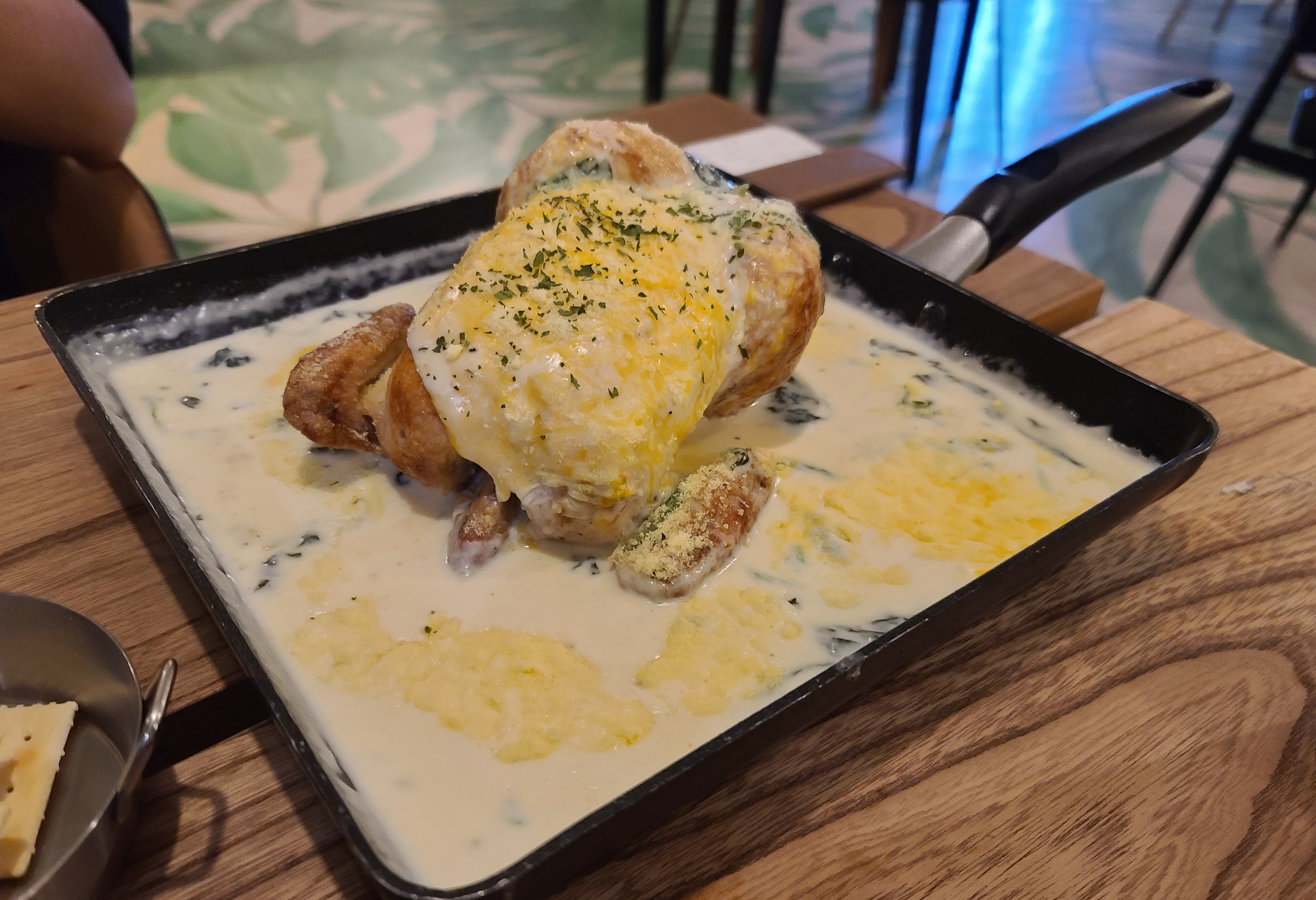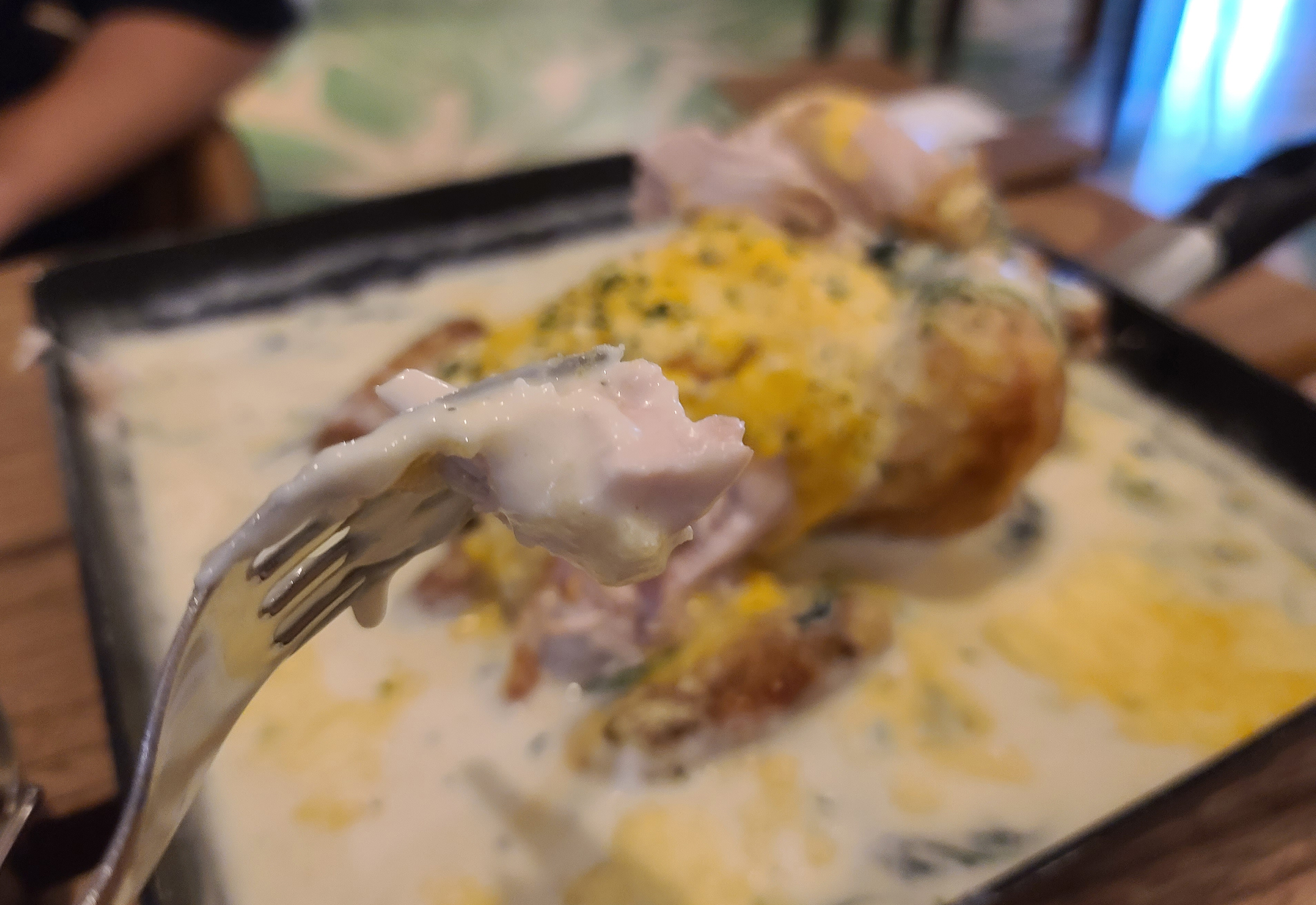 로샐치킨 크림치즈 치킨은 위와 같이 생겼습니다. 처음 시켜보는 메뉴라 괜찮을지 걱정되었는데, 먹어보니 "아,, 잘못시켰다" 싶더라고요. 일단 크림치즈 치킨을 설명드리자면'전기구이 통닭에 크림스프를 얹어놓은 느낌(?)', '기대했던 맛보다는 밋밋한 맛' 이었습니다.