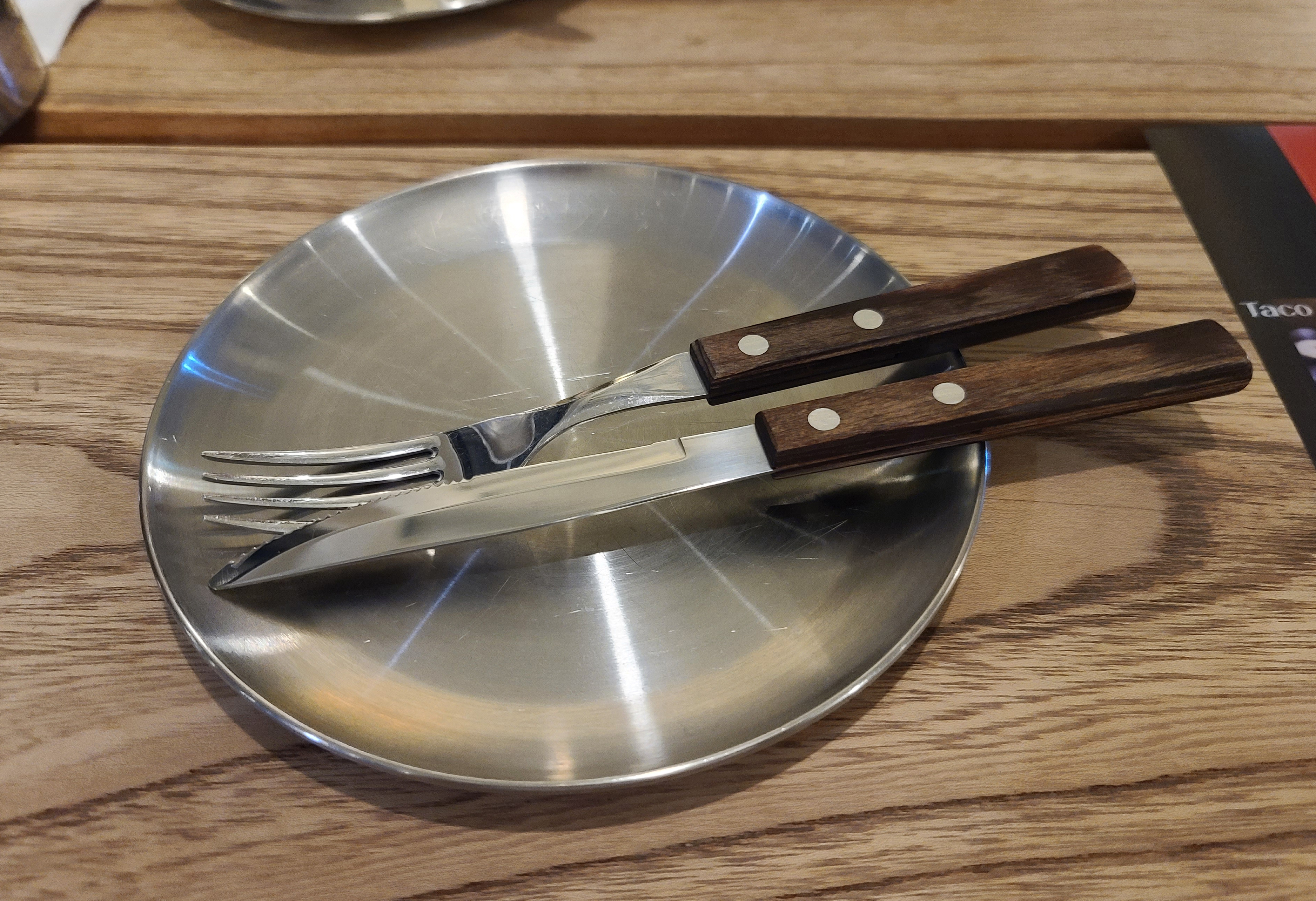 주문한 메뉴가 나오기를 기다리는 동안, 치킨무와 소금 비스킷이 제공되었습니다. 물론 치킨을 먹을 포크와 나이프도 제공되었습니다. 곧이어 주문한 크림치즈 치킨이 나왔습니다.