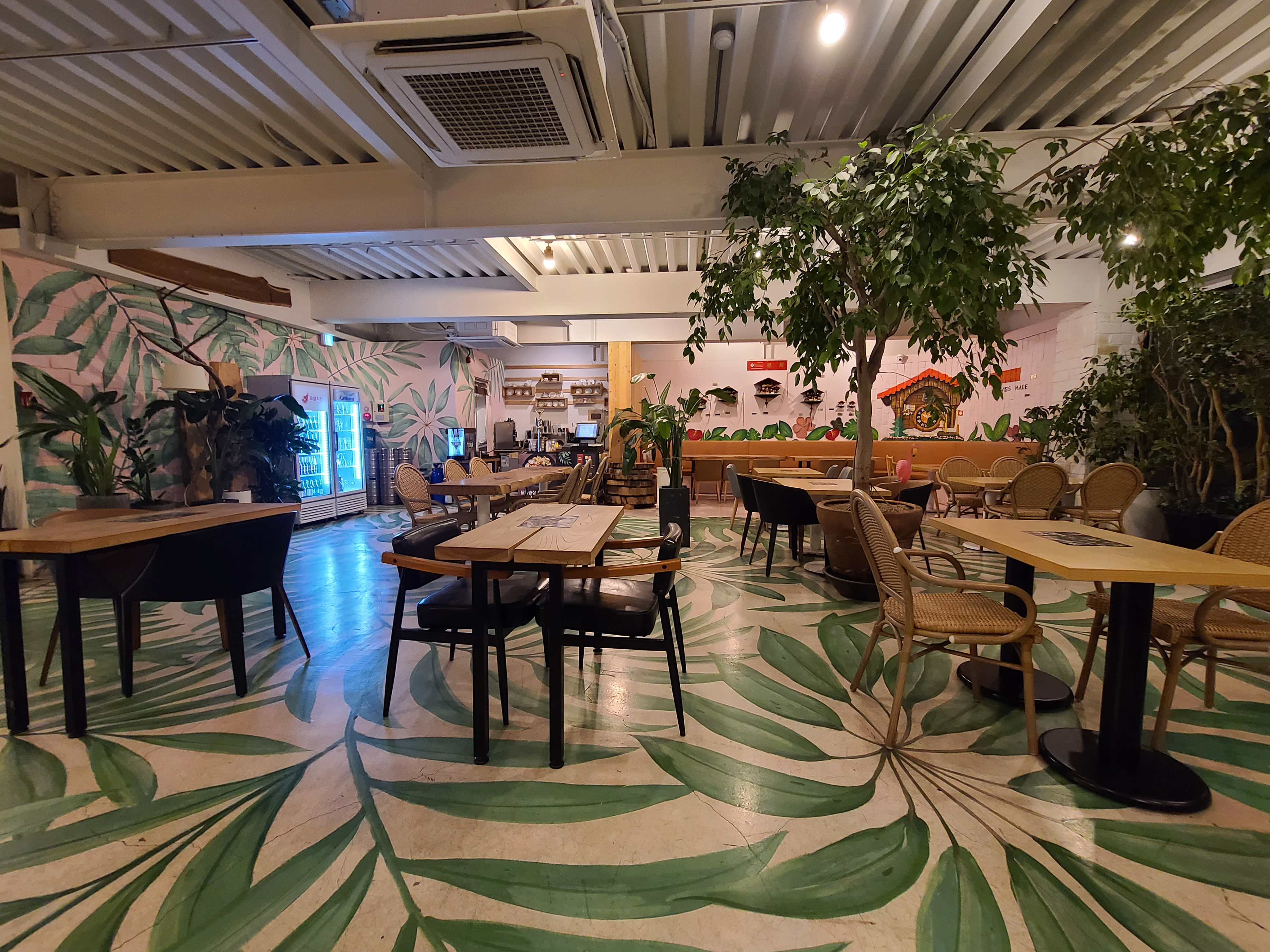 로샐치킨 1층은 포장과 배달 위주로 판매하고 있었고, 2층으로 올라가면 매장 내 식사할 수 있는 공간이 있었습니다. 자연을 모티브로 한 것인지 곳곳에 수풀 무늬와 나무 분재가 눈에 띄었습니다.