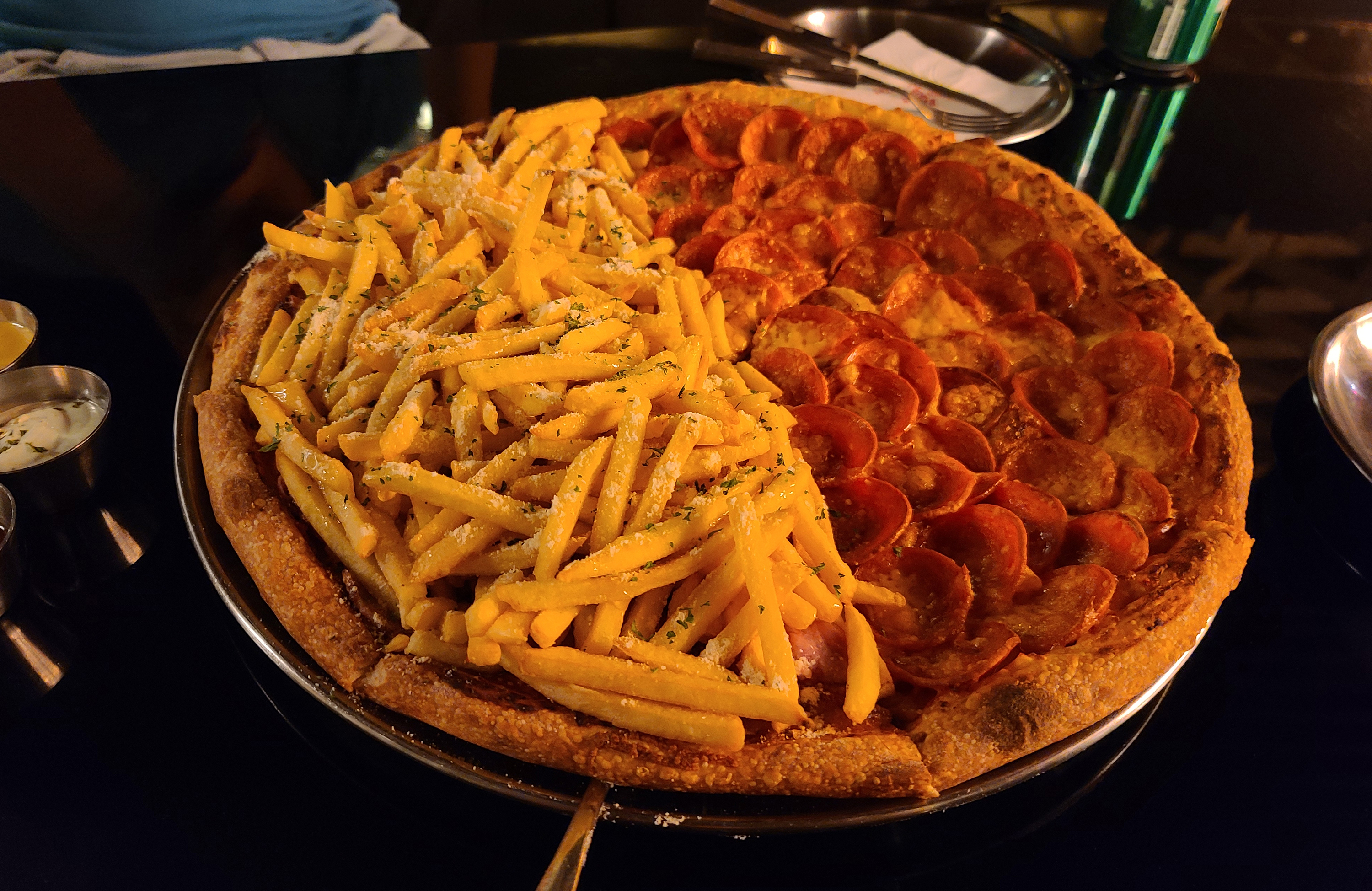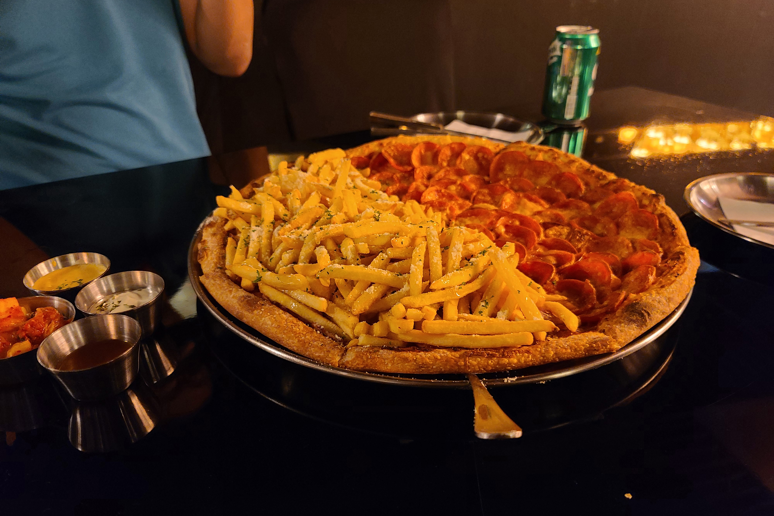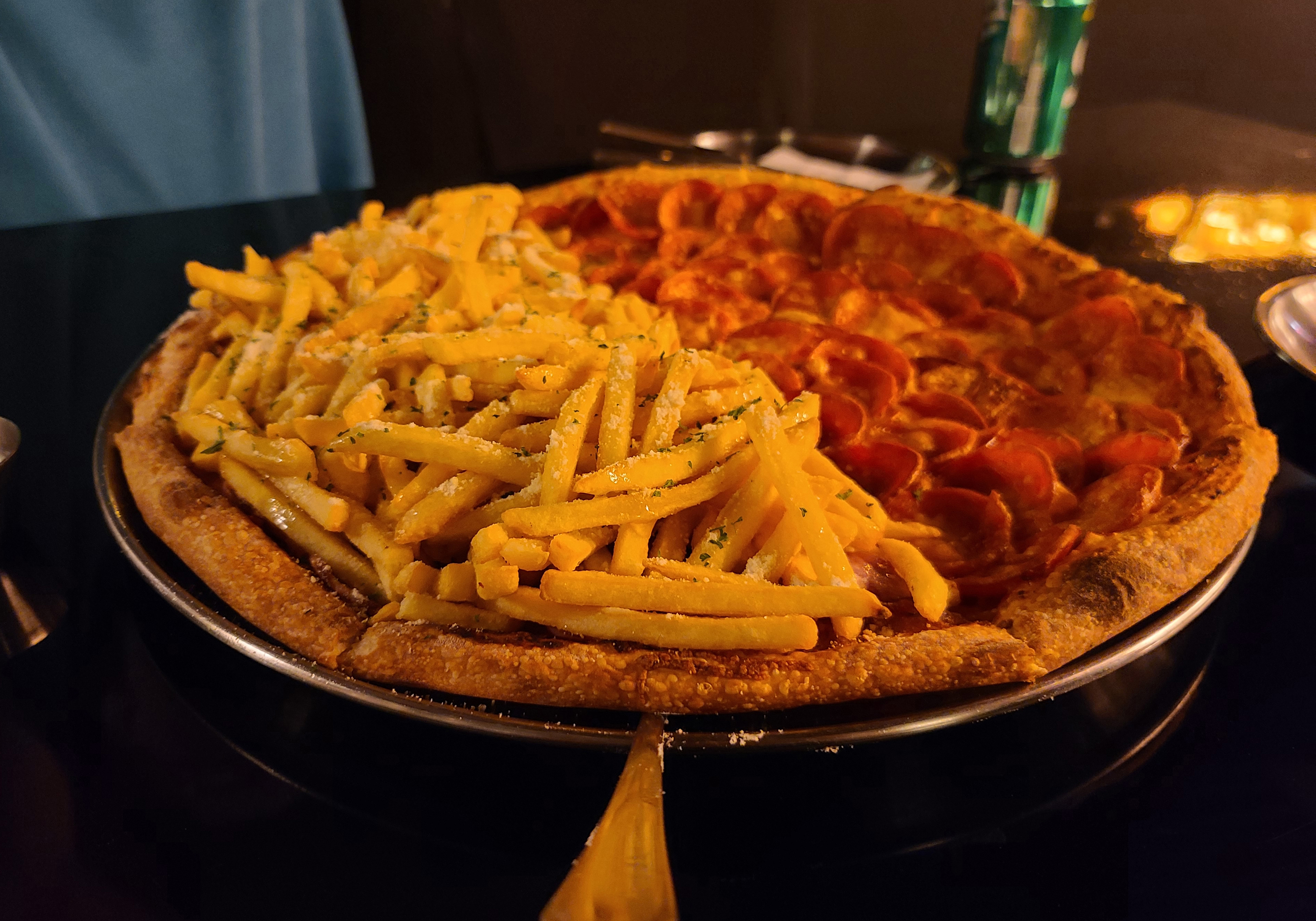 곧 주문한 피자가 나왔습니다. 더블페퍼로니와 포테이토인데, 더블페퍼로니는 흔히 있을법한 비주얼인데 포테이토는 확실히 압도적인 양의 감자튀김과 시즈닝이 인상적이었죠.