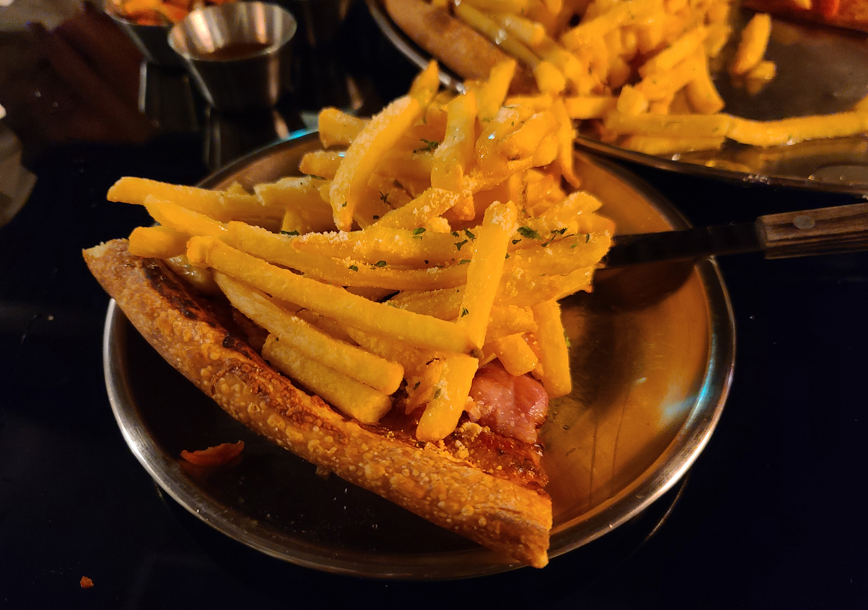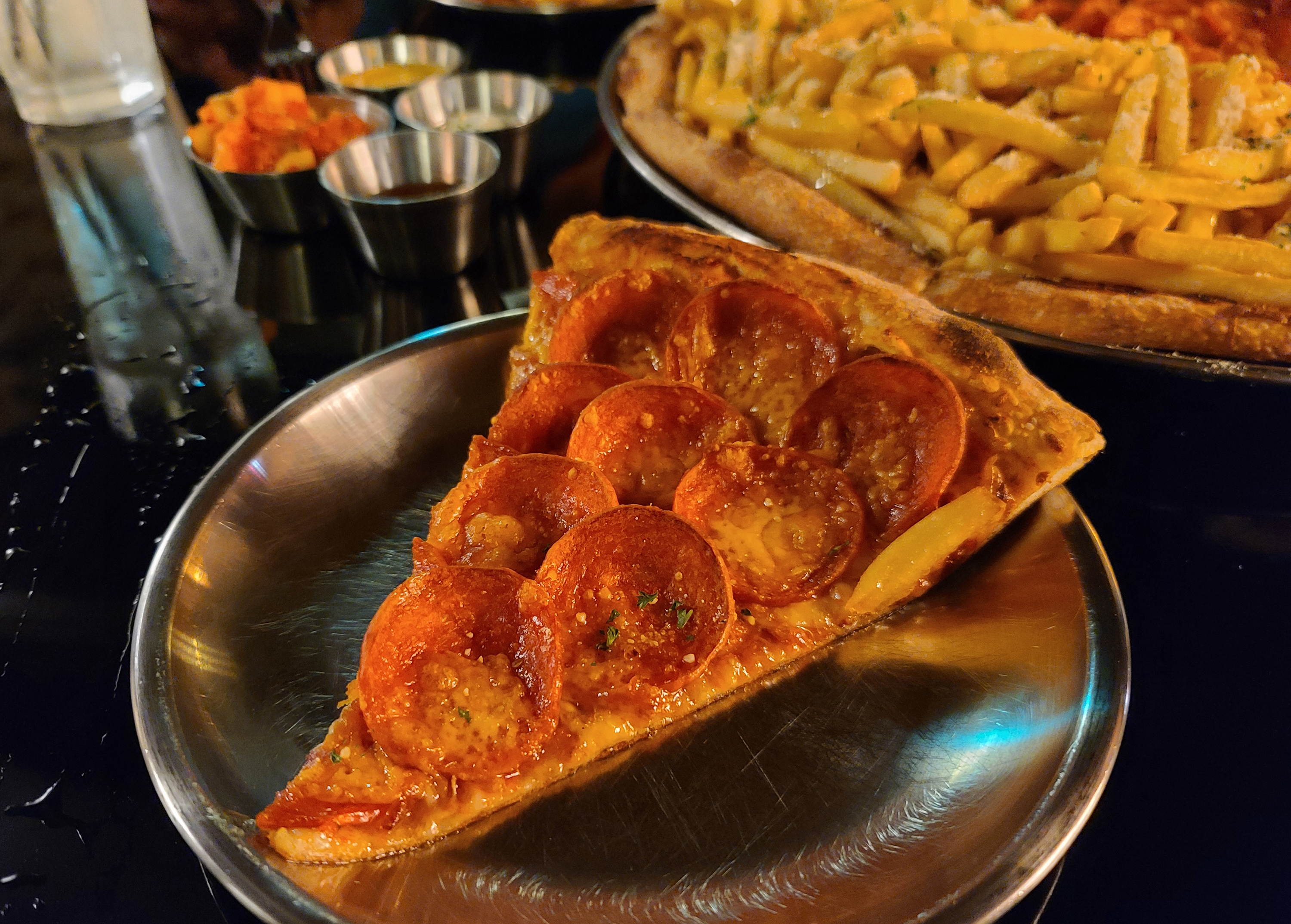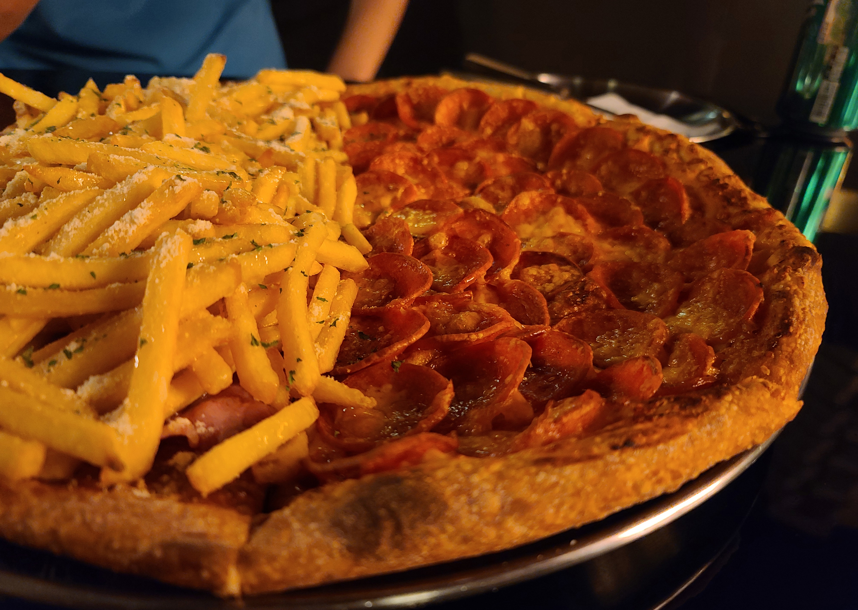 곧 주문한 피자가 나왔습니다. 더블페퍼로니와 포테이토인데, 더블페퍼로니는 흔히 있을법한 비주얼인데 포테이토는 확실히 압도적인 양의 감자튀김과 시즈닝이 인상적이었죠.