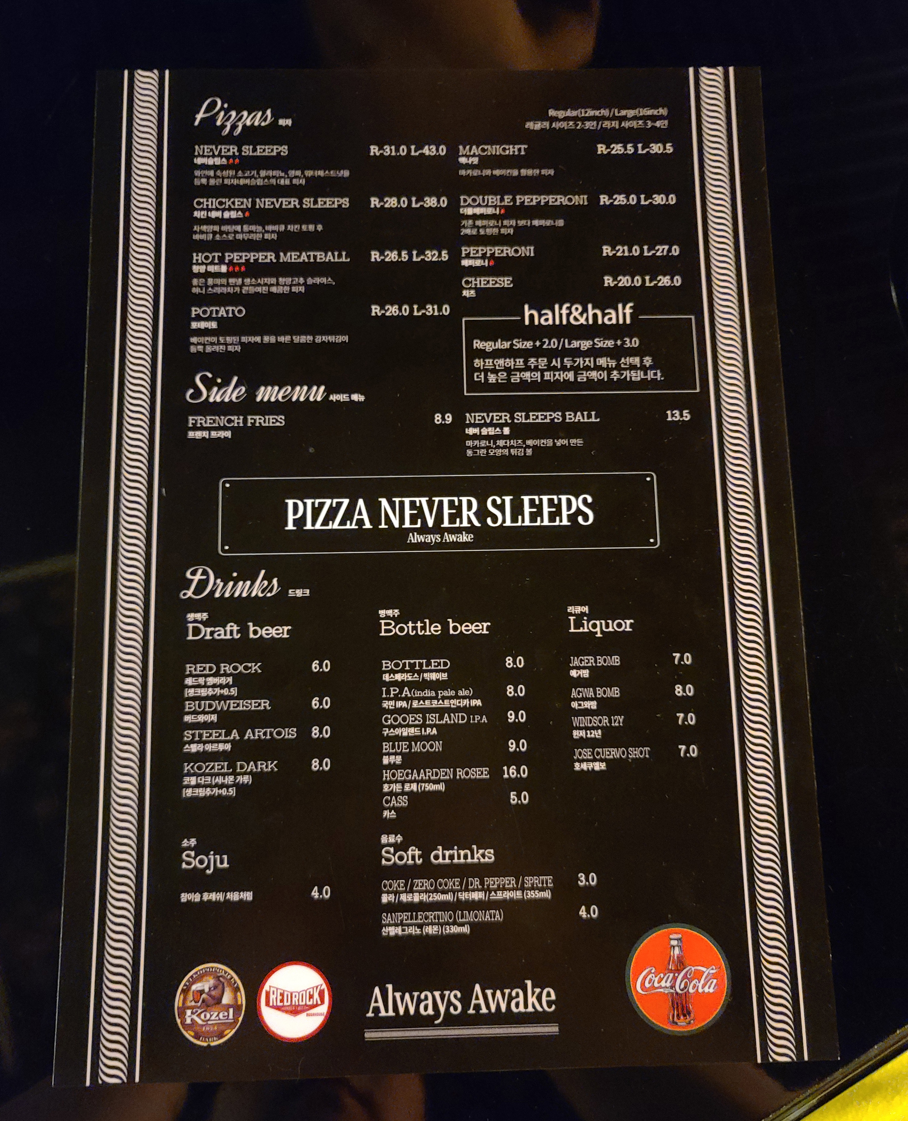 매장 내부의 모습은 위와 같았습니다. 홍대에서 봤던 커다란 샹들리에 장식과 곳곳에 액자가 걸려있는 인테리어가 인상적이었고, 메뉴는 네버슬립스, 치킨네버슬립스, 핫페퍼미트볼, 포테이토, 맥나잇, 더블페퍼로니, 페퍼로니, 치즈, 네버슬립스볼, 감자튀김 등 이 있었고, 피자는 반반 메뉴로 주문할 수 있었습니다. 저희는 피자 네버 슬립스의 더블 페퍼로니와 포테이토를 반반 섞은 피자를 주문하였습니다.