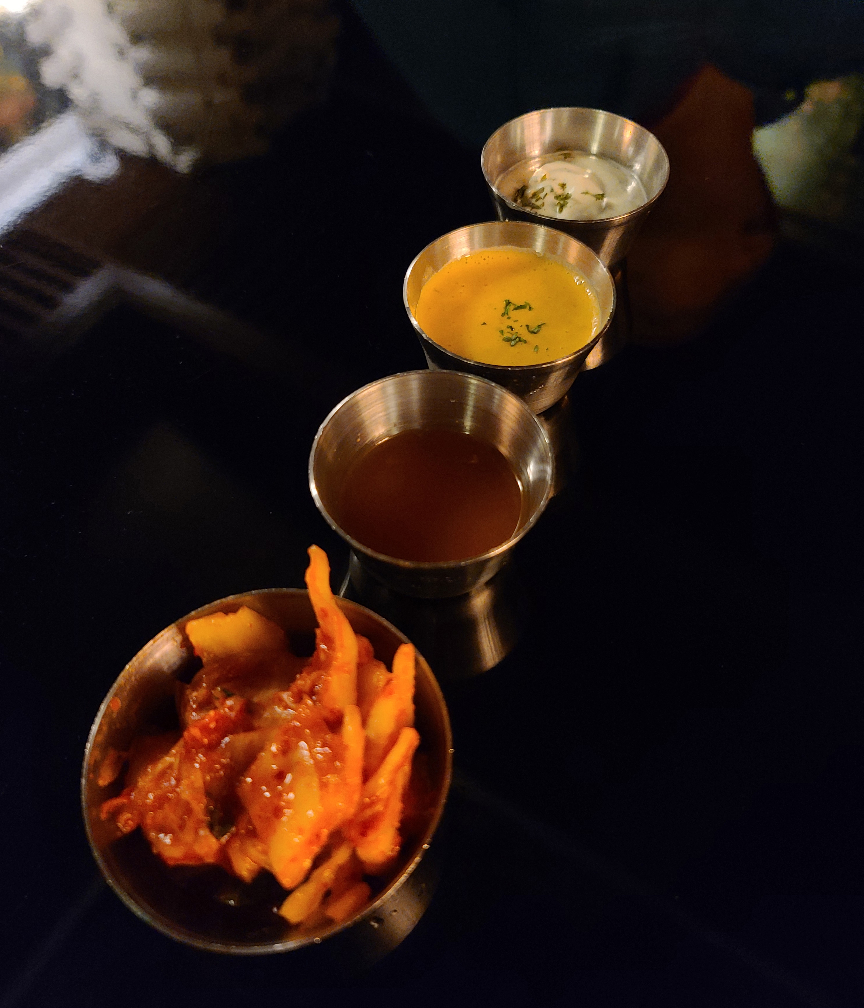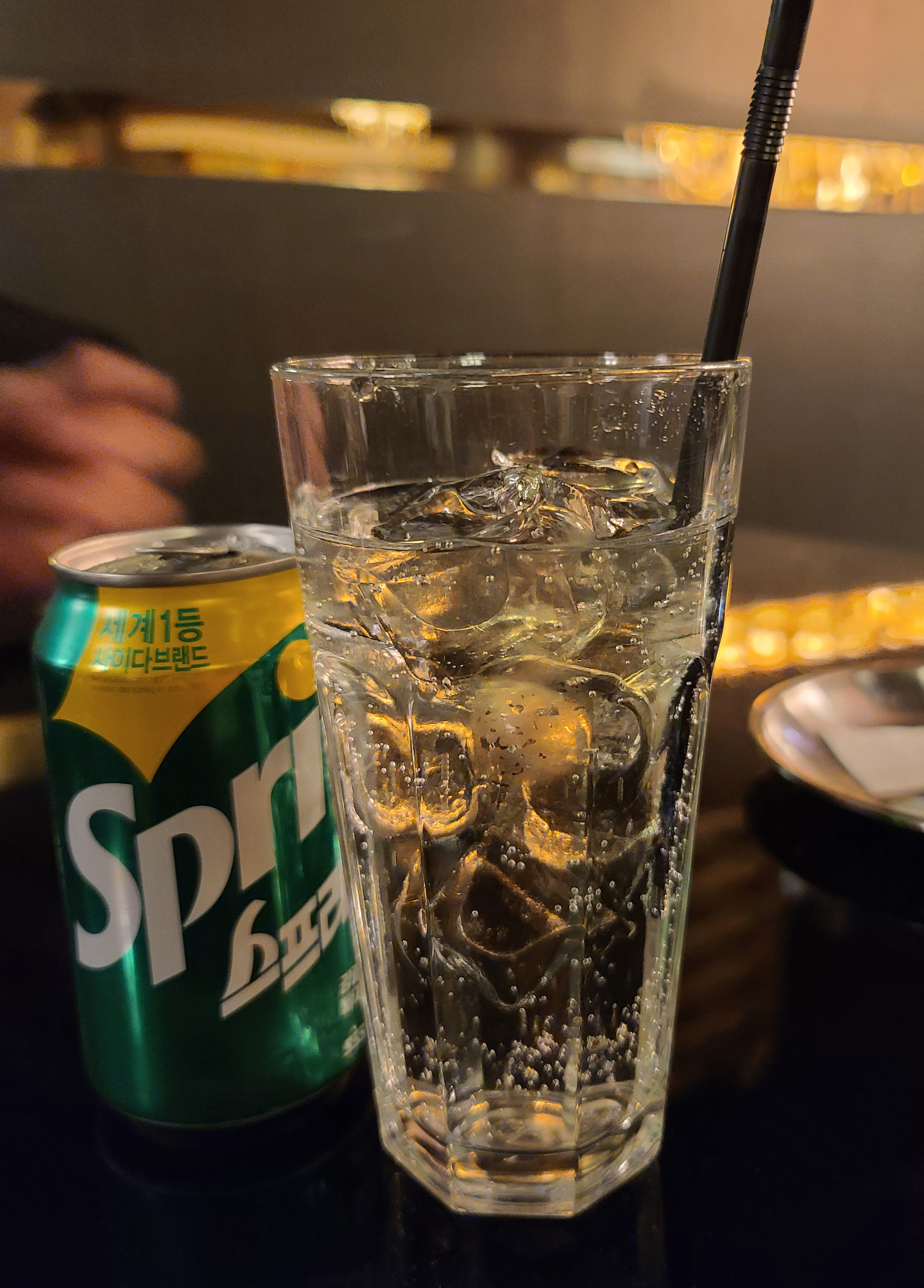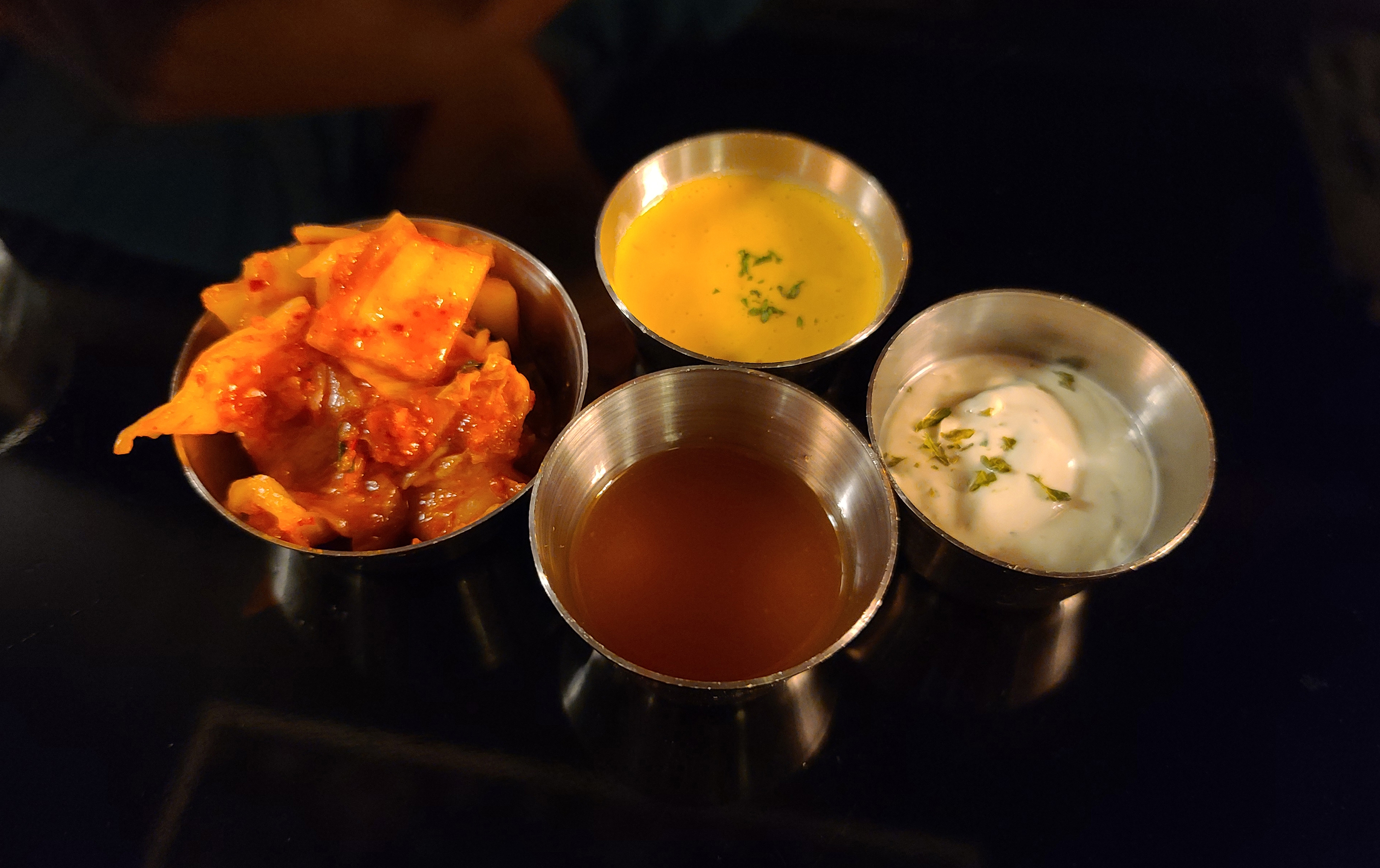 피자가 나오기 전 피자와 곁들이는 소스들과 김치가 나왔습니다. 주문한 사이다도 함께 나왔고요. 예전에 방문했을 때도 피자와 김치의 조합이 어색했었는데, 아직까지도 적응이 안 되는 피클 대신 김치를 주는 것은 그대로이더라고요.