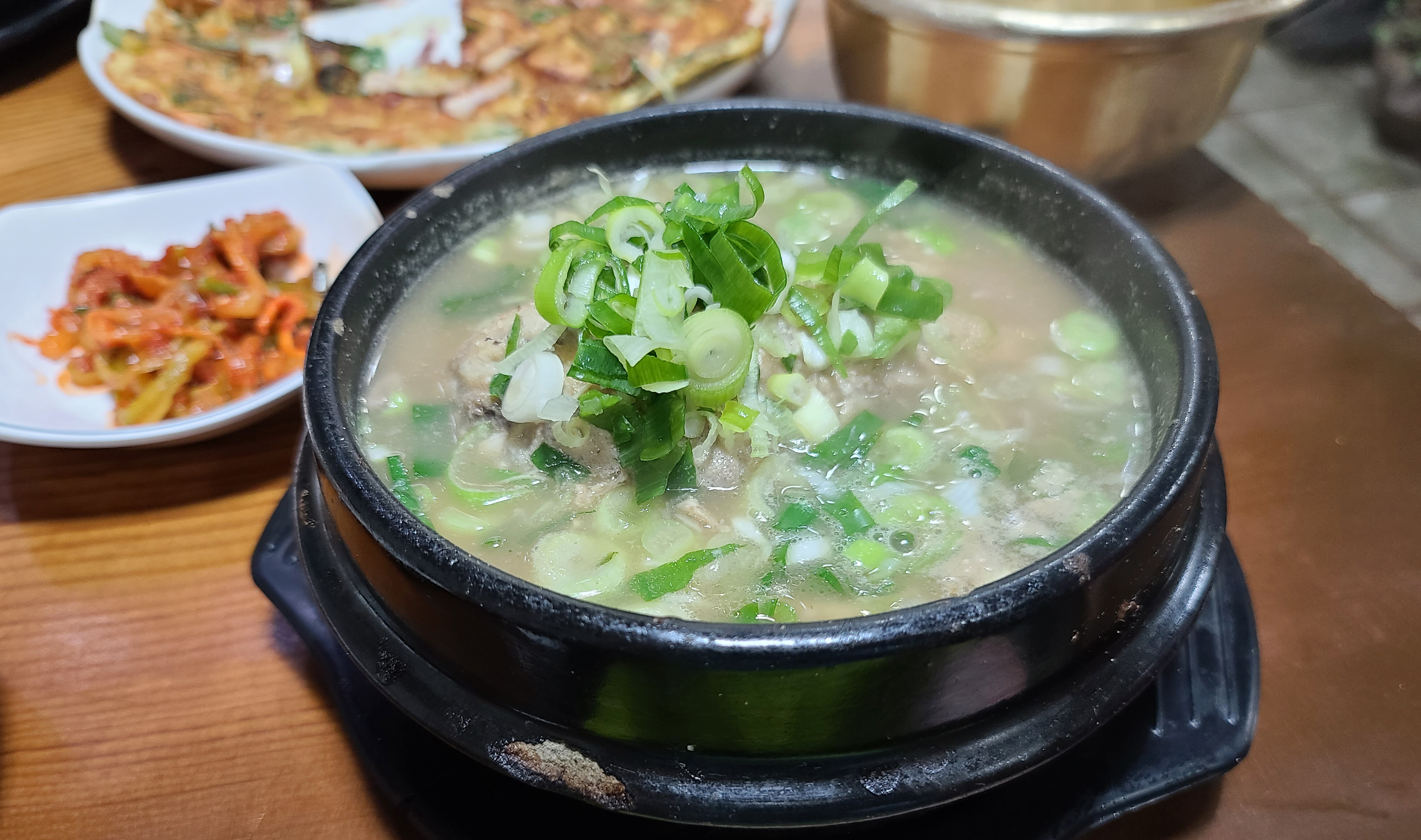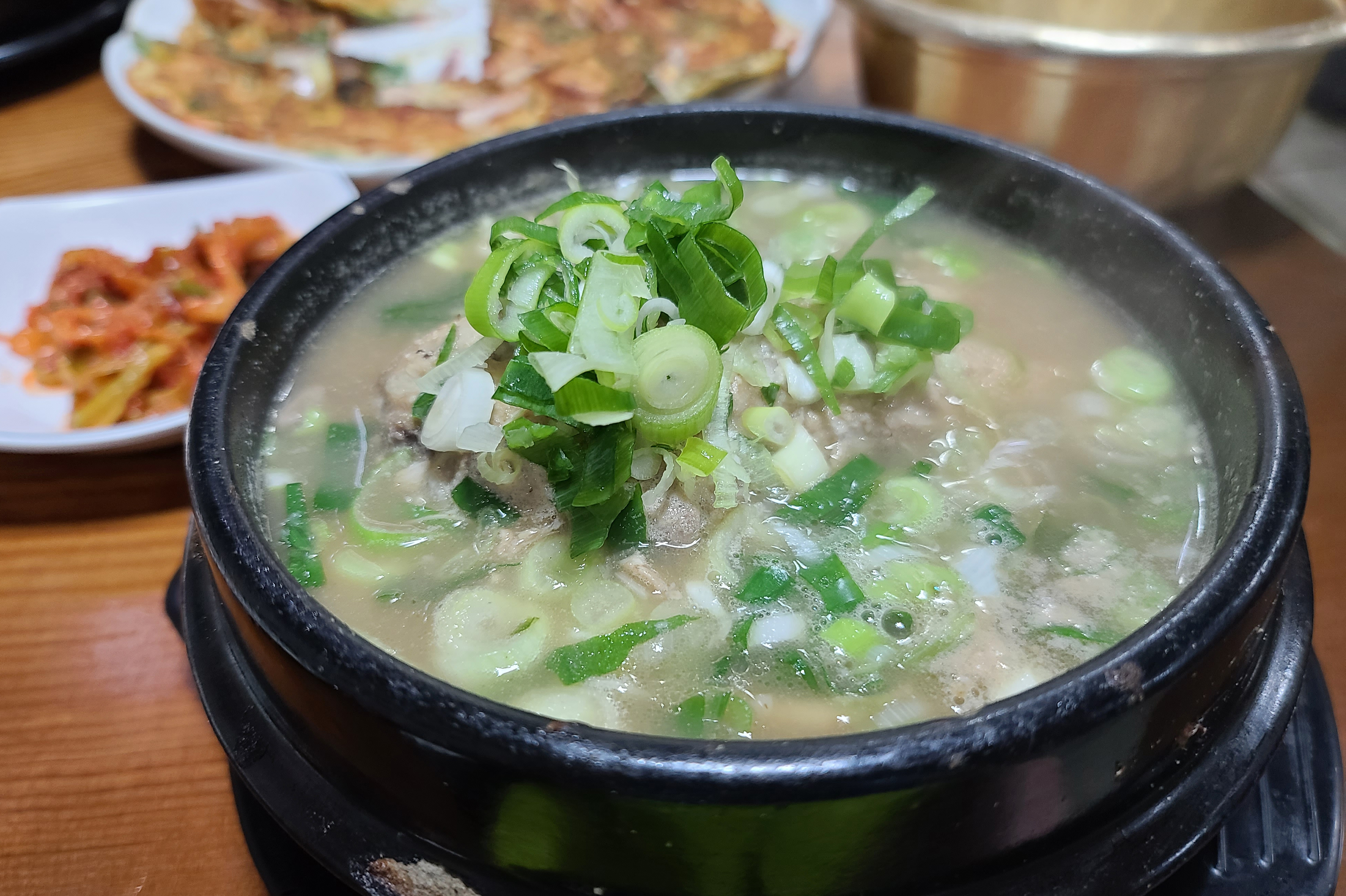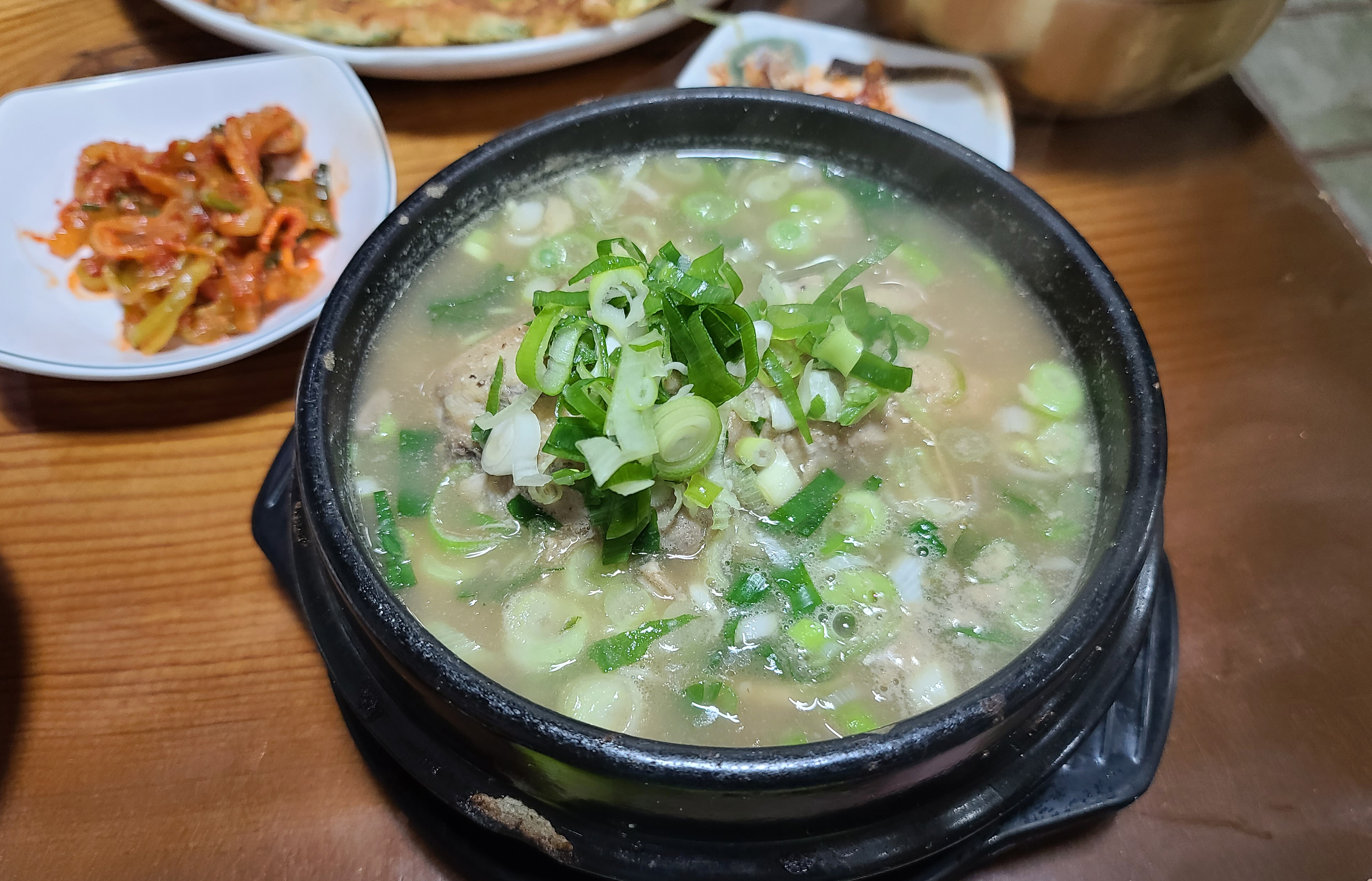 고향촌 해물파전은 적당한 두께에 해물이 넉넉하게 들어간 파전이었습니다. 맛도 괜찮았고요. 원래는 감자전을 주문하고 싶었는데 이 날 감자전 재료가 다 소진되었다고 하여 해물파전으로 주문을 했습니다. 삼계탕은 국물이 겉으로 봐도 진해 보이더라고요.