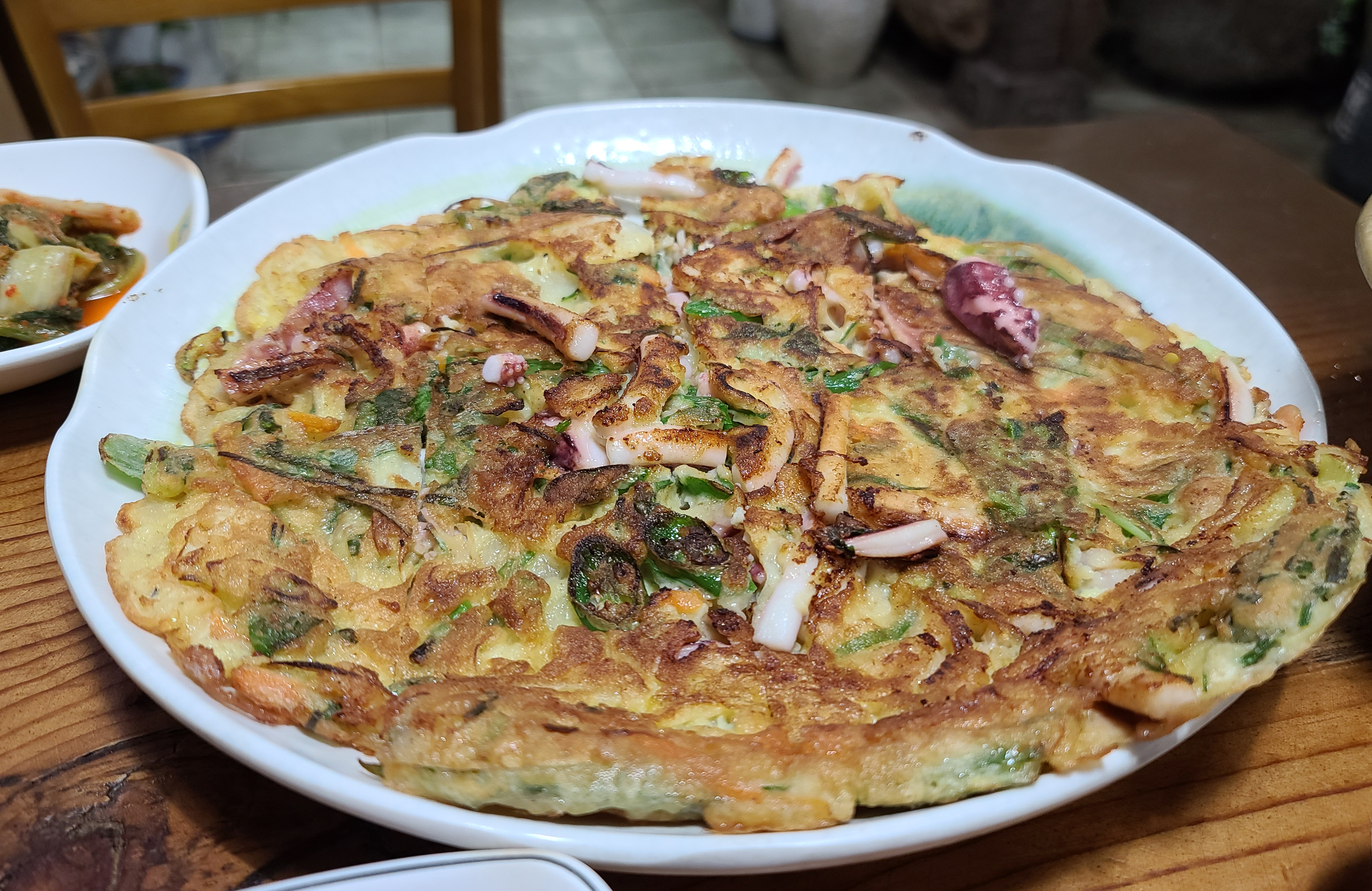 허기진 상태여서 그런지 반찬이 두루 다 맛있었습니다. 나물반찬은 물론이고 조림류나 어묵볶음 그밖에 기타 반찬도 맛있게 잘하더라고요. 곧이어 해물파전이 나왔습니다.