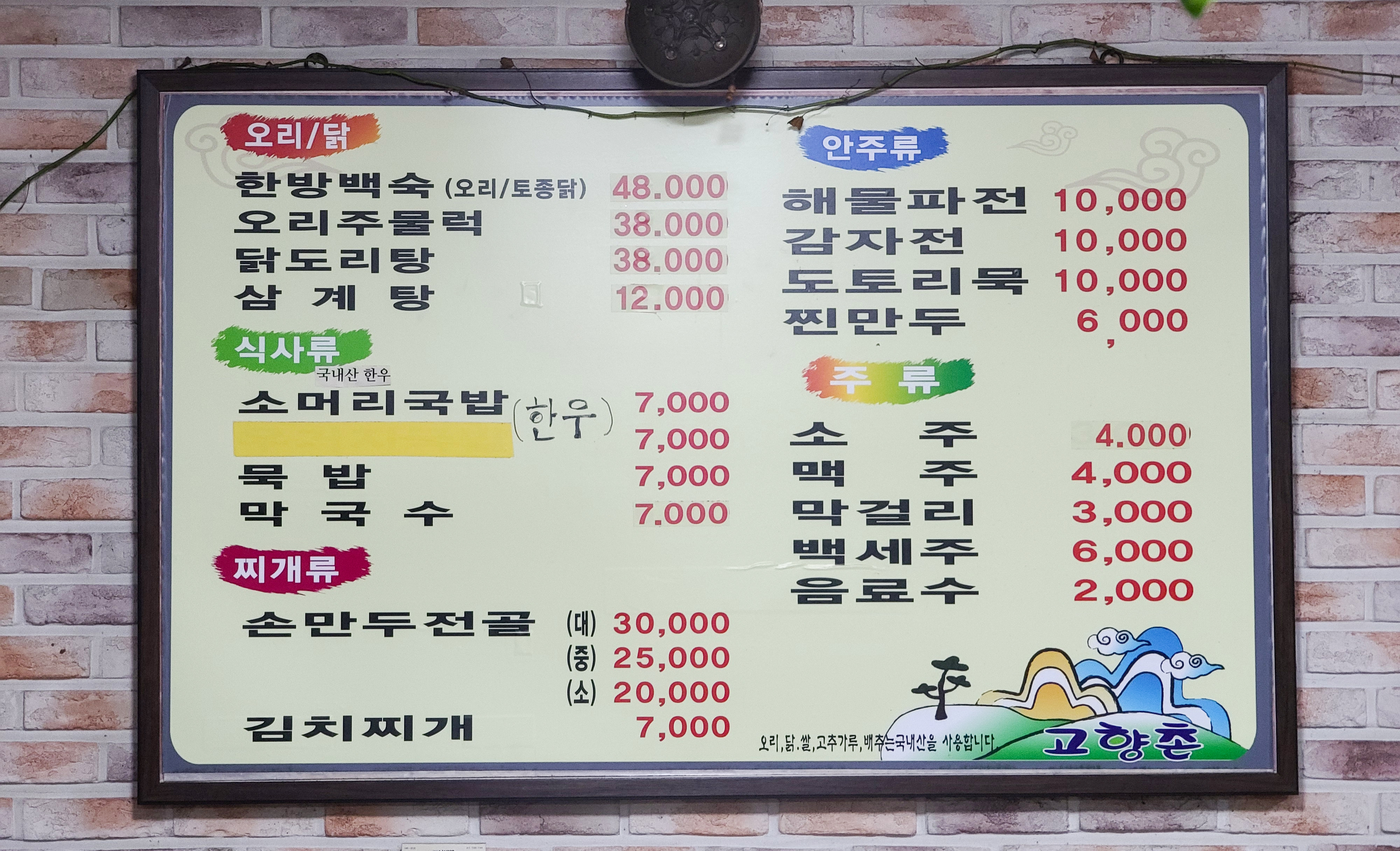 고향촌의 메뉴는 다음과 같습니다. 한방백숙, 오리주물럭, 닭도리탕, 삼계탕, 소머리국밥, 묵밥, 막국수, 손만두전골, 김치찌개, 해물파전, 감자전, 도토리묵, 찐만두 등 이 있었습니다. 저희는 삼계탕 2그릇과 해물파전 1개를 주문하였습니다.