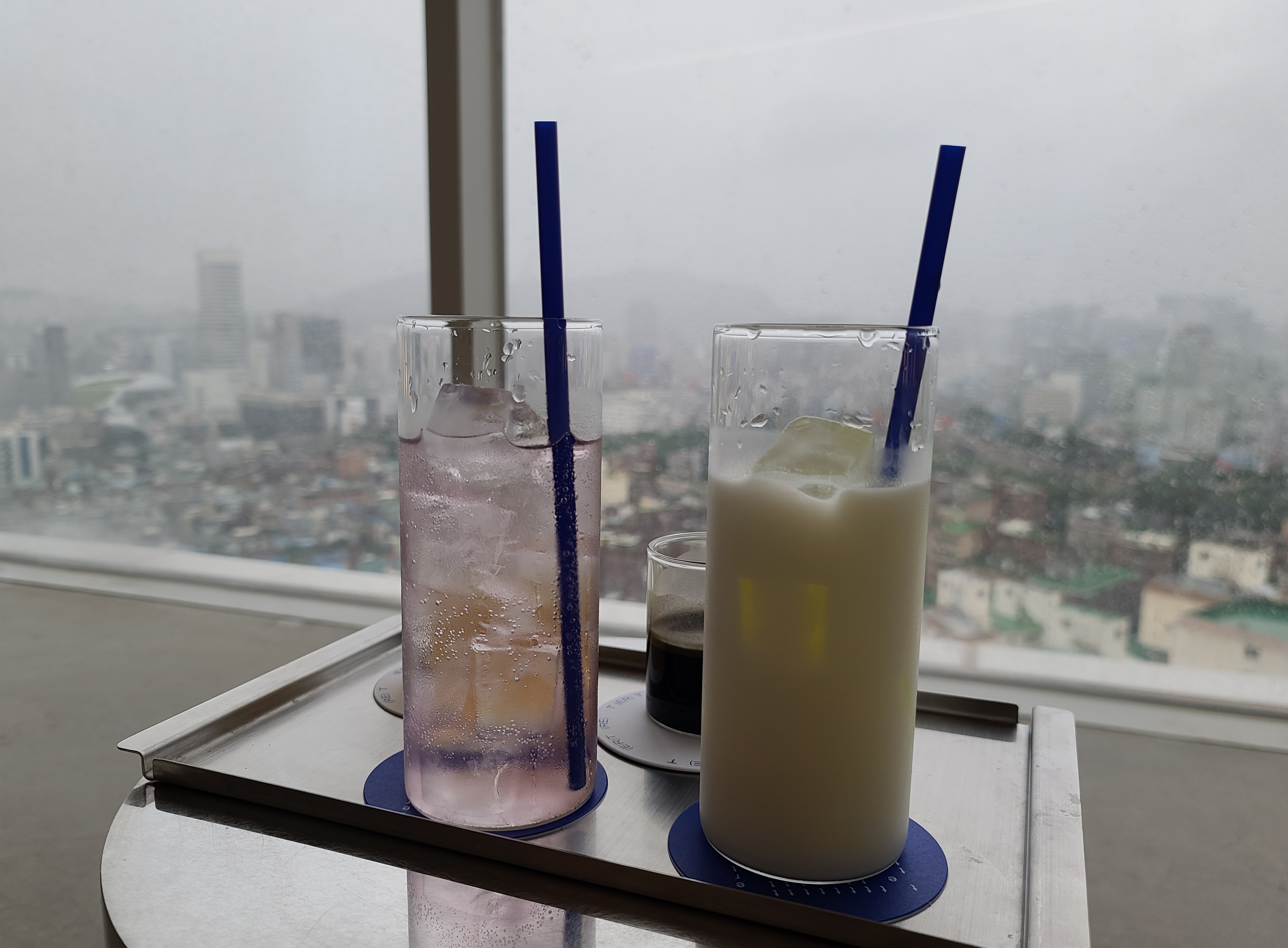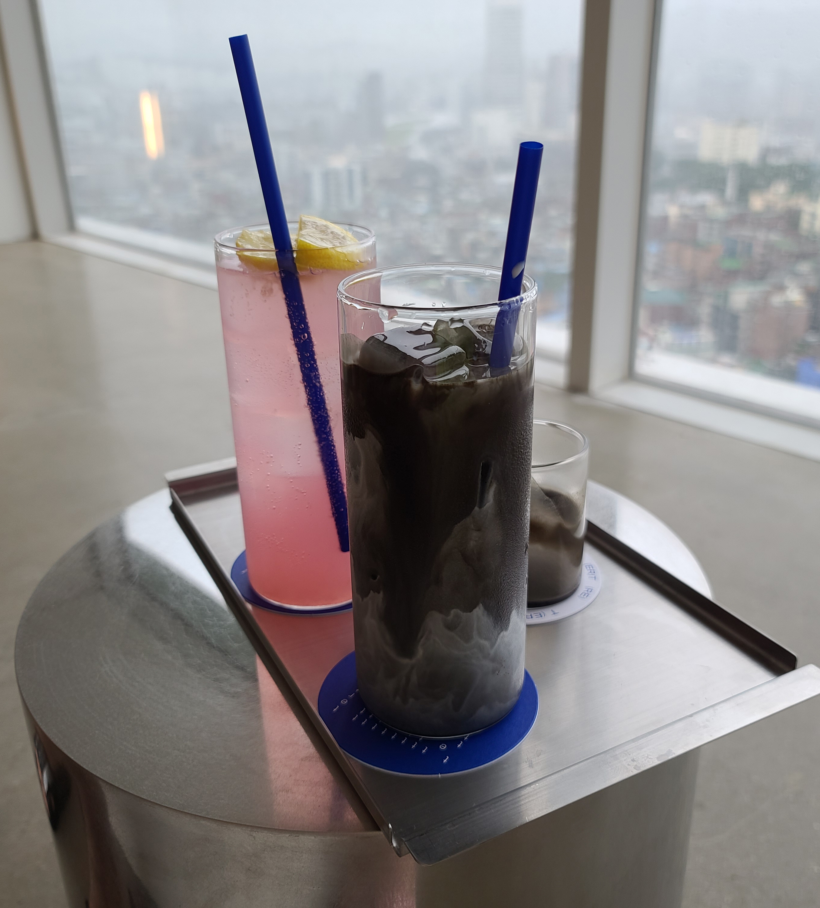 주문한 메뉴를 들고 적당한 자리를 잡고 서울의 경치를 감상했습니다. 인테리어는 테이블을 놓았다면 협소한 느낌을 주었을 공간을 의자나 박스 형태의 소품들로 배치를 해 두어 답답한 느낌이 적었습니다. 주문한 핑크 에이드와 블랙라떼의 모습입니다. 맛은 그냥 보통 수준이었고, 특별히 맛있거나 하지는 않았습니다.