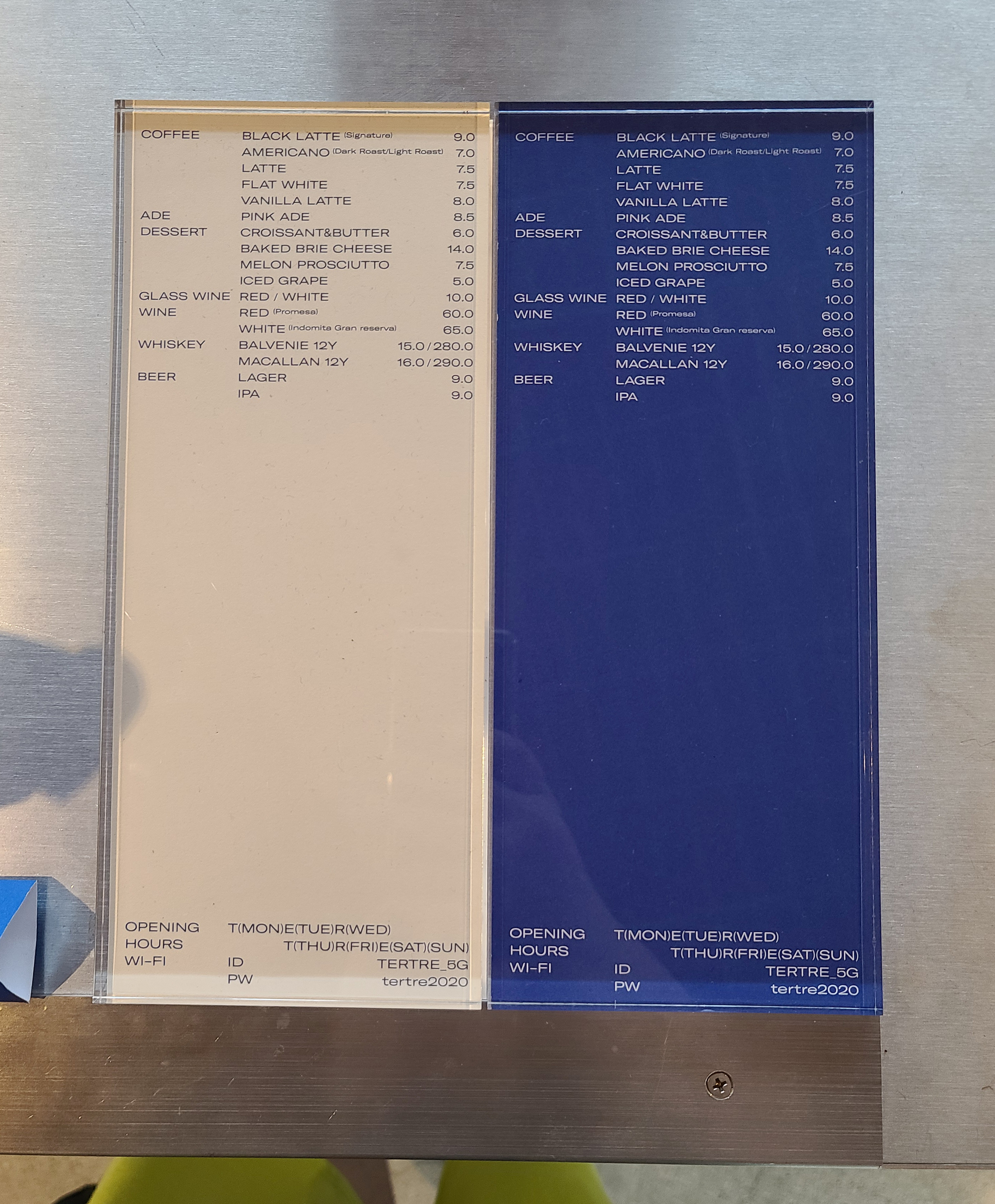 블랙라떼, 아메리카노, 라떼, 플랫화이트, 바닐라라떼, 핑크에이드, 크로와상버터, 베이크브리치즈, 멜론프로슈토 그 밖에 와인, 위스키, 맥주 등을 판매하고 있었습니다. 저희는 테르트르의 핑크에이드와 블랙라떼를 주문하였습니다. 메뉴의 가격은 전체적으로 저렴한 편은 아니었습니다.