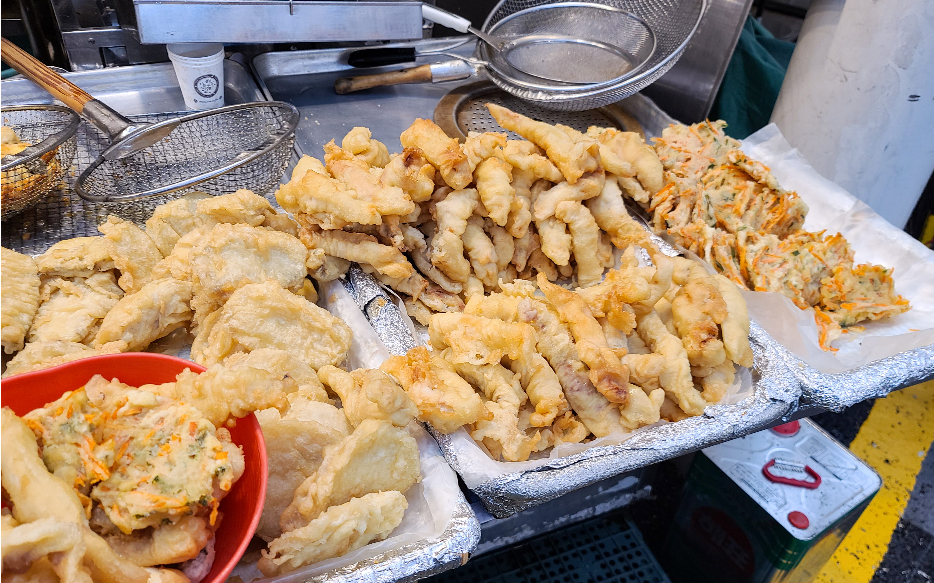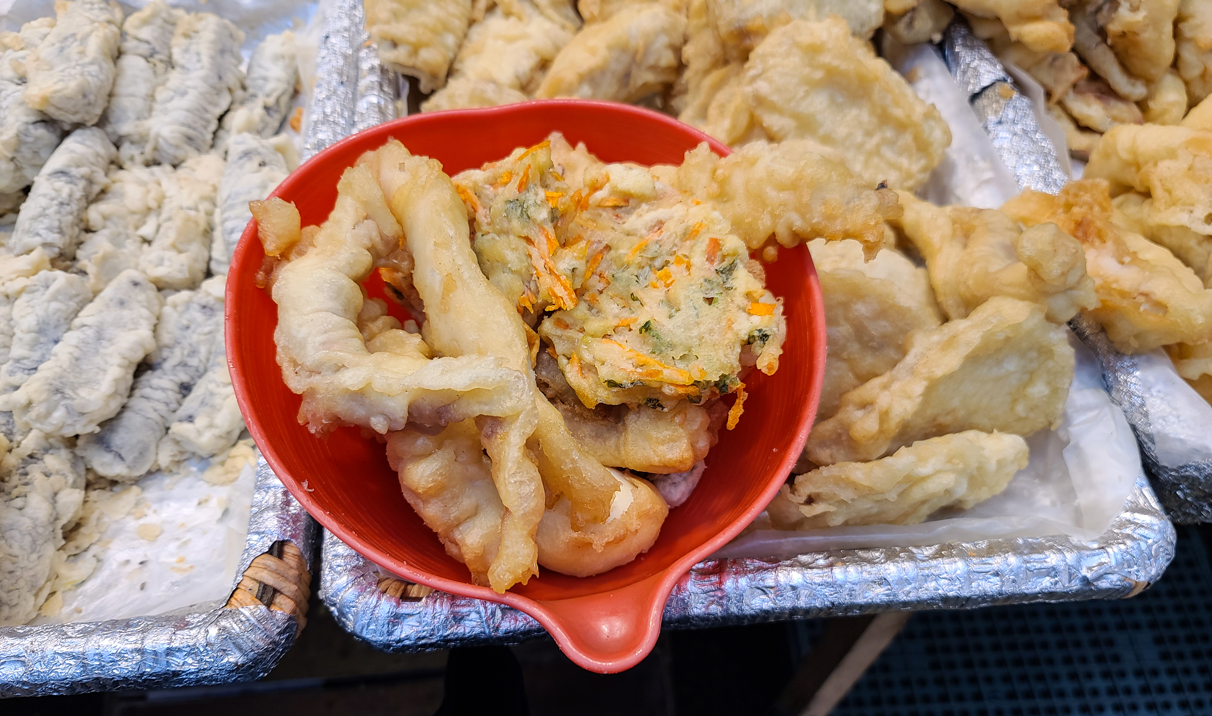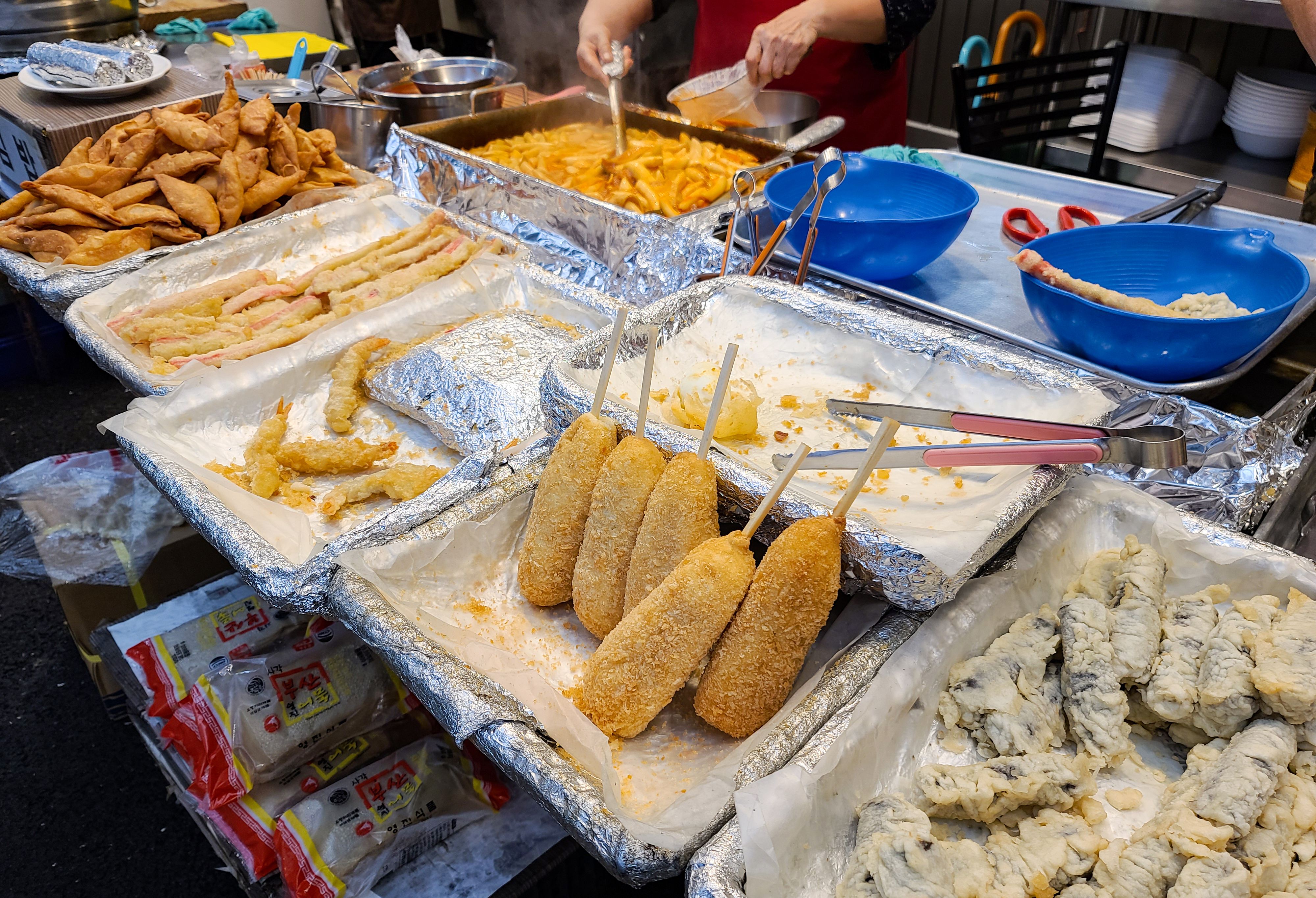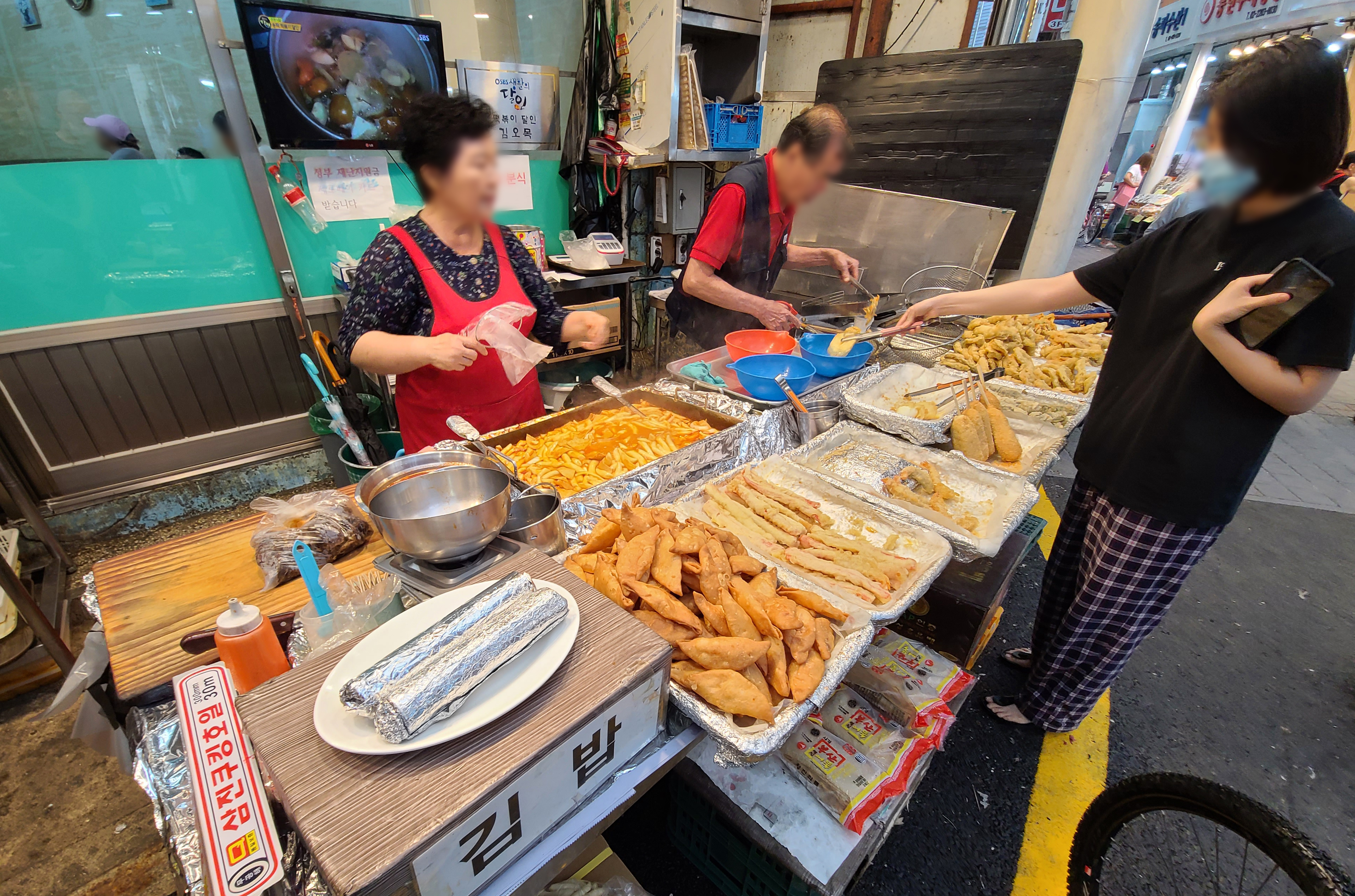 저희는 튀김과 떡볶이를 먹을 예정이라, 튀김을 먼저 골랐습니다. 먼저 원하는 종류의 튀김을 바구니에 담아 사장님께 드리면 그 자리에서 즉석에서 튀김기에 튀겨주십니다. 떡볶이도 함께 주문하여 가게에 들어갔습니다.