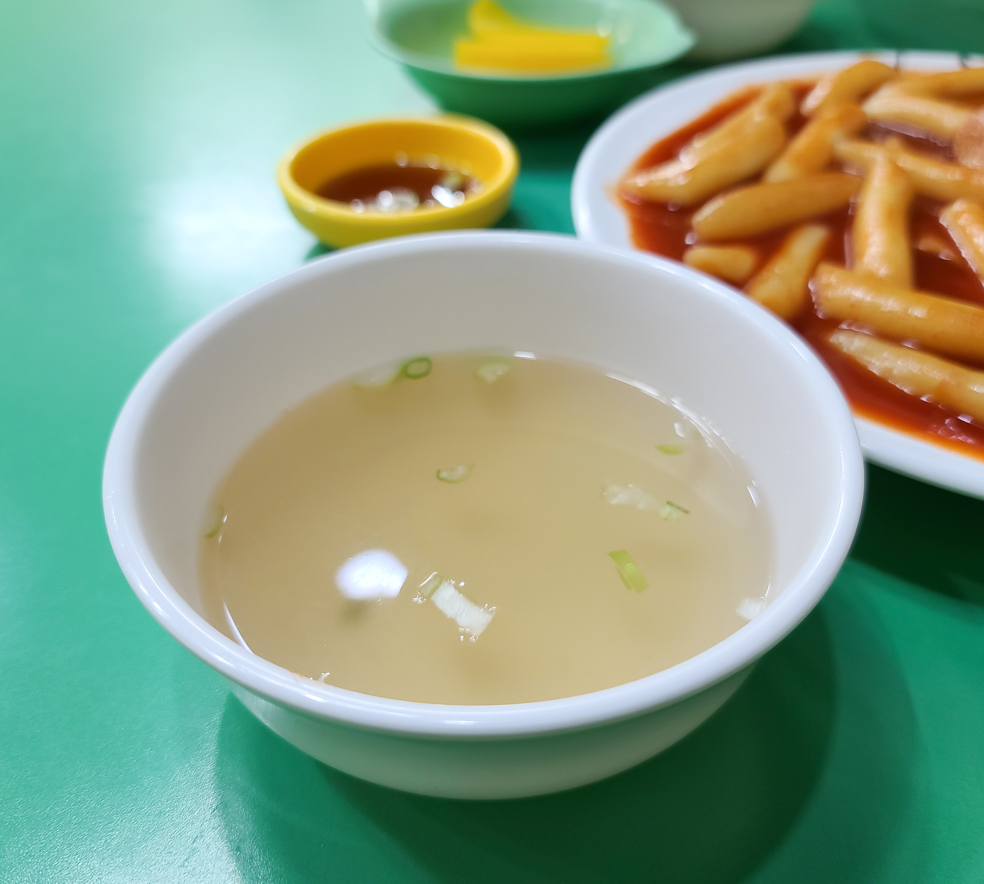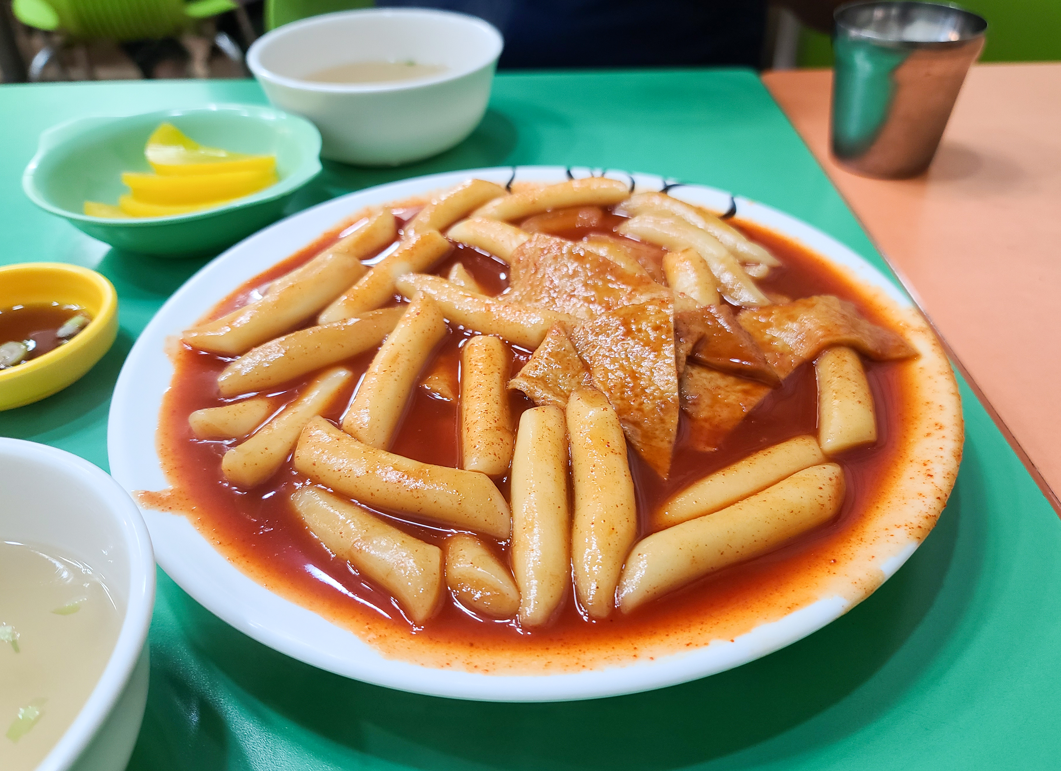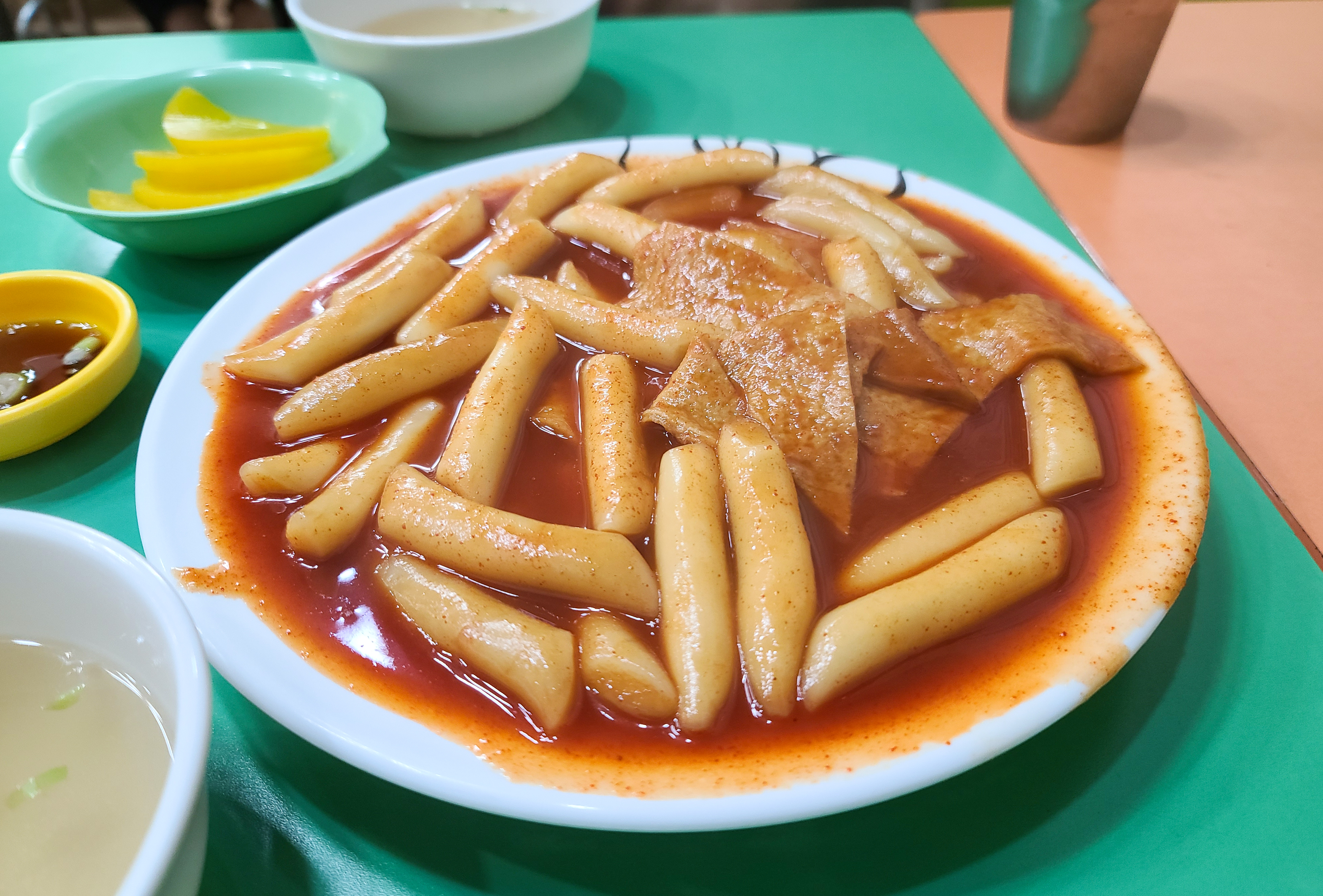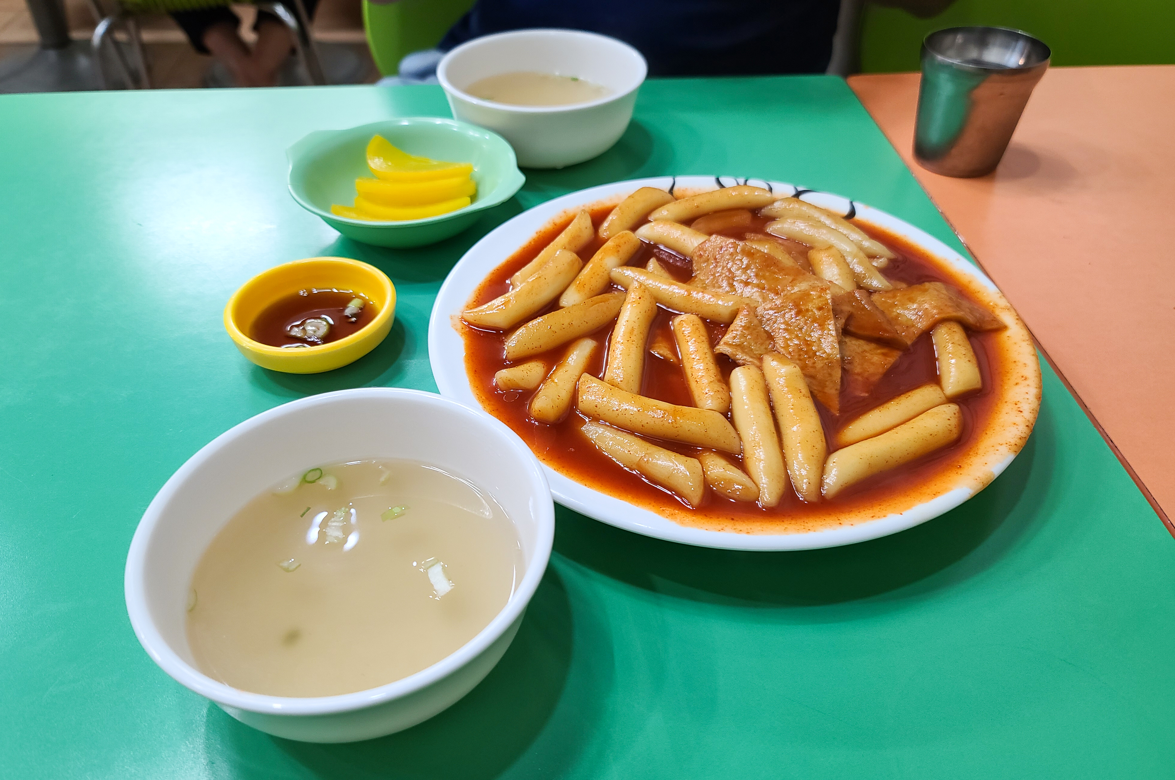 오렌지분식 가게는 조금 협소한 편이었지만, 나름 냉방시설도 잘 갖춰져 있고 이용이 편리했습니다. 먼저 주문한 떡볶이가 나왔습니다. 떡볶이는 큰 재료들 없이 떡과 어묵 그리고 양념이 볶인 형태였습니다. 떡볶이와 함께 어묵 국물이랑 단무지가 나왔습니다.