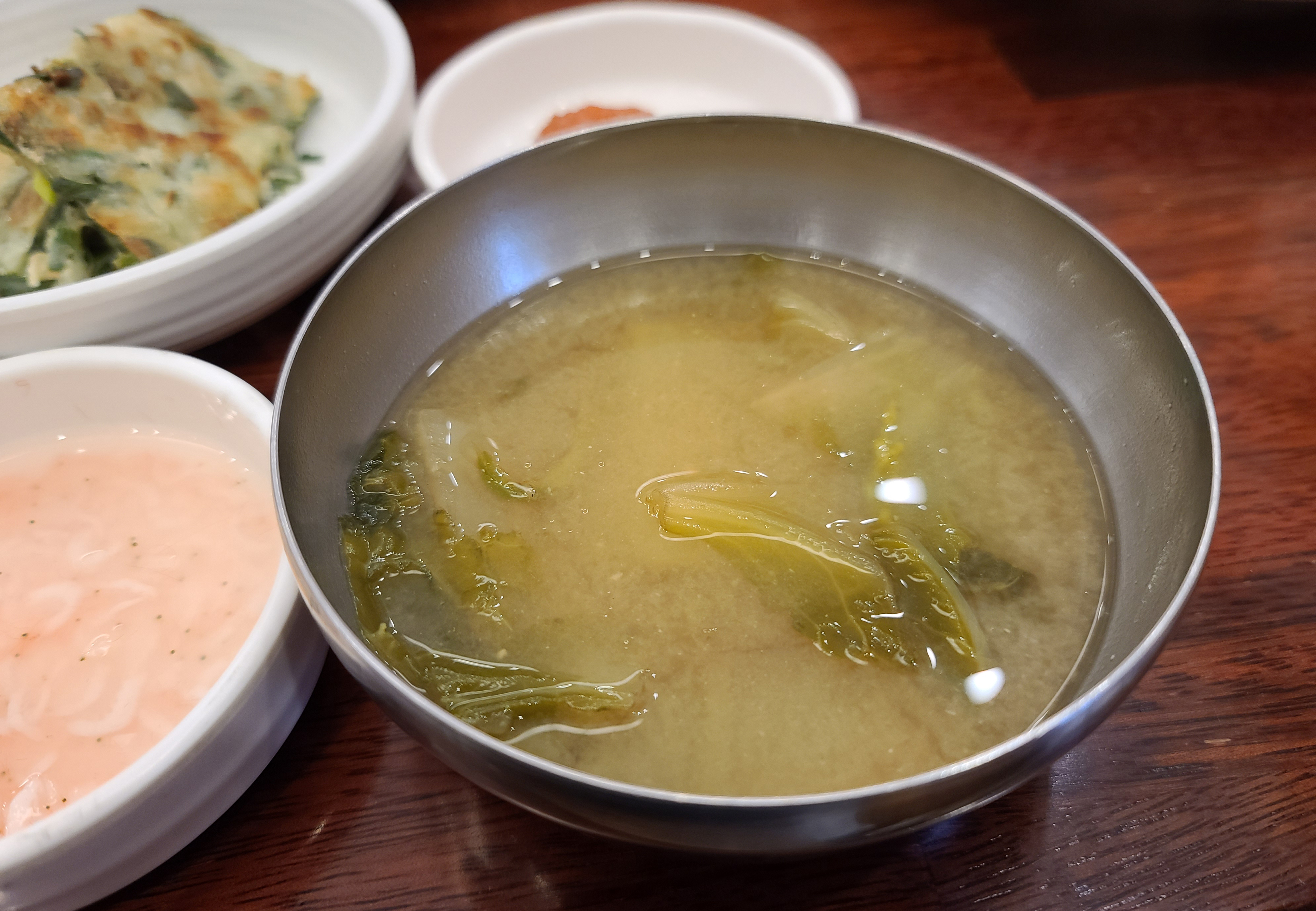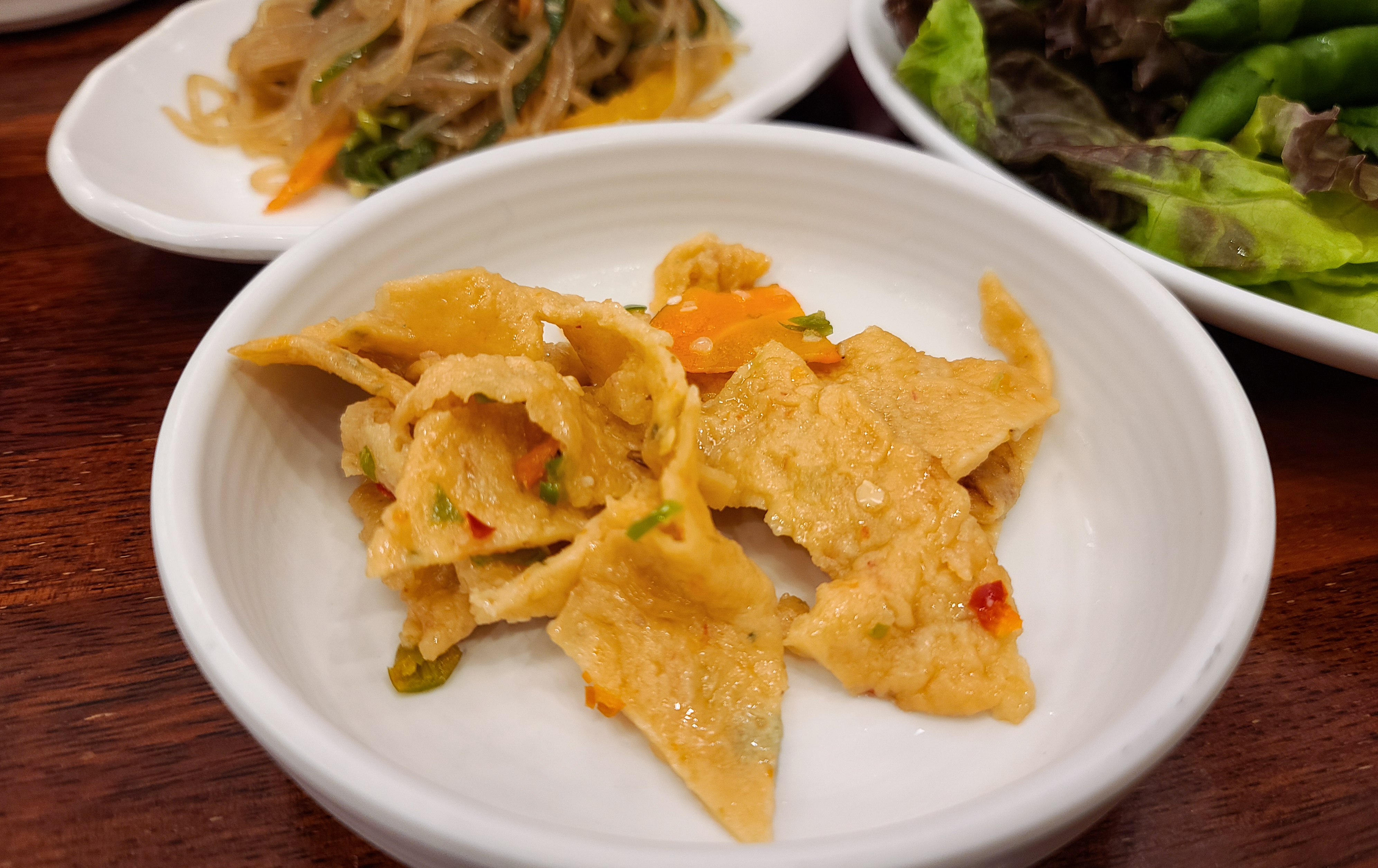 장원 족발의 주문한 메뉴를 기다리는 동안 반찬들이 나왔습니다. 반찬으로는 동치미, 부침개, 양념게장, 잡채, 어묵볶음, 쌈채소와 양념류, 시래기 된장국 등이 나왔습니다.