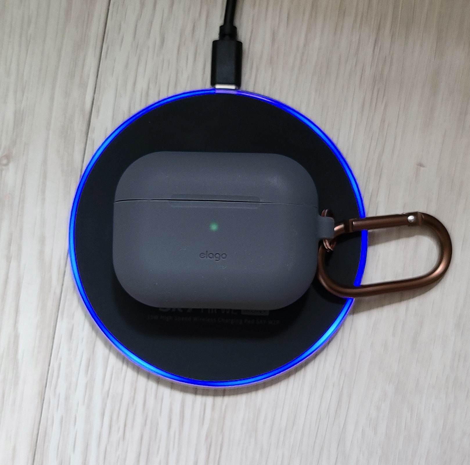 제품 본체에 USB-C 케이블을 이용해 전원을 연결하면, 위 사진과 같이 기본적으로 녹색 등이 표시됩니다. 충전 대기중 표시인데, 일정시간동안 충전할 제품이 올라오지 않으면 자동으로 녹색등이 꺼지게 되어있더라고요. 충전할 제품을 올리면 파란색 등이 점멸되며 충전 상태를 알려줍니다.