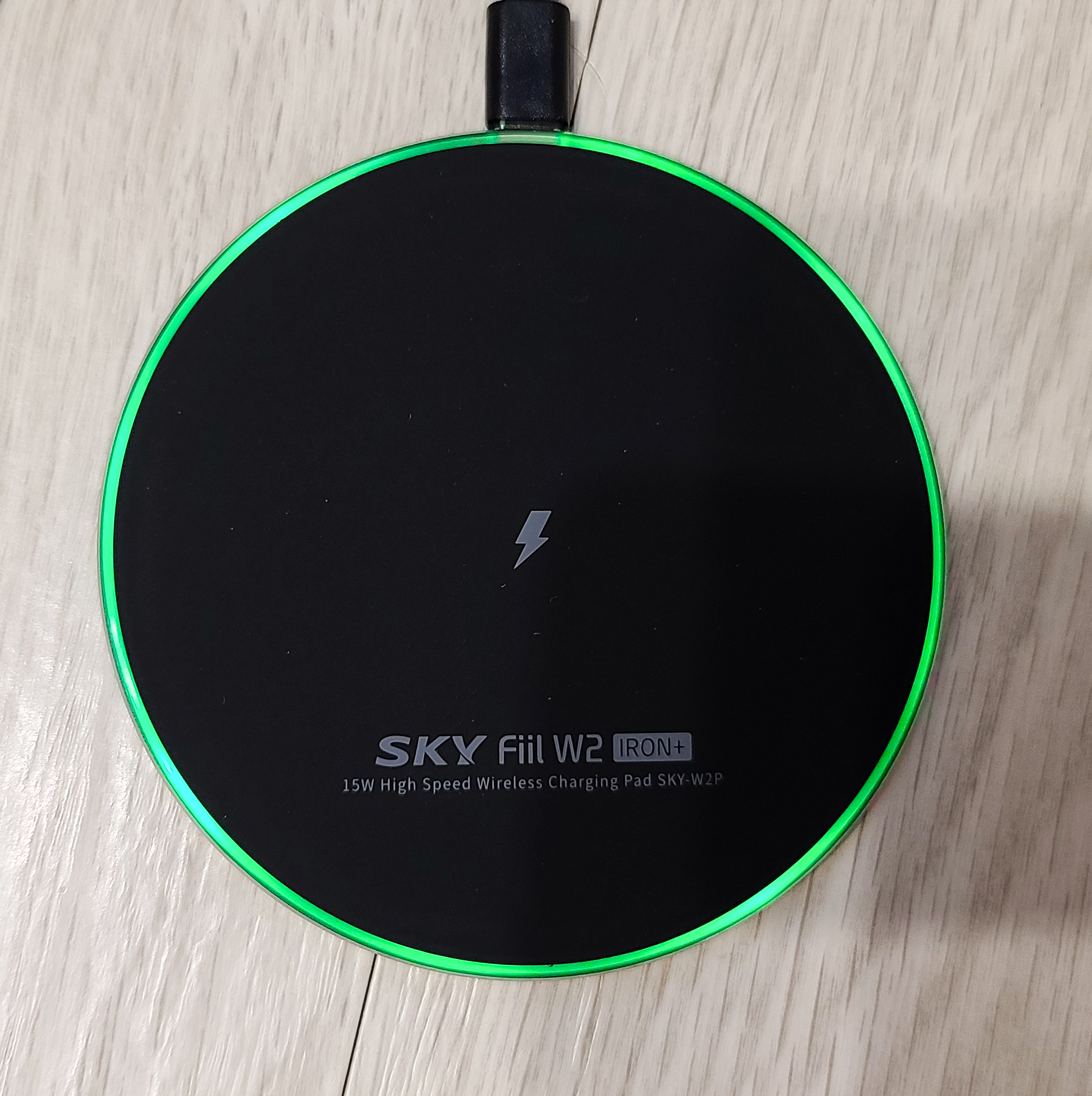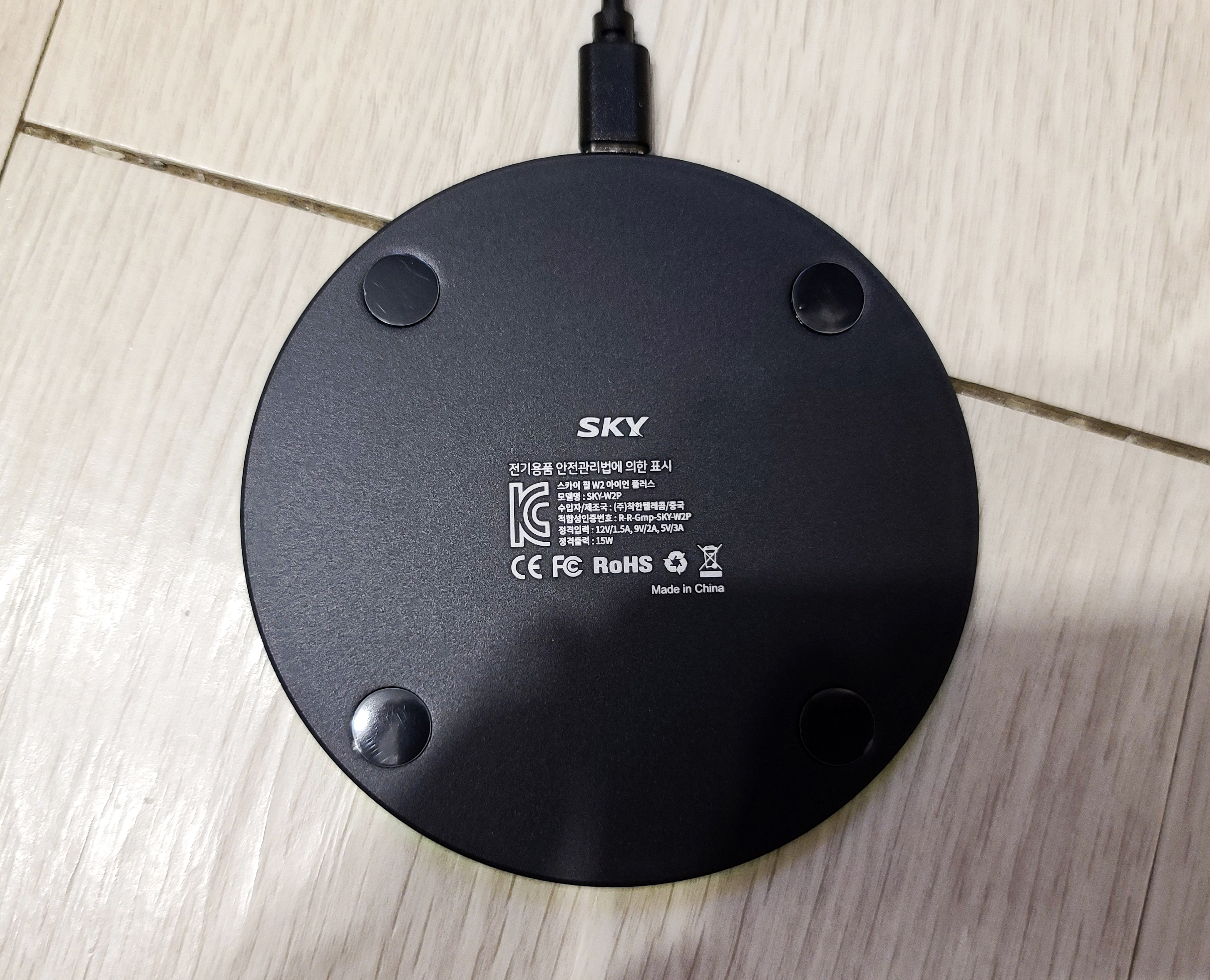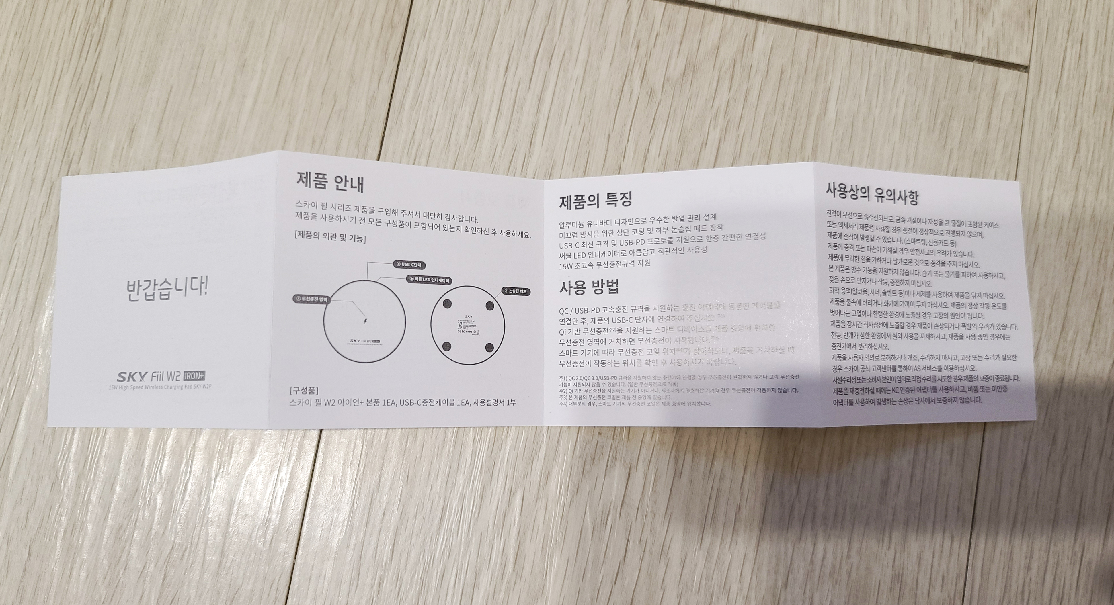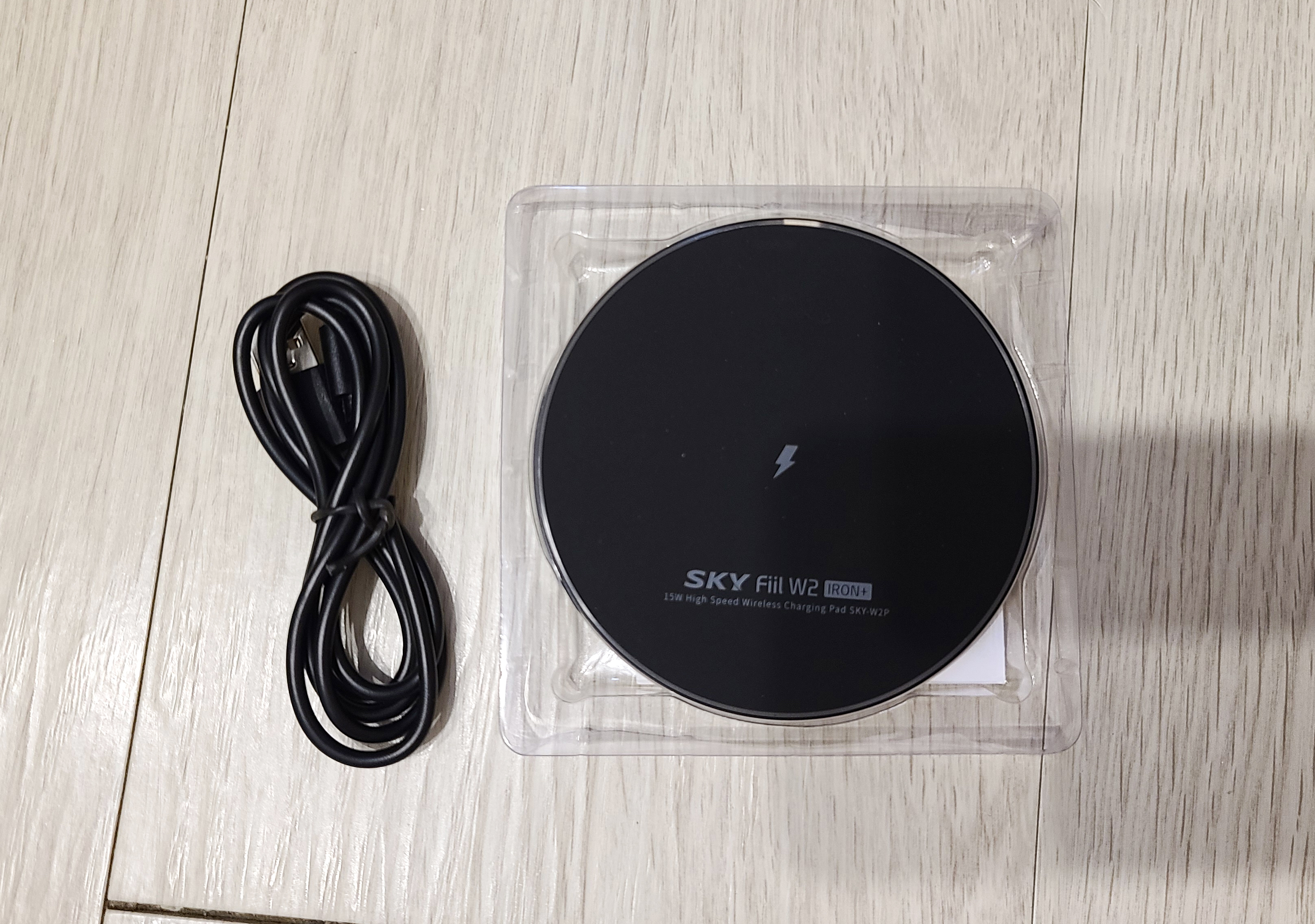 스카이 필 W2 아이언 플러스를 개봉하면 위와 같이 제품 본체와 충전 케이블, 사용 가이드와 보증서가 들어있었습니다. 가격이 1만 원을 넘기지 않으면서도 무선 충전은 최대 15W 까지 지원해주고 있는 이 제품은 아이언이라는 이름답게 금속 재질로 만들어진 제품이었죠.