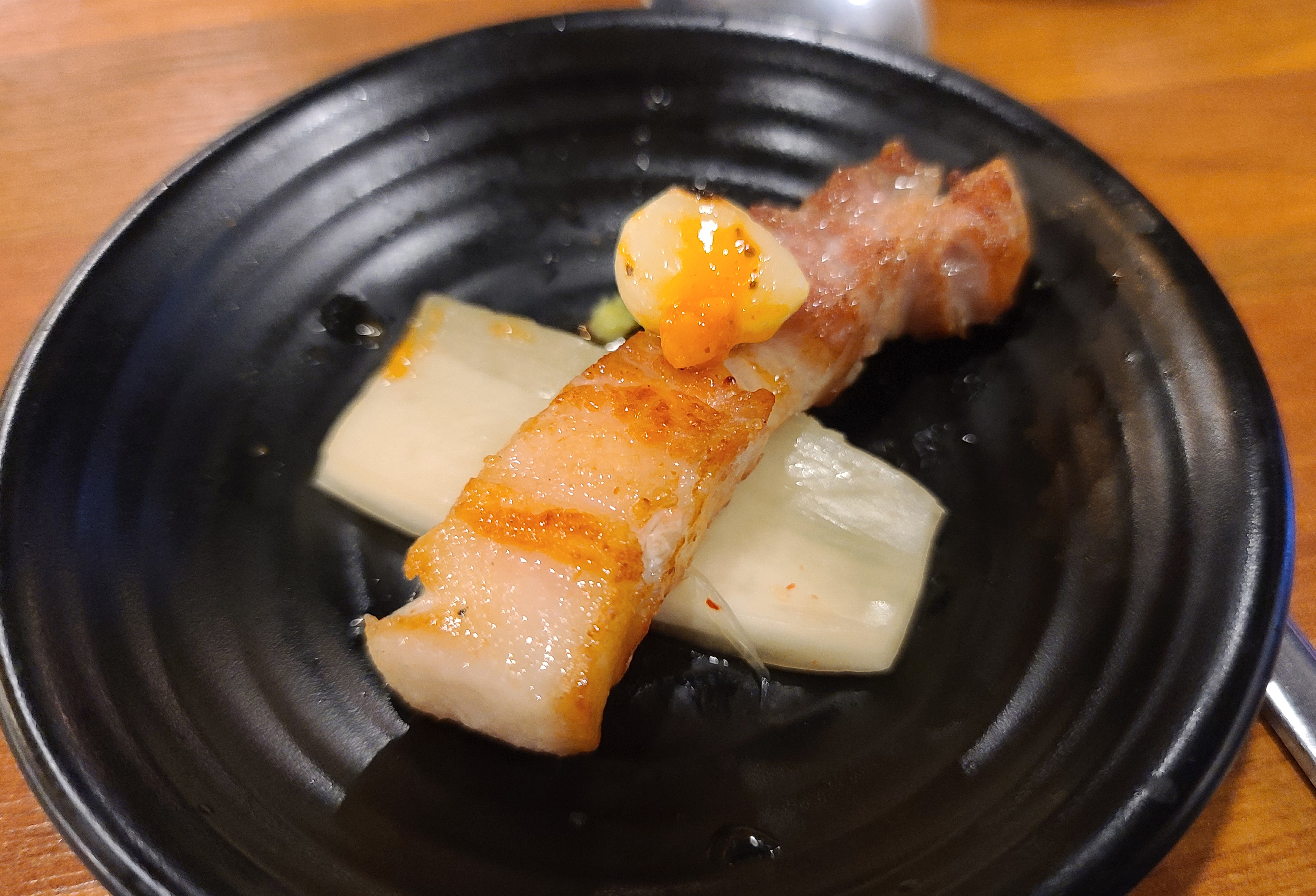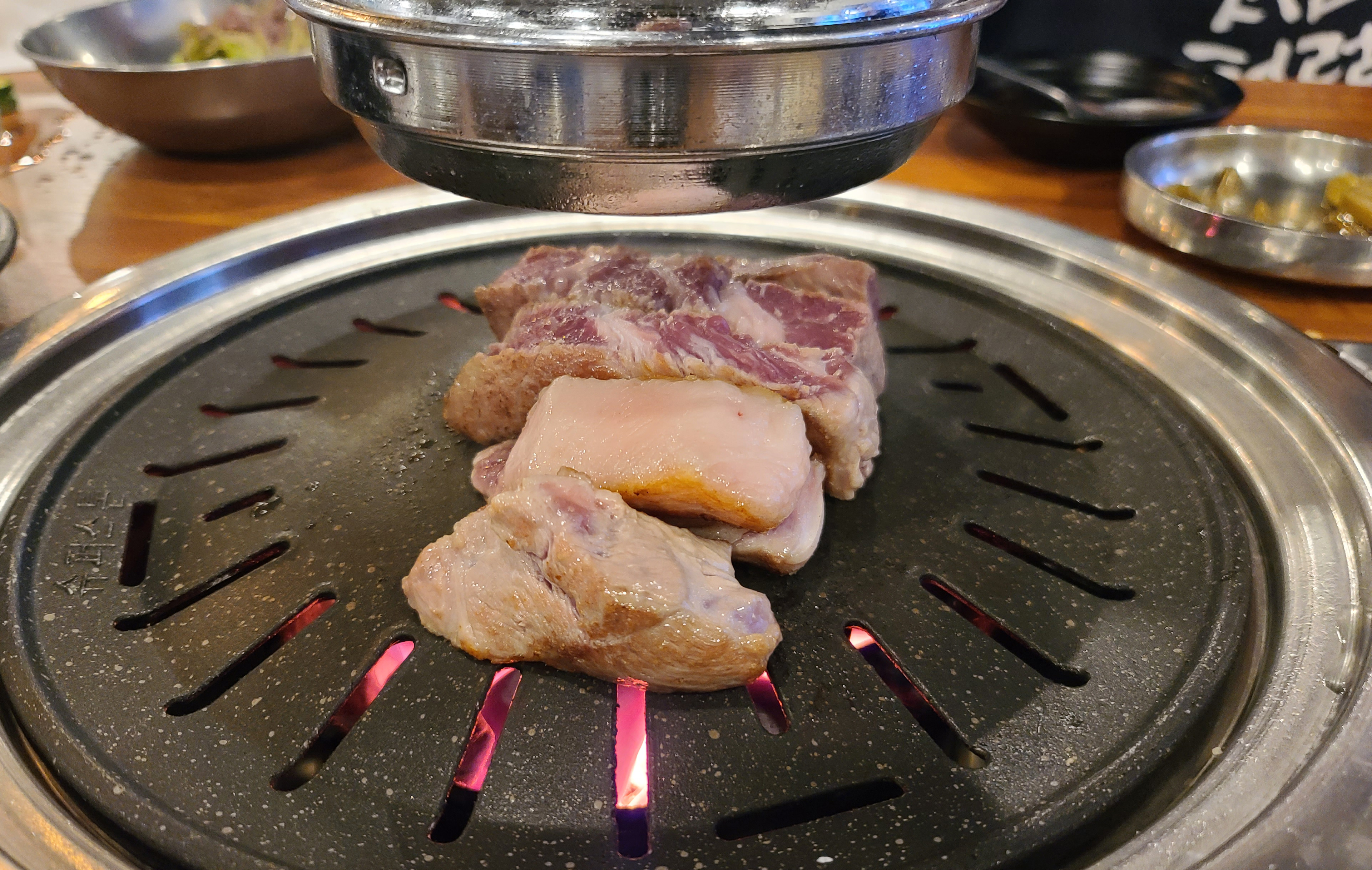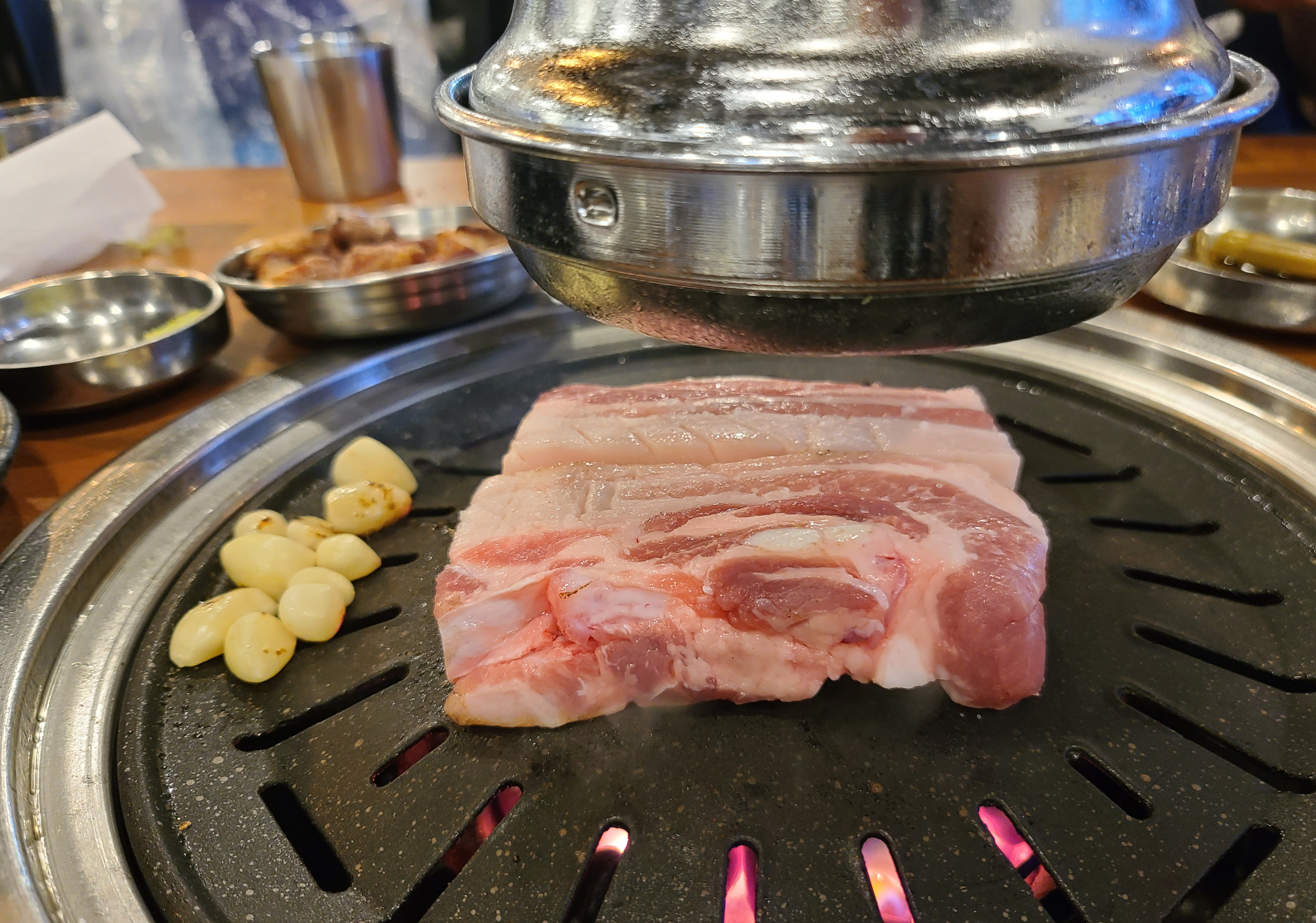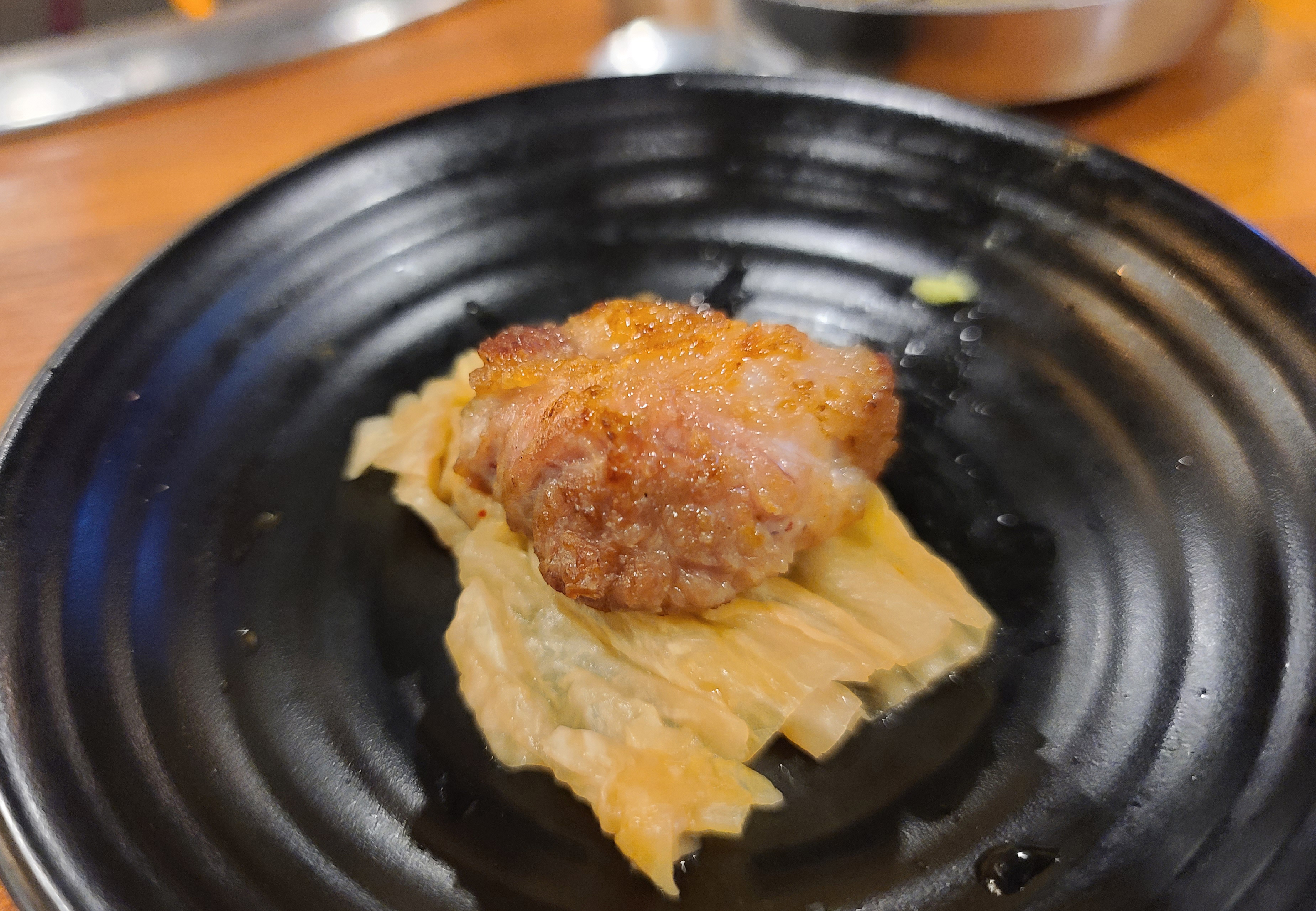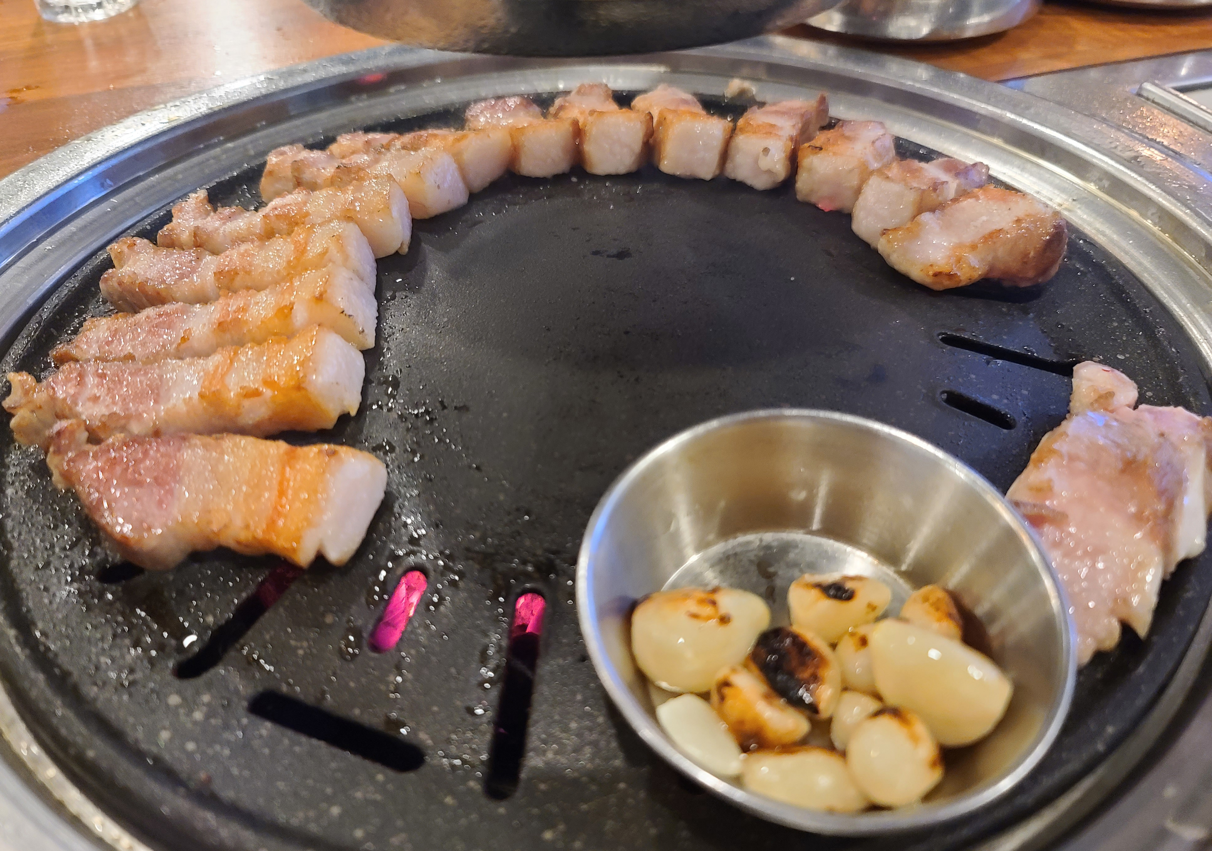 통목살만 먹기엔 조금 아쉬움이 있어서, 통삼겹살도 주문했습니다. 통삼겹살을 구울 때는 마늘을 같이 구웠습니다. 이번에도 역시 직원이 직접 구워주었고, 덕분에 두 손이 자유로워진 저는 열심히 포스팅을 할 사진을 찍었죠. 삼겹살도 겉바속촉 맛있었지만, 아무래도 이런 가게에서는 목살을 먹는 게 더 맛있는 것 같습니다.