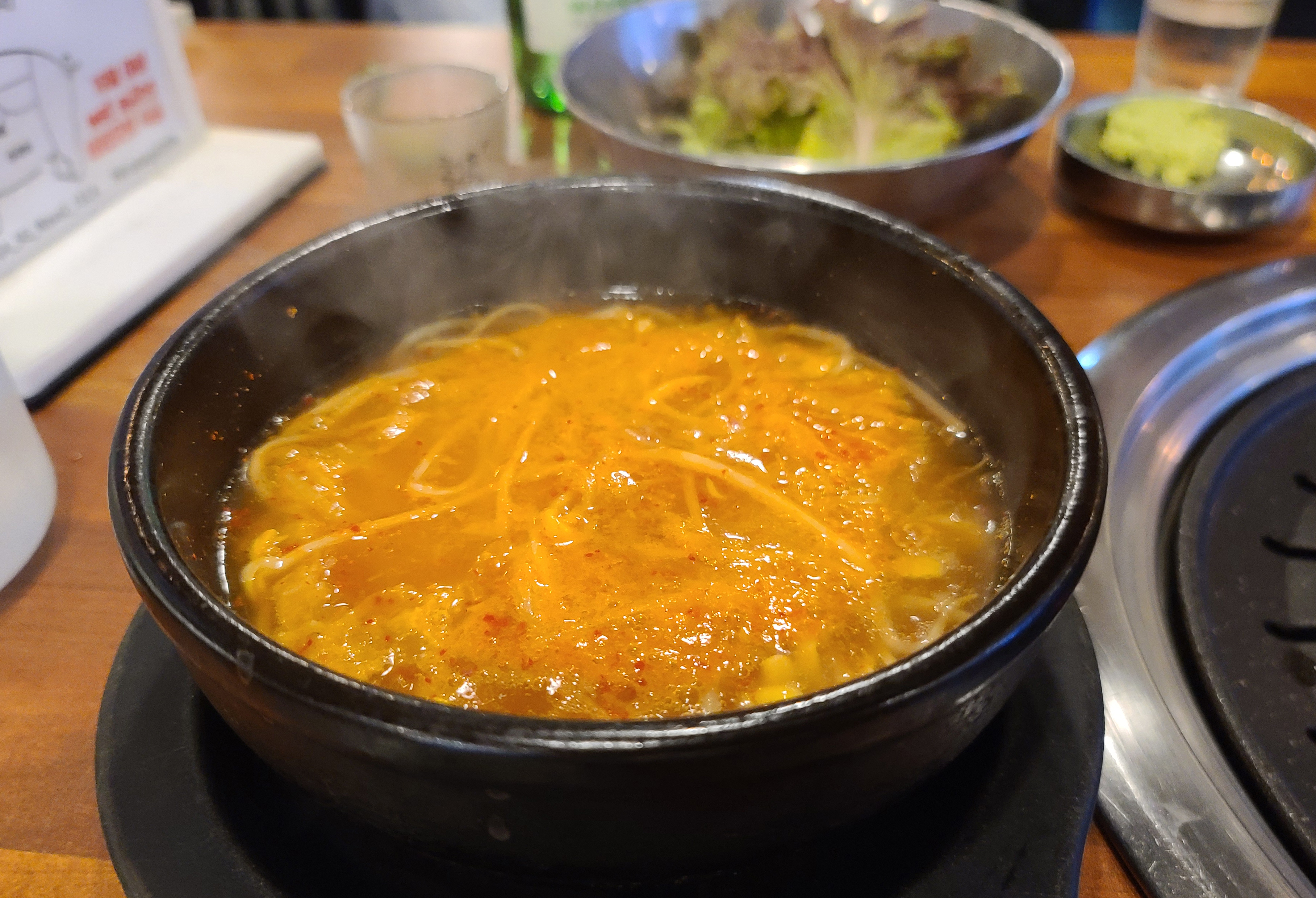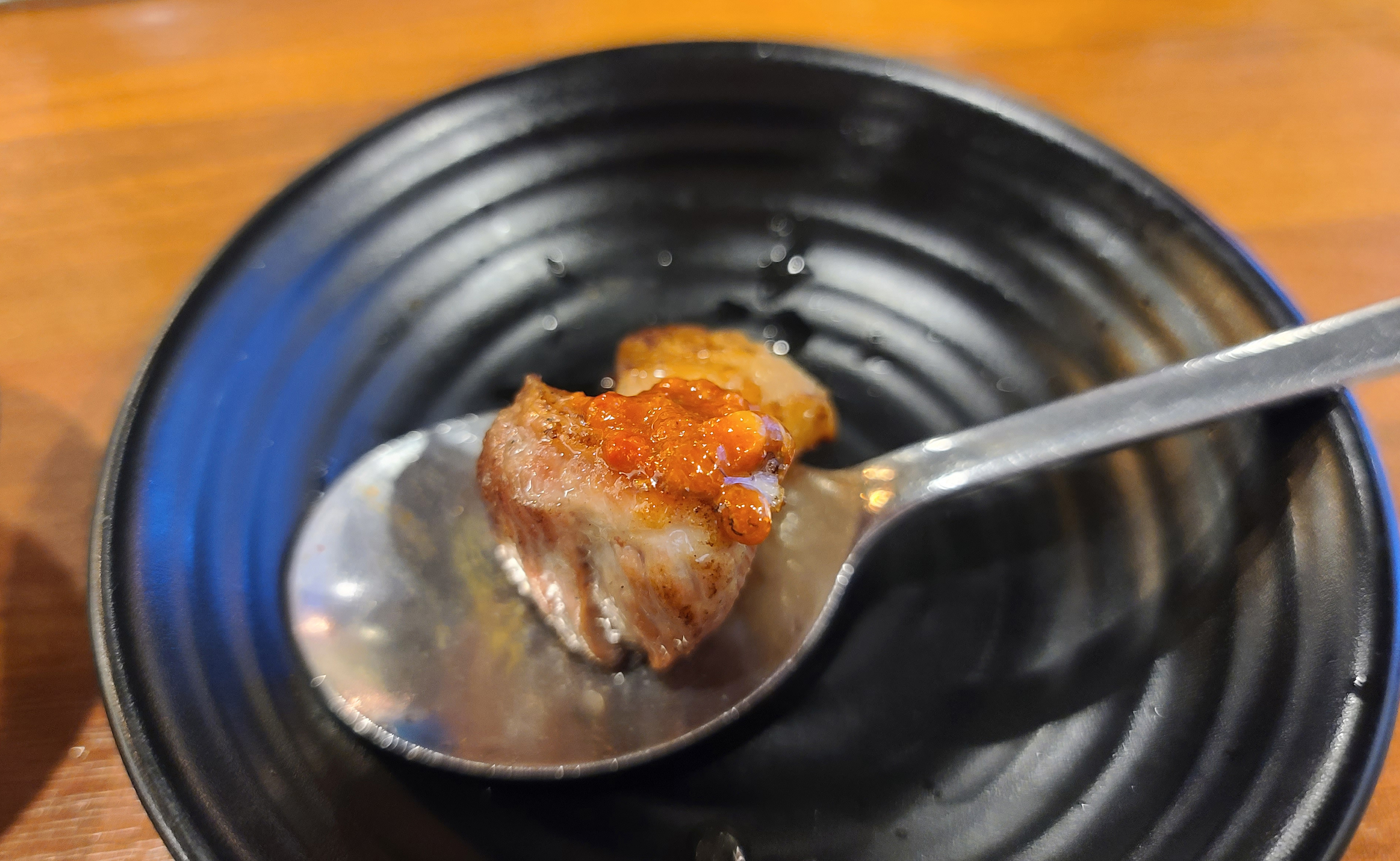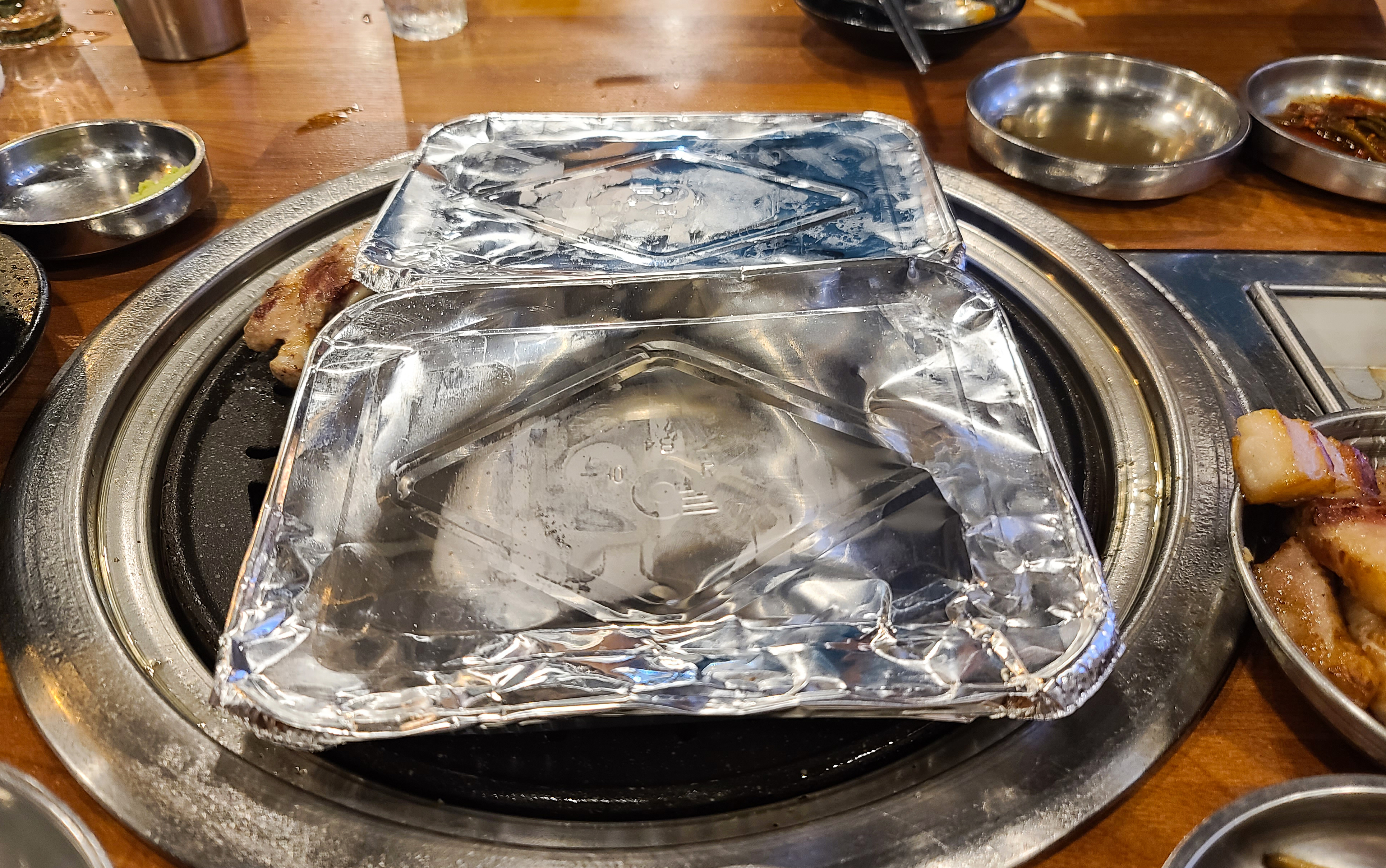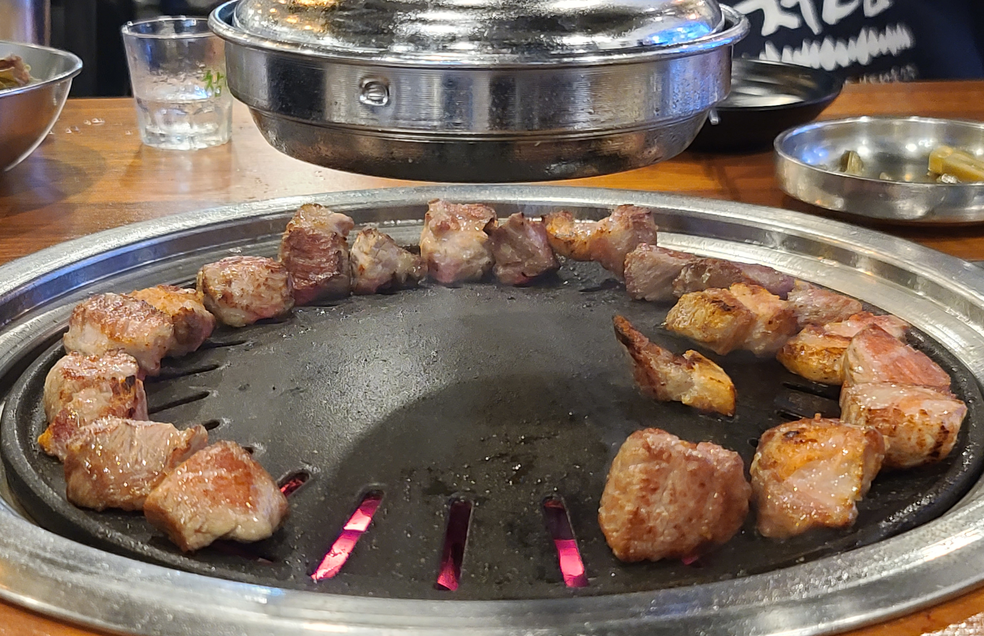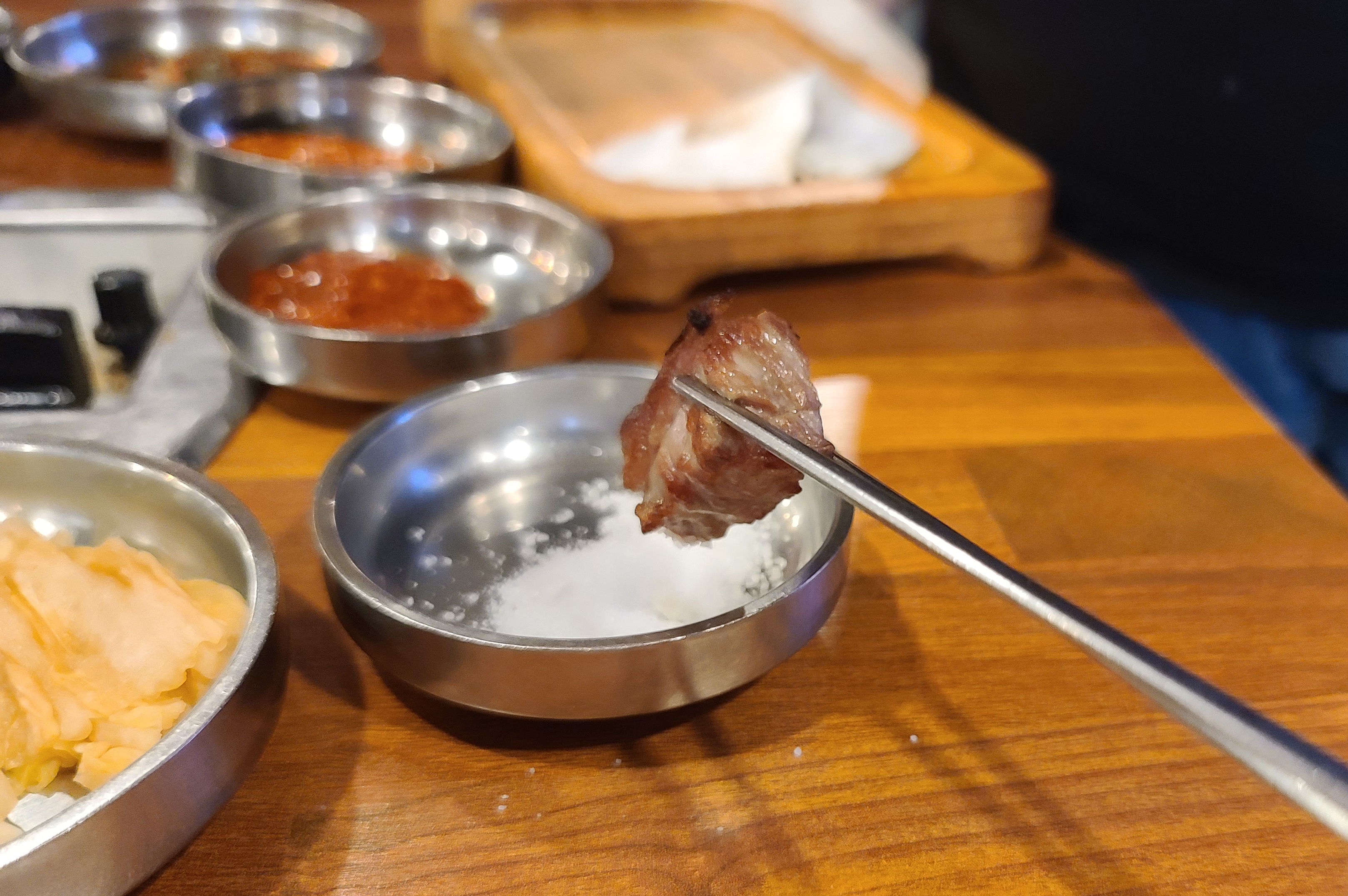 직원분은 고기가 어느 정도 익었을 때, 고기 한 점씩 맛보라고 접시에 덜어주시더라고요. 먼저 소금에 찍어먹어 보라며 권하셨고 그밖에 고기들은 접시에 덜어내어 불판 가장자리로 옮겨주었습니다. 나머지 고기들은 개인의 취향에 따라 고추냉이를 곁들이기도 하고, 쌈장이나, 젓갈, 명이나물 등과 곁들여 먹었습니다.