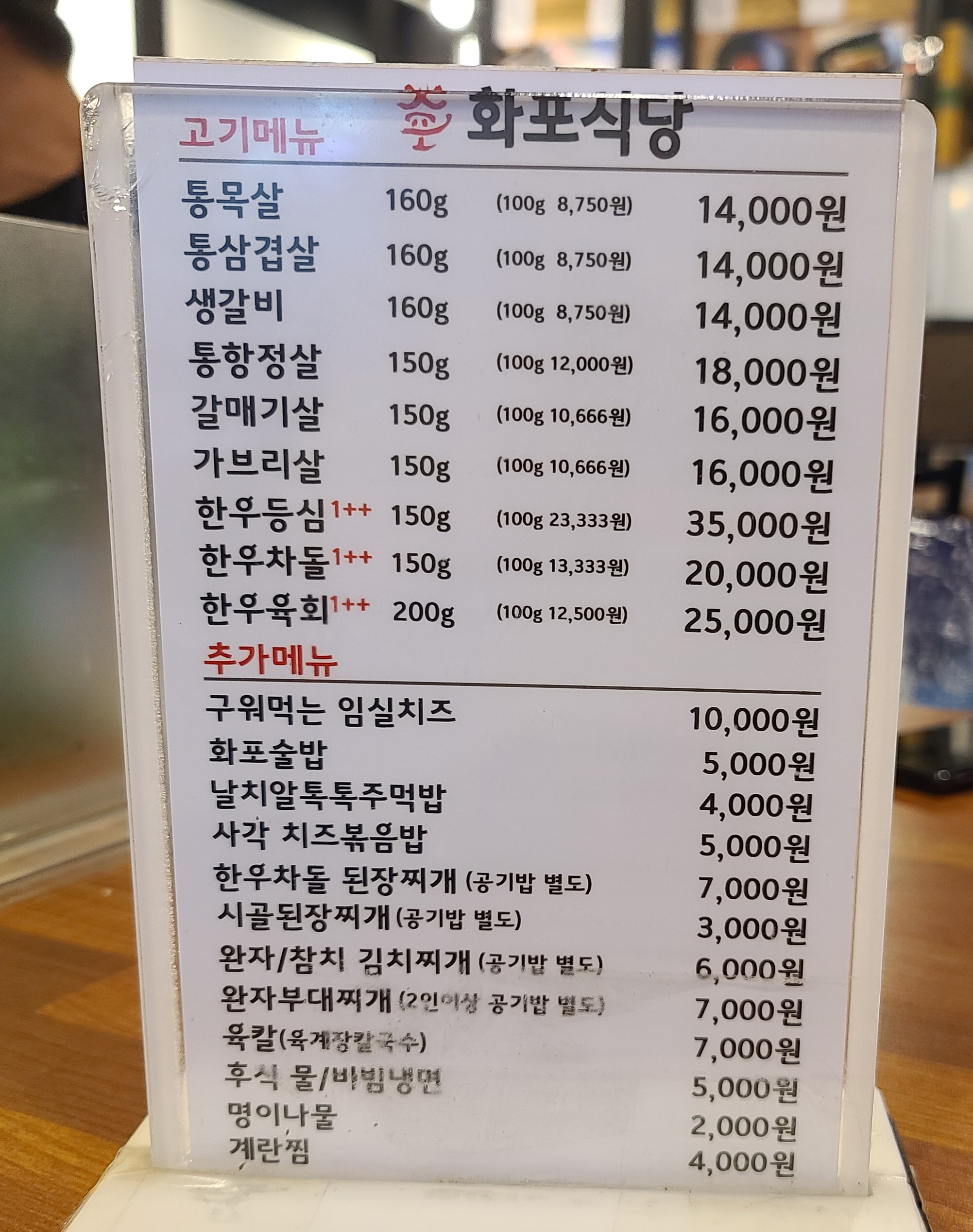 가락시장 화포식당의 메뉴는 위와 같습니다. 통목살, 통삼겹살, 생갈비, 통항정살, 갈매기살, 가브리살, 한우등심, 한우차돌, 한우육회, 구워먹는임실치즈, 화포술밥, 날치알톡톡주먹밥, 사각치즈볶음밥, 한우차돌된장찌개, 사골된장찌개, 완자/참치김치찌개, 완자부대찌개, 육칼, 후식냉면 등 이 있었습니다. 저는 지인의 추천대로 우선 통목살 부터 주문했습니다.